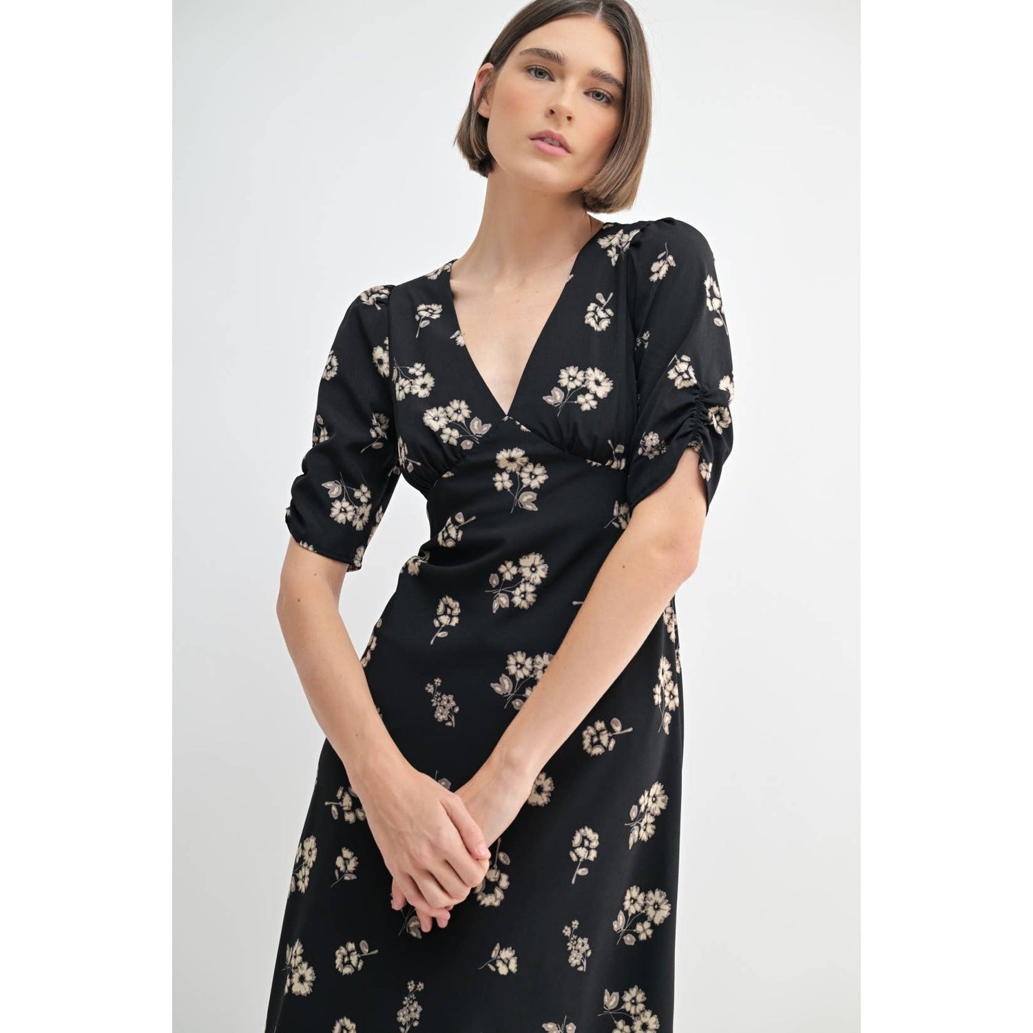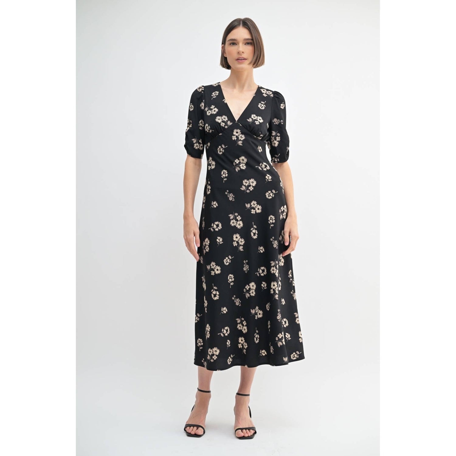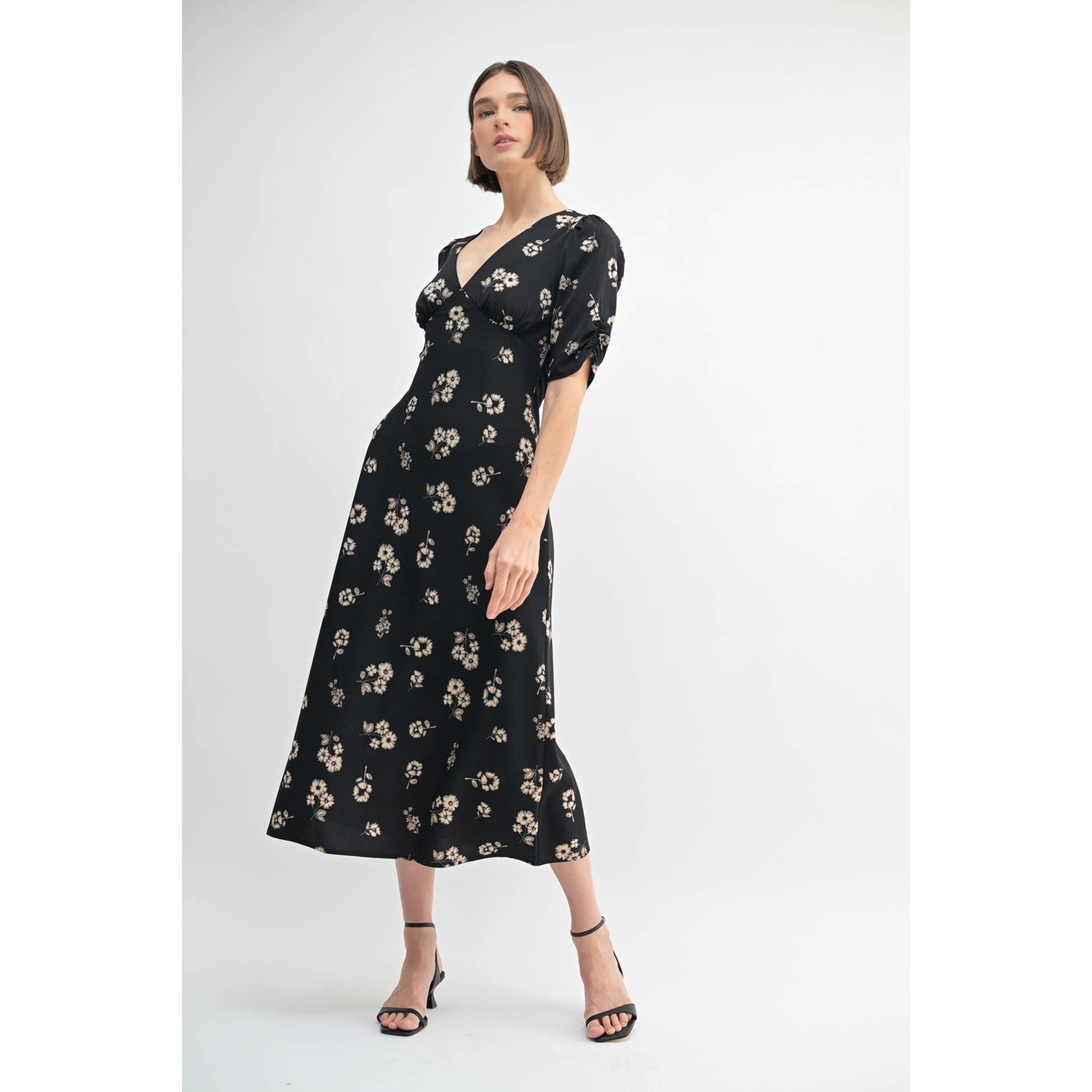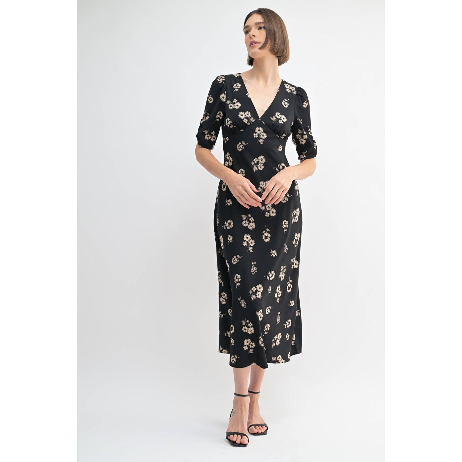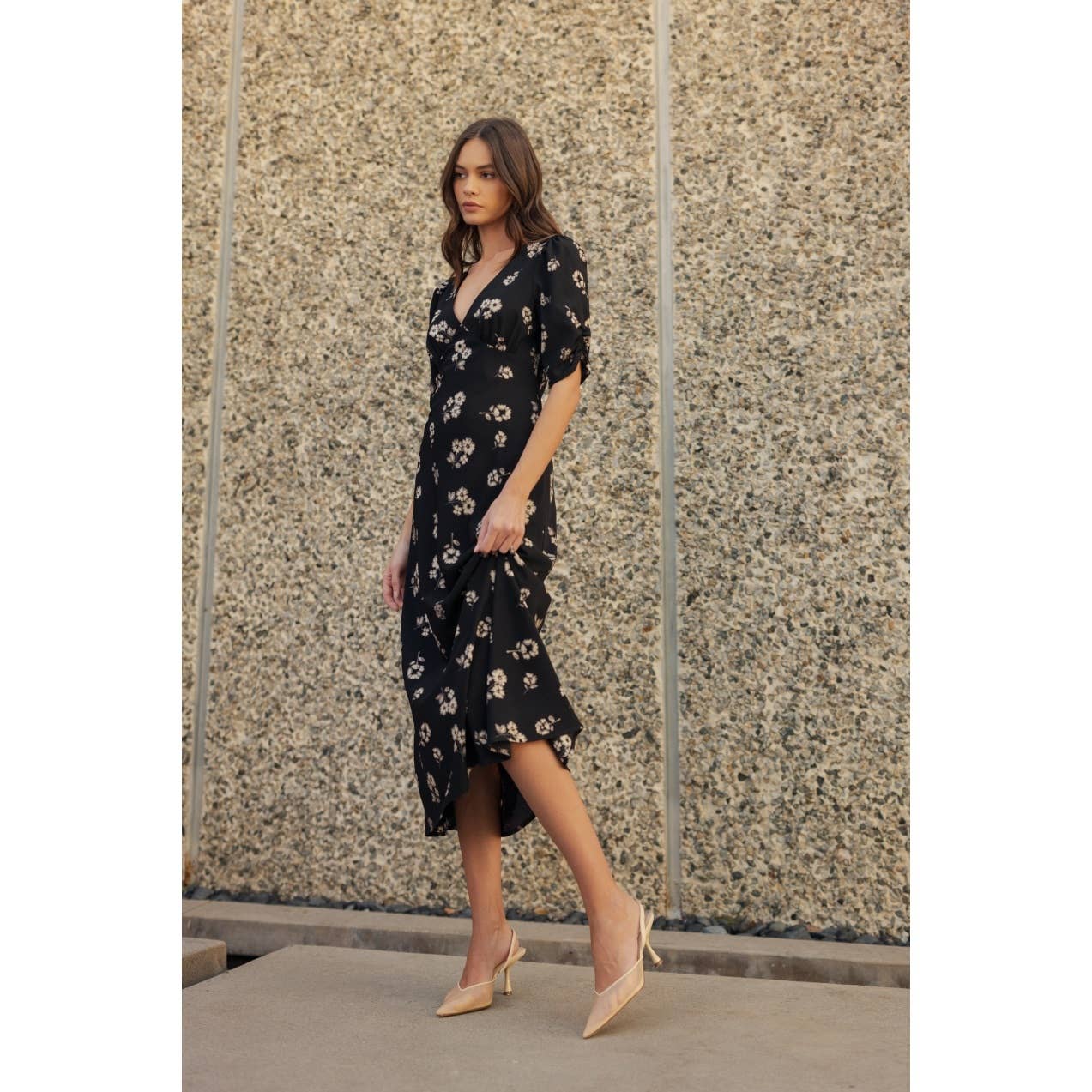 FLOWER PRINT V NECK MIDI DRESS: Black / FD68112_1