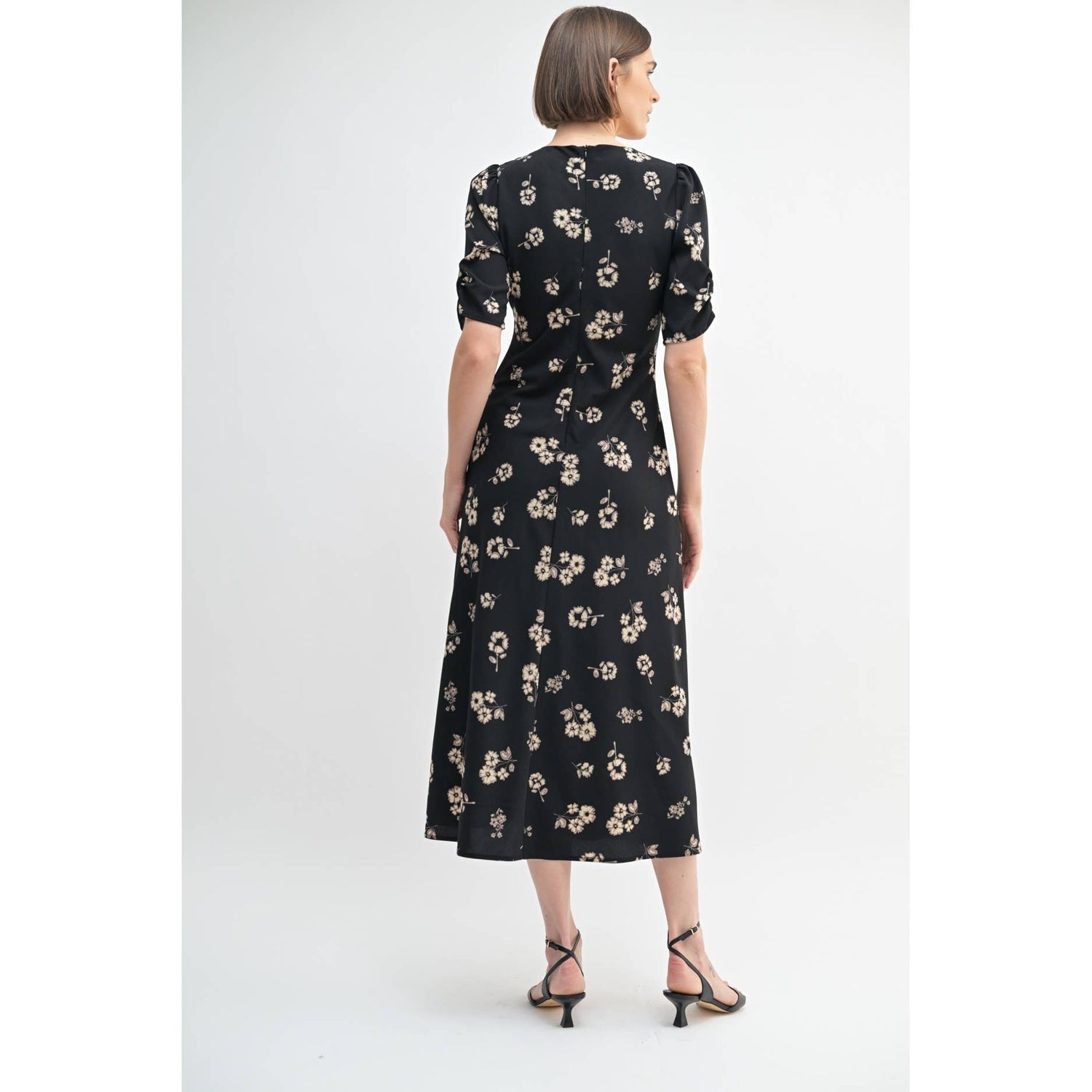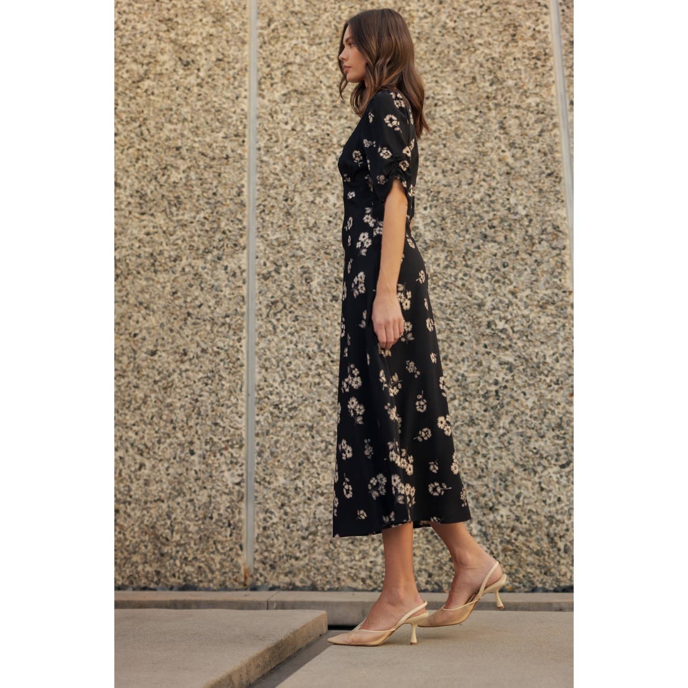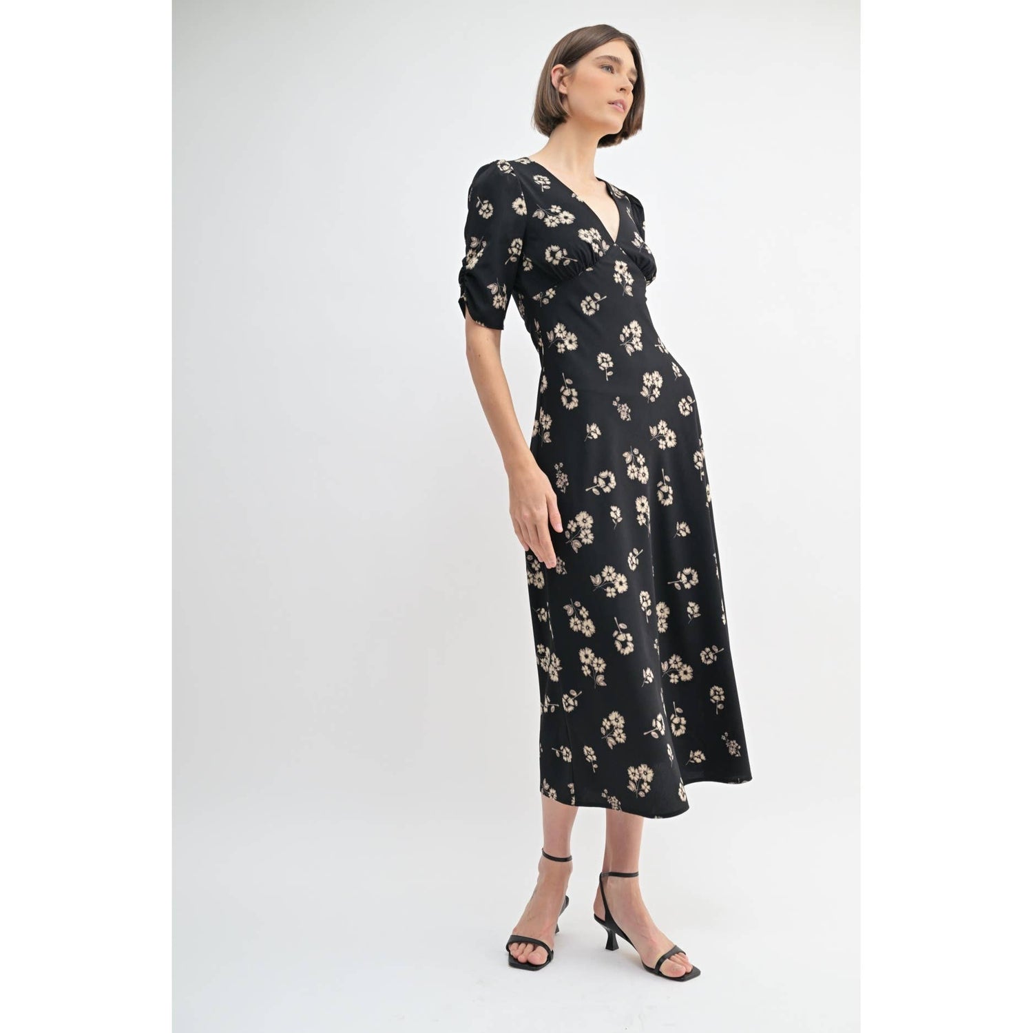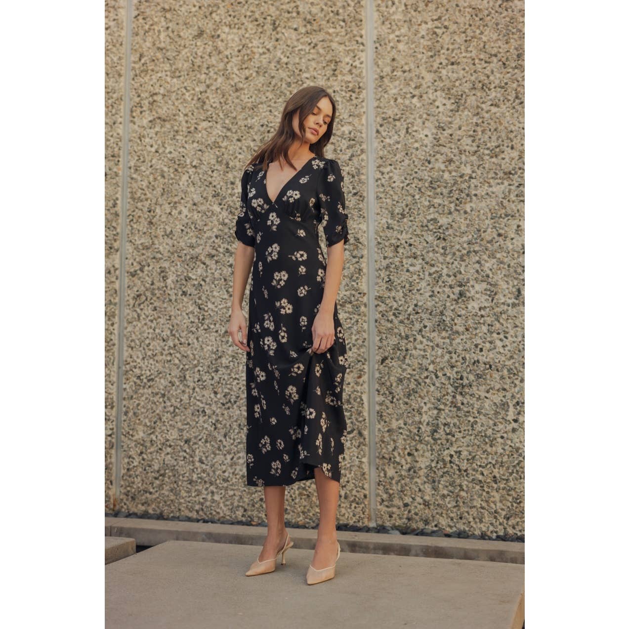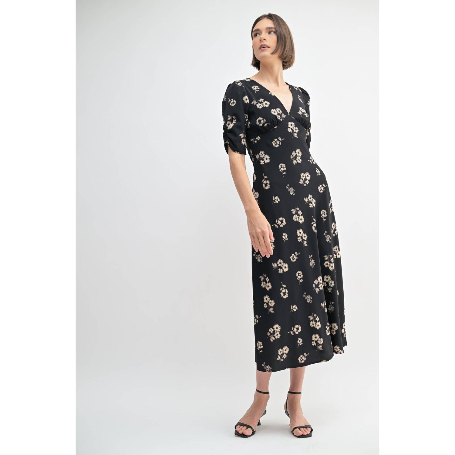 FLOWER PRINT V NECK MIDI DRESS: Black / FD68112_1
