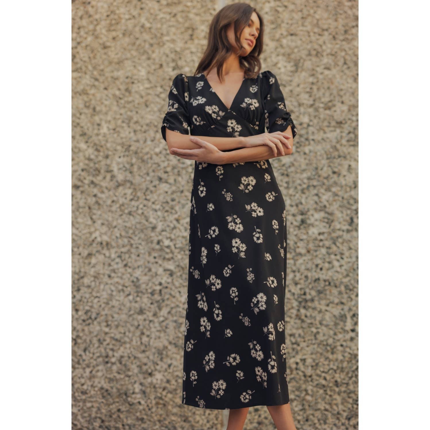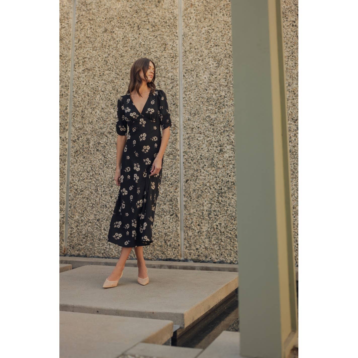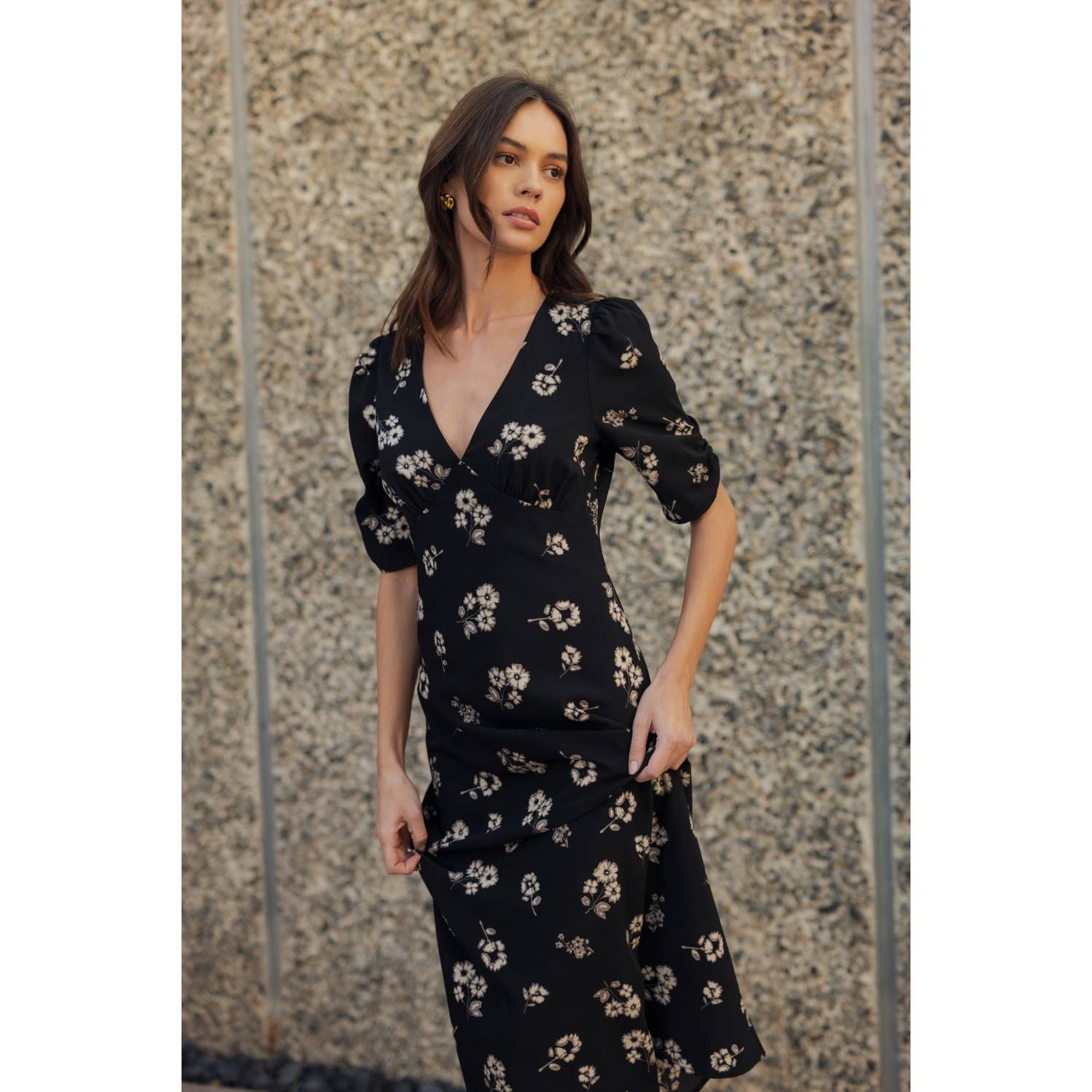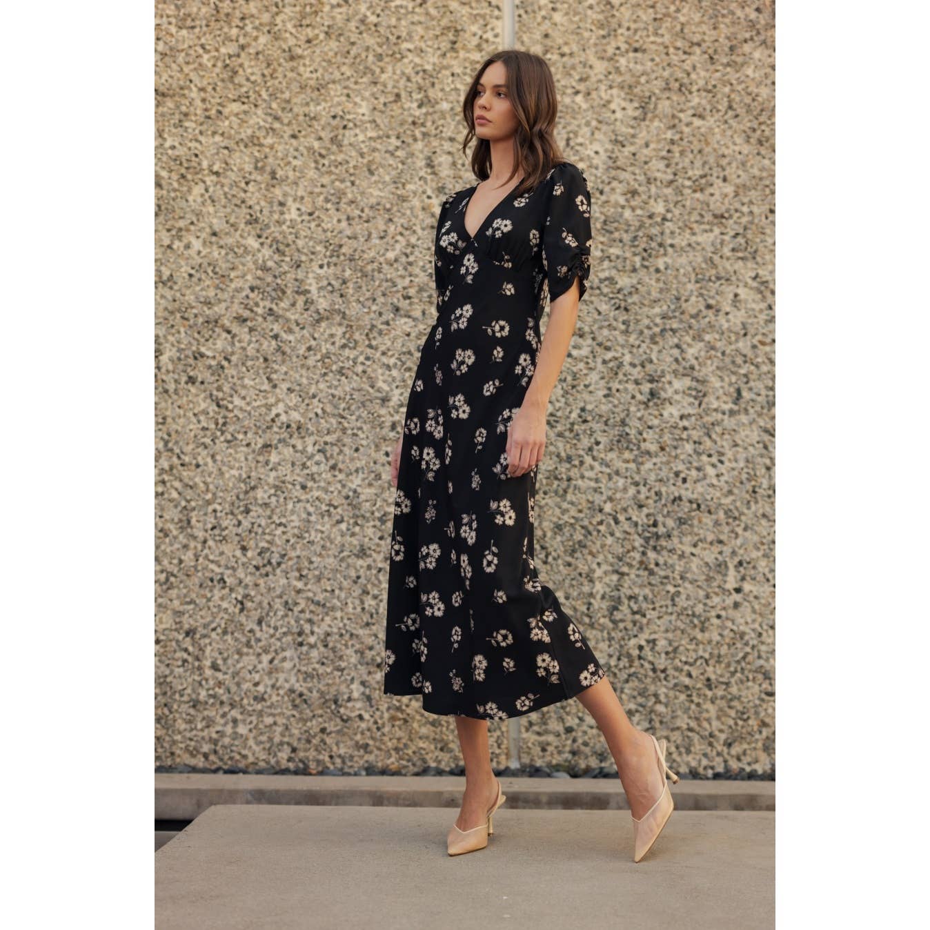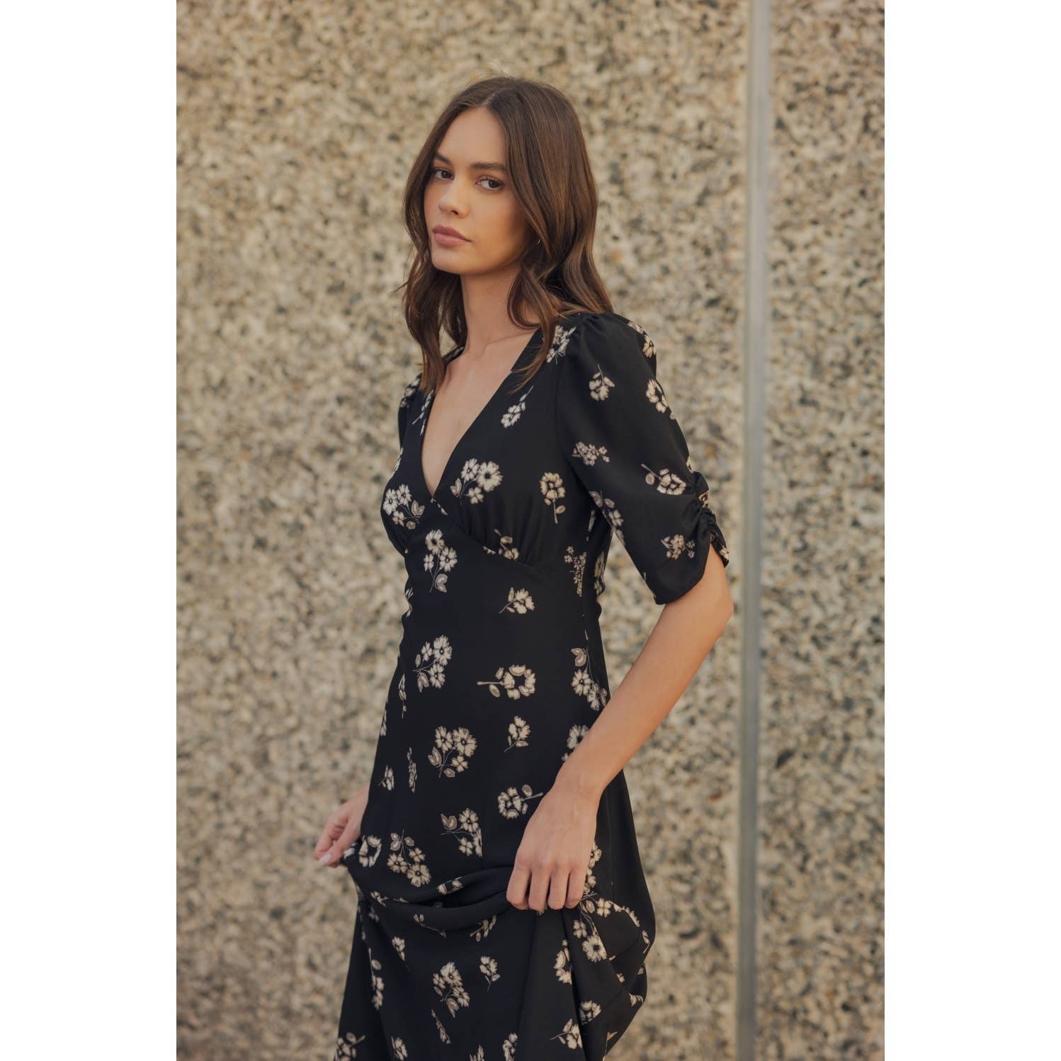 FLOWER PRINT V NECK MIDI DRESS: Black / FD68112_1