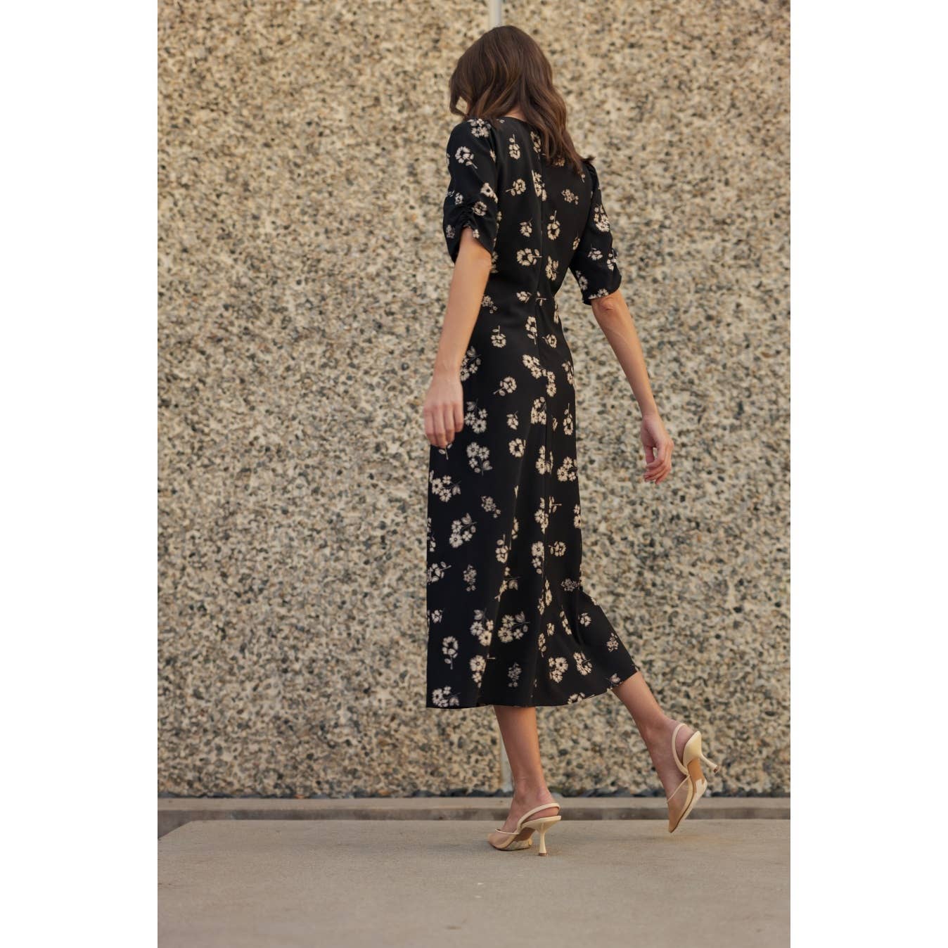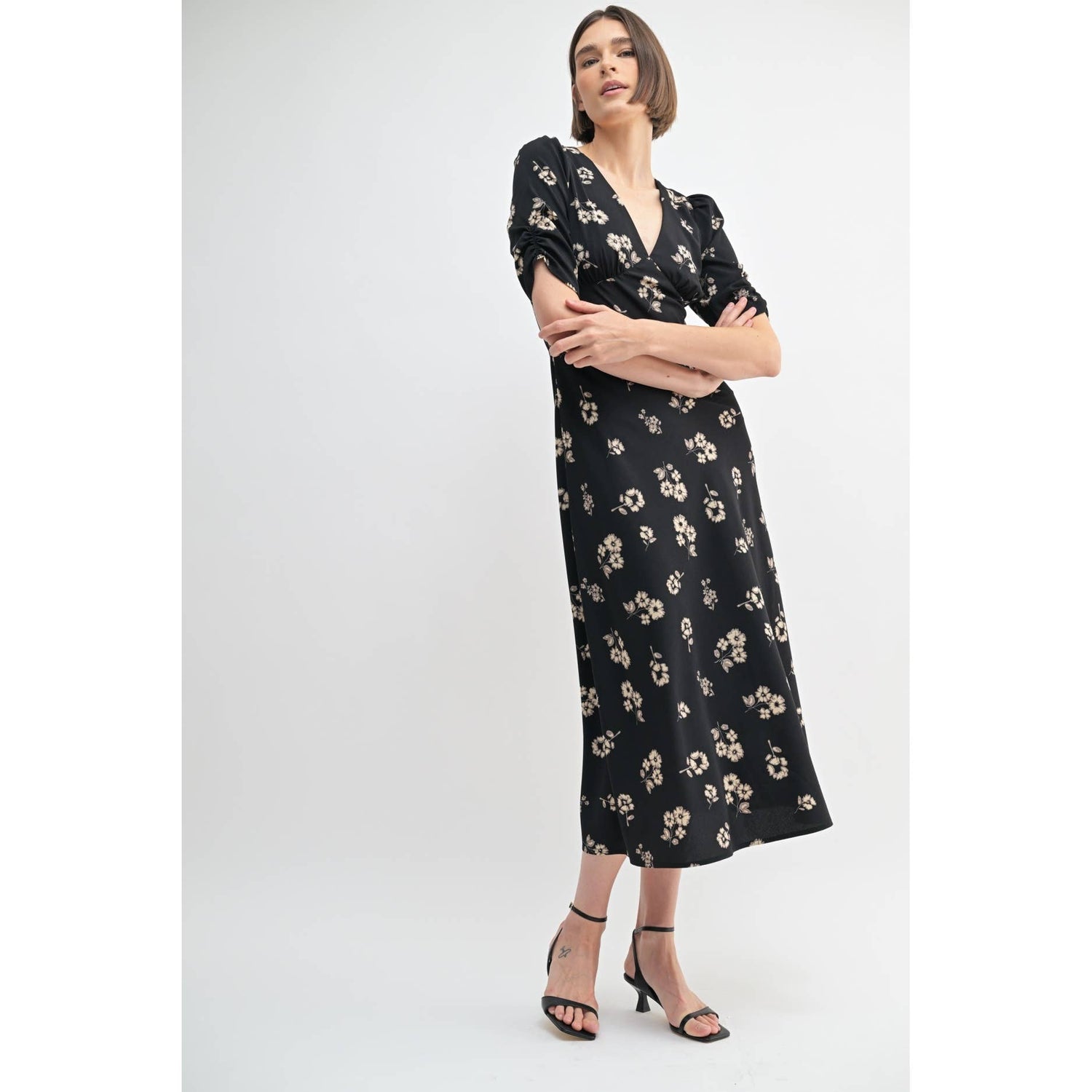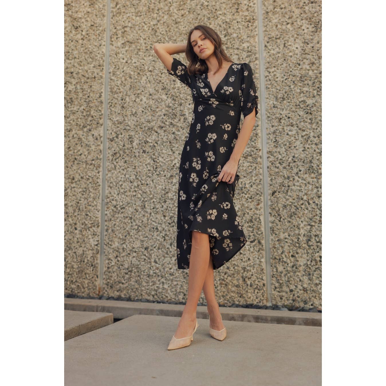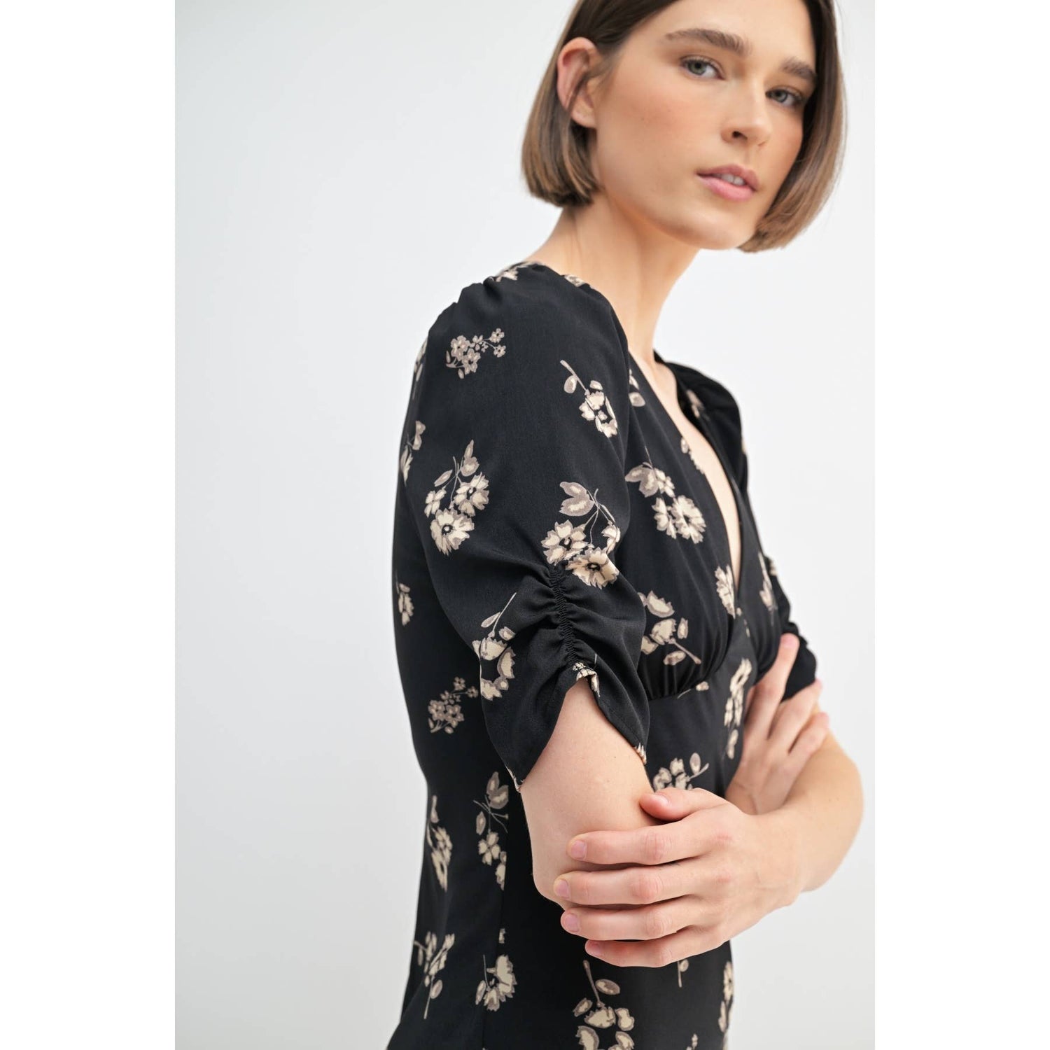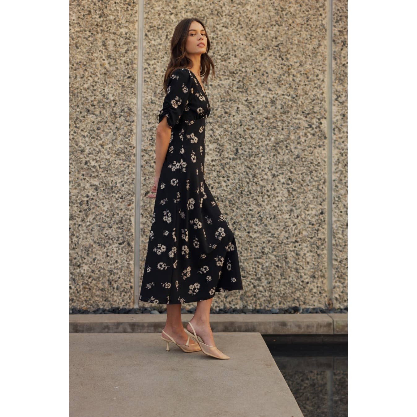 FLOWER PRINT V NECK MIDI DRESS: Black / FD68112_1