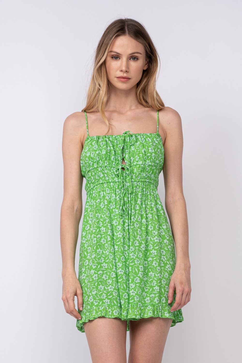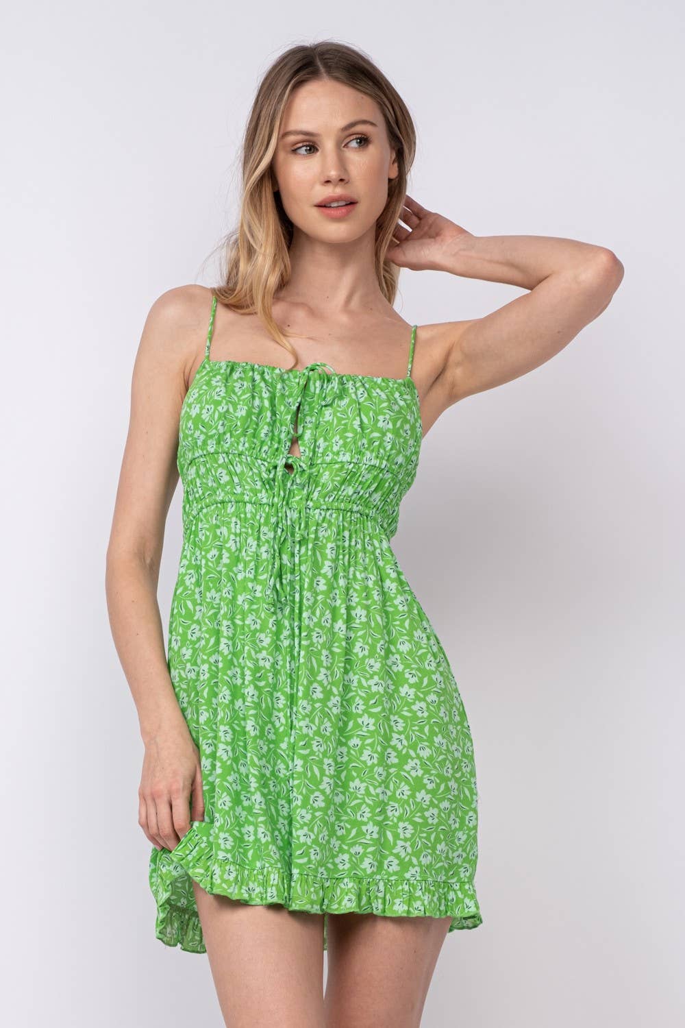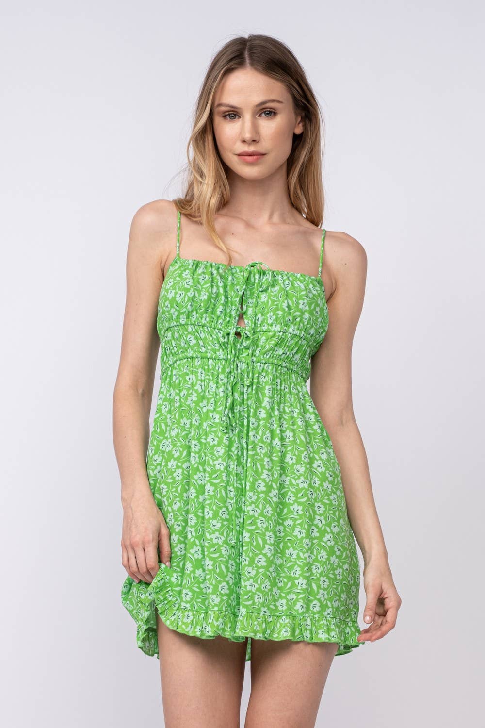 FRONT DOUBLE-TIE STRAP RUFFLE TRIM MINI DRESS: Green Fact / SM-D20405A