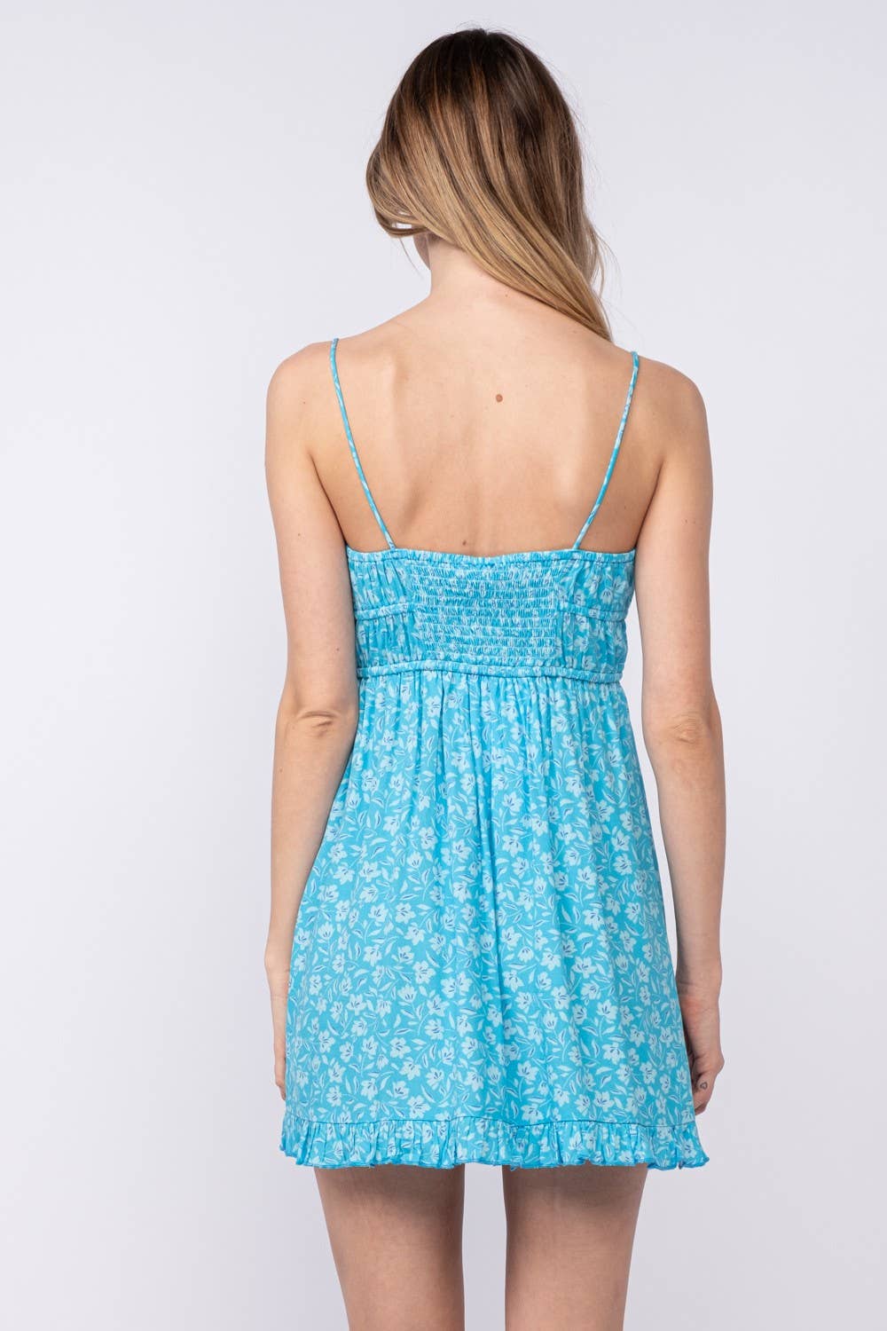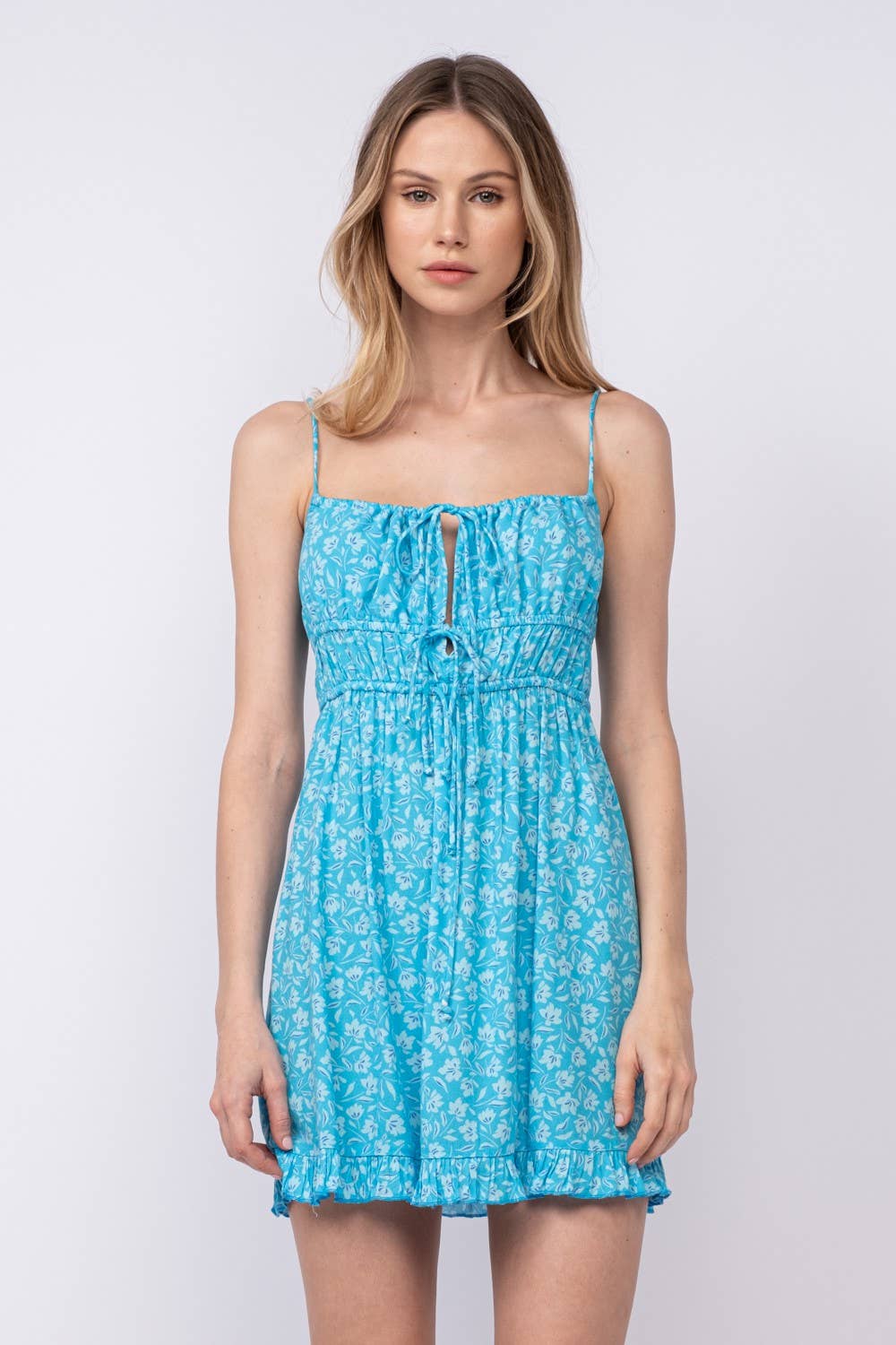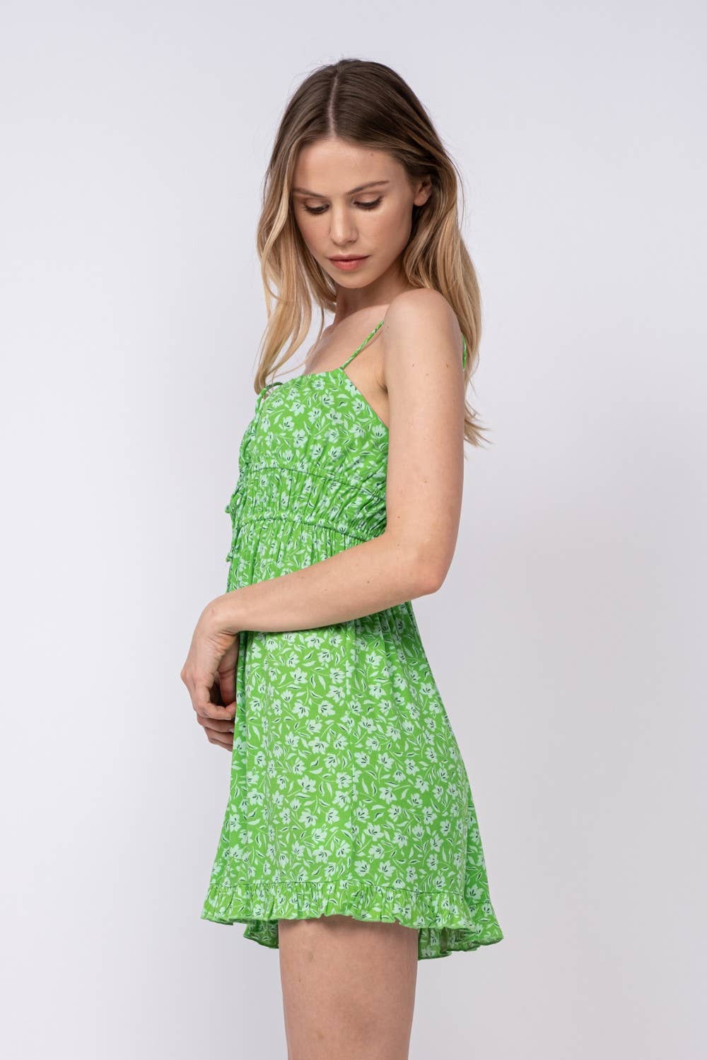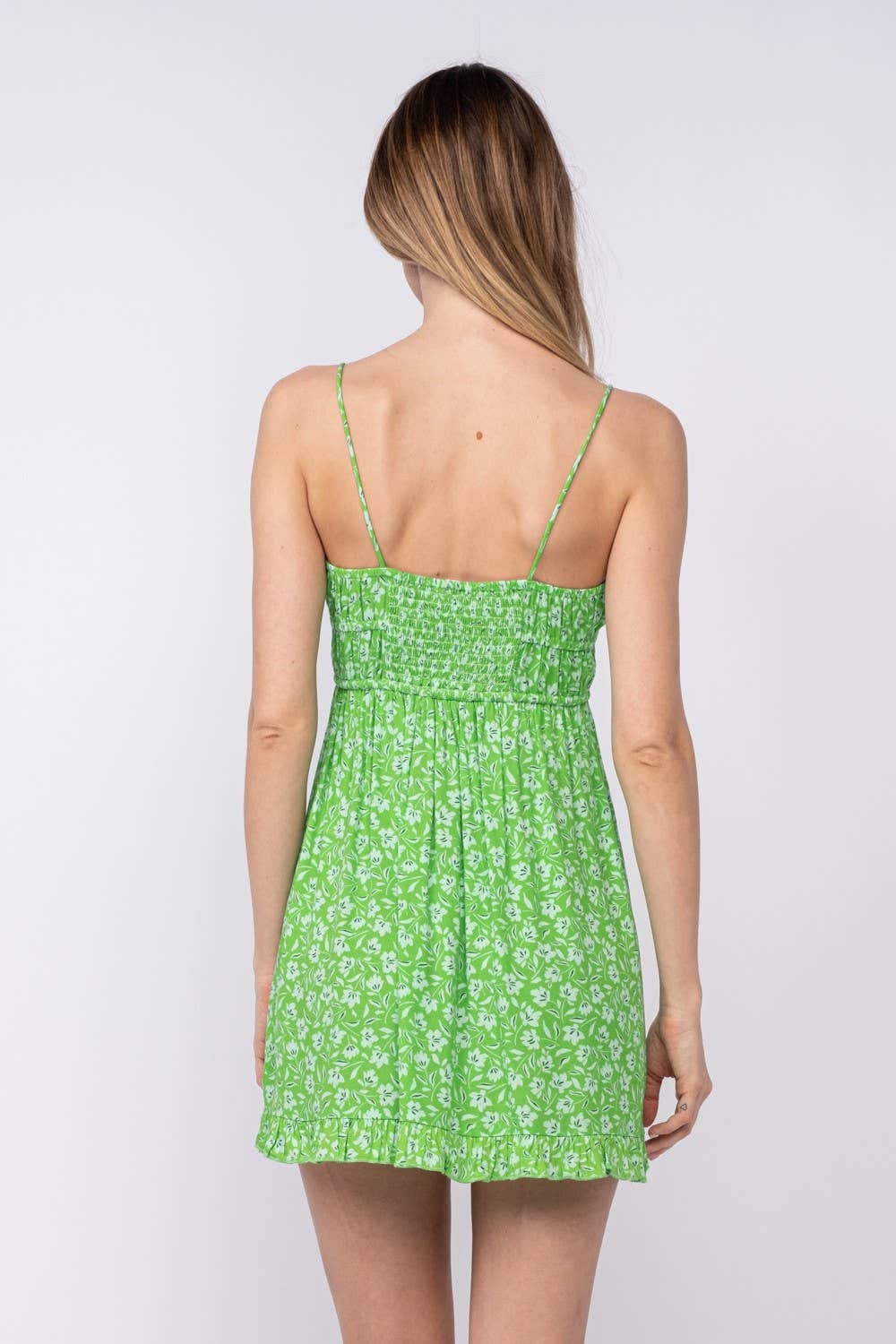 FRONT DOUBLE-TIE STRAP RUFFLE TRIM MINI DRESS: Green Fact / SM-D20405A