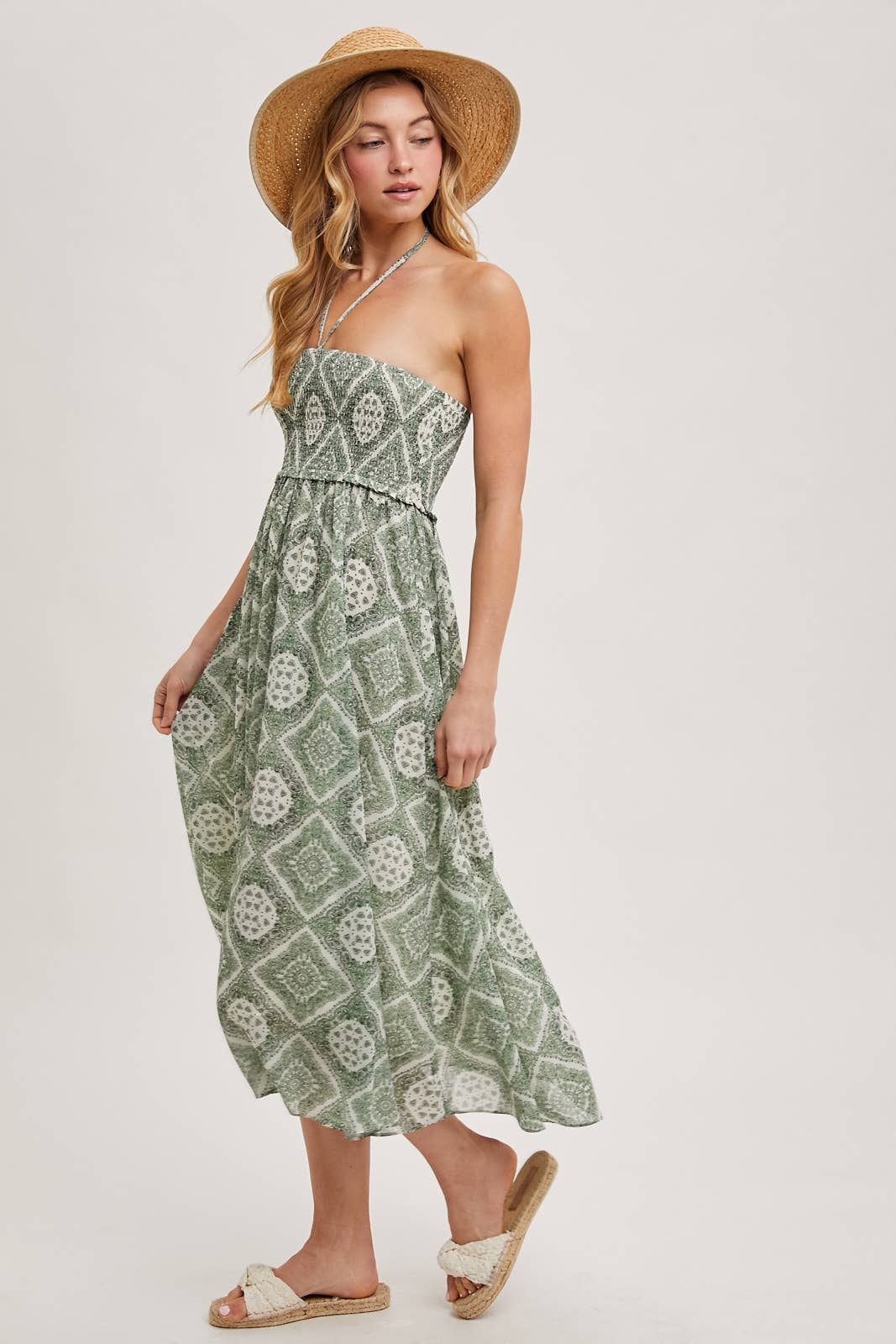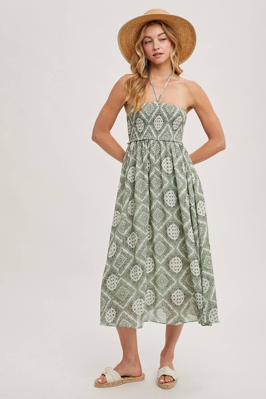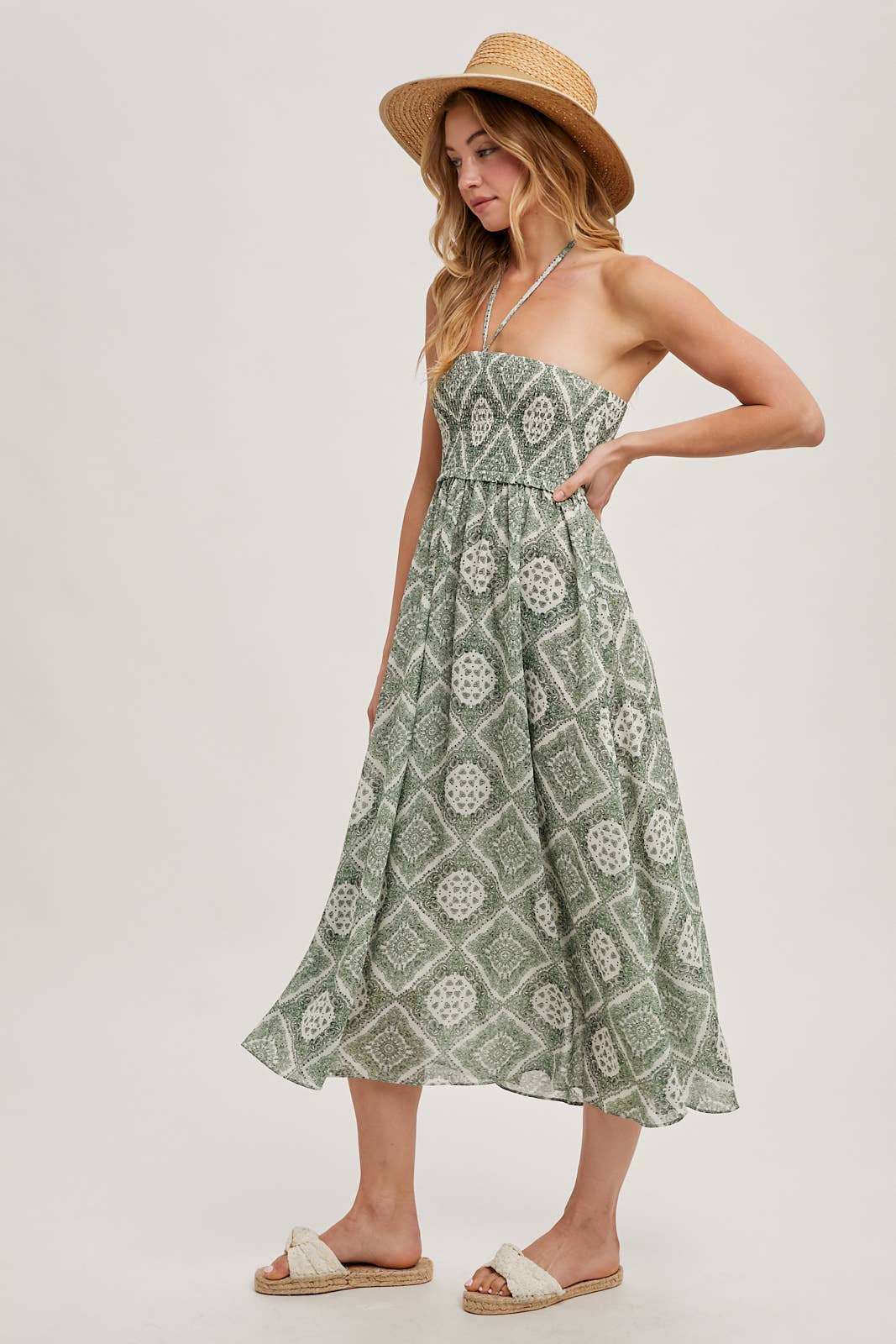 GEO PRINT SMOCKED HALTER DRESS: Green D02355