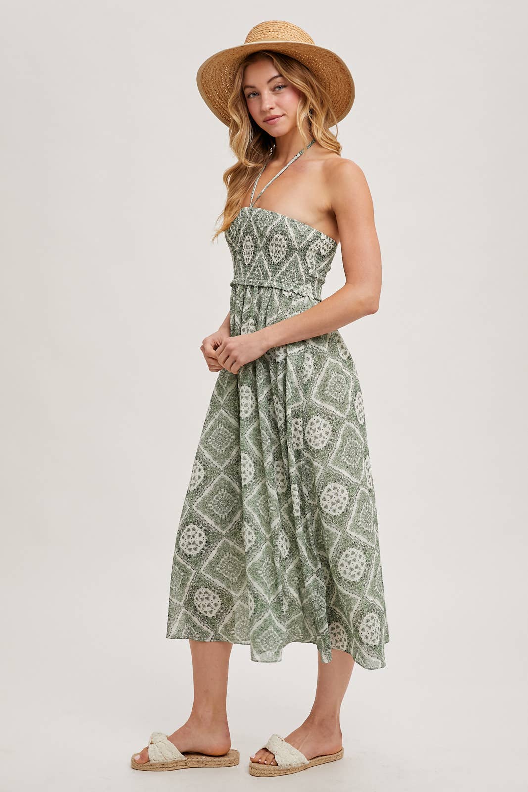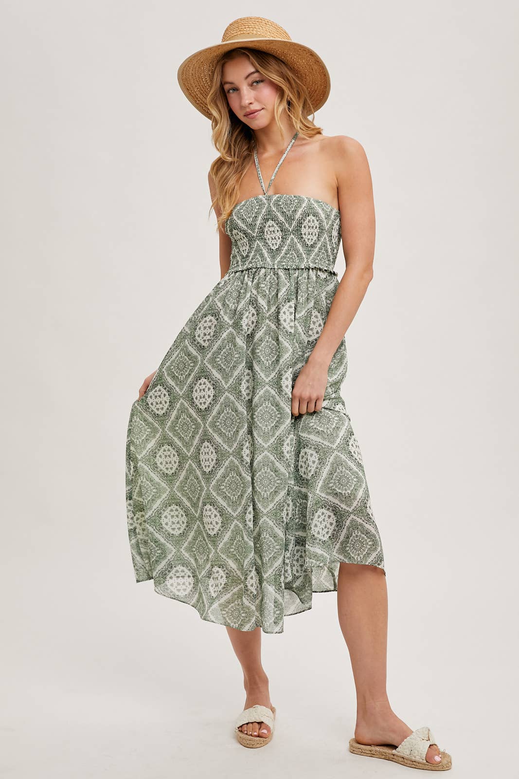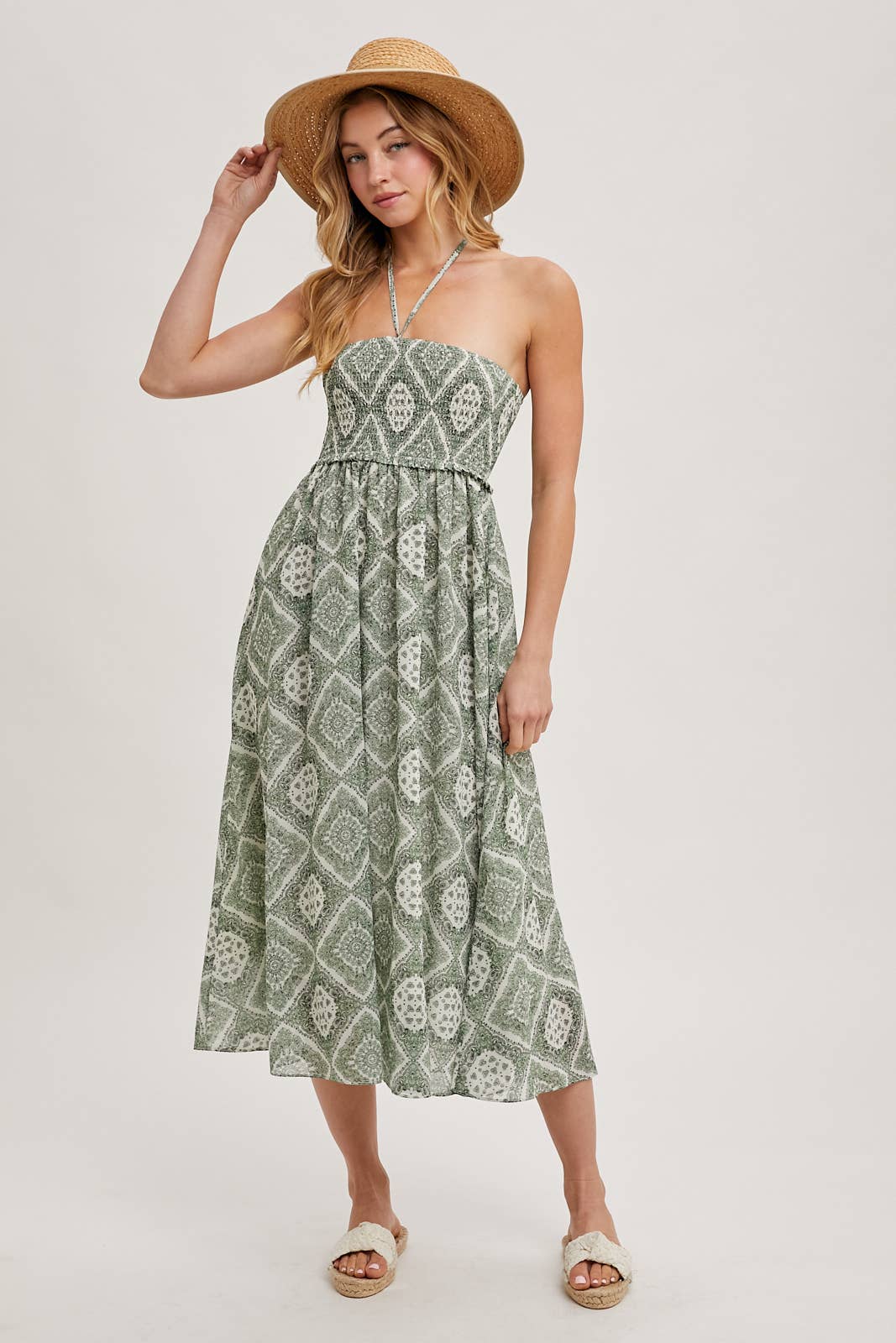 GEO PRINT SMOCKED HALTER DRESS: Green D02355