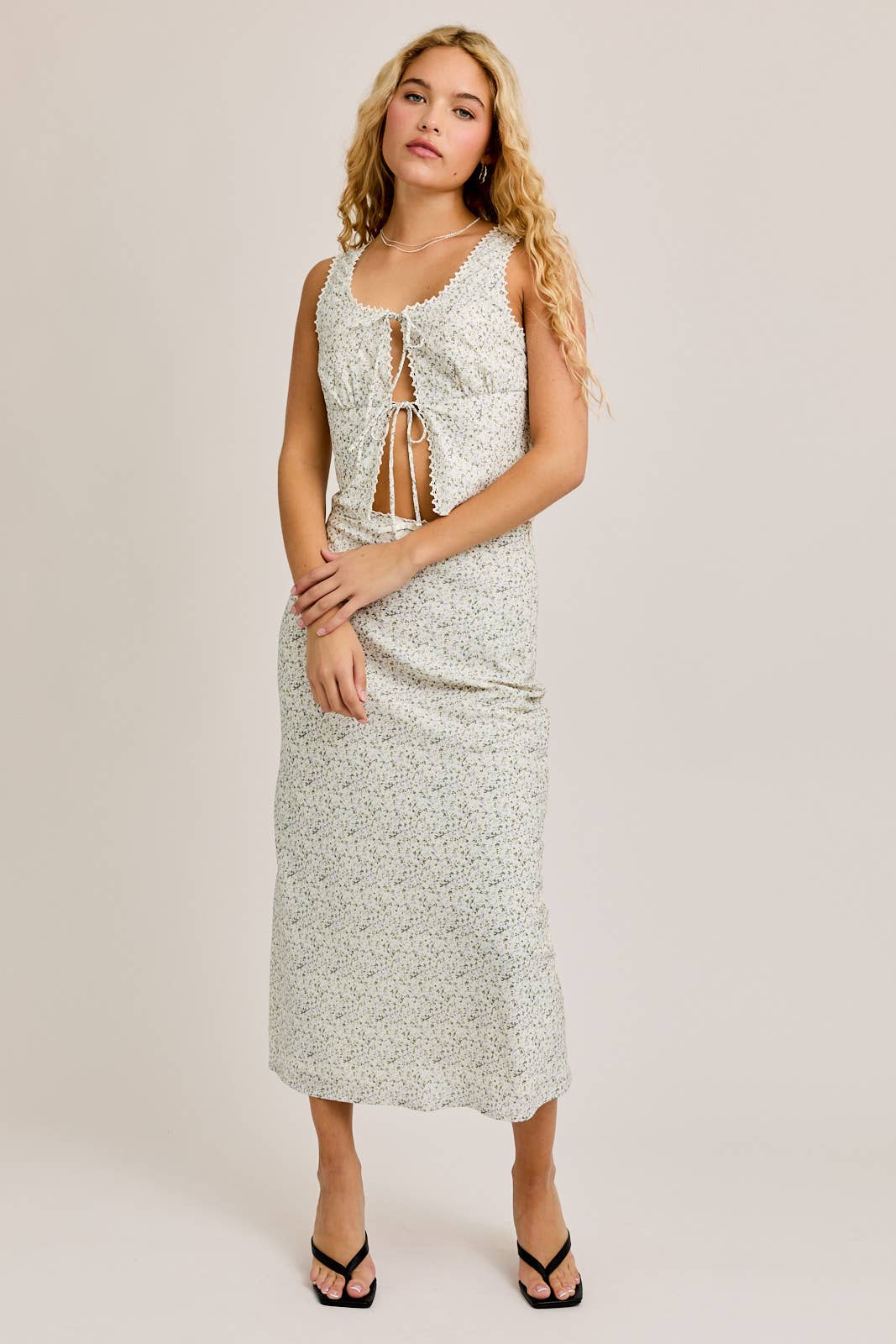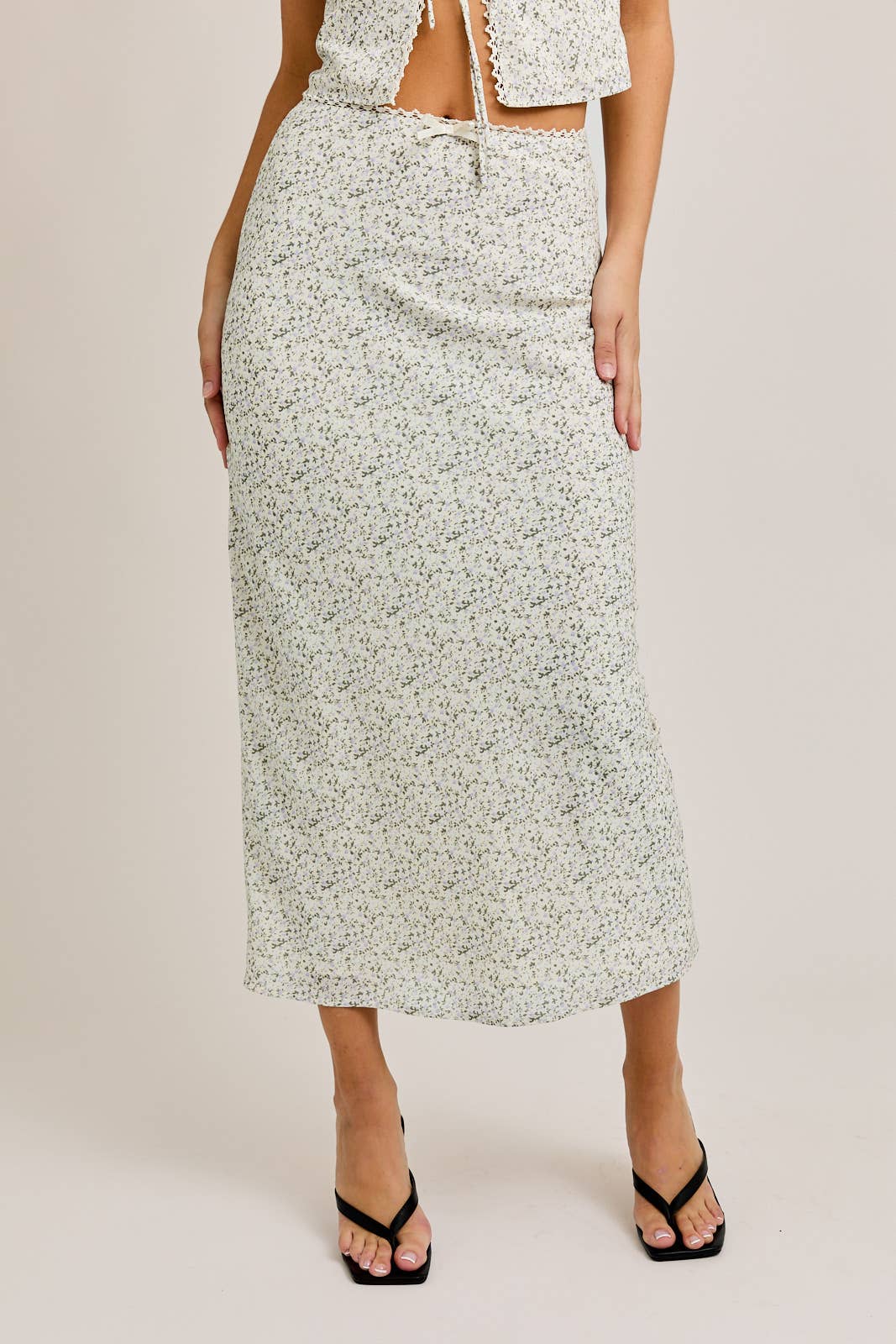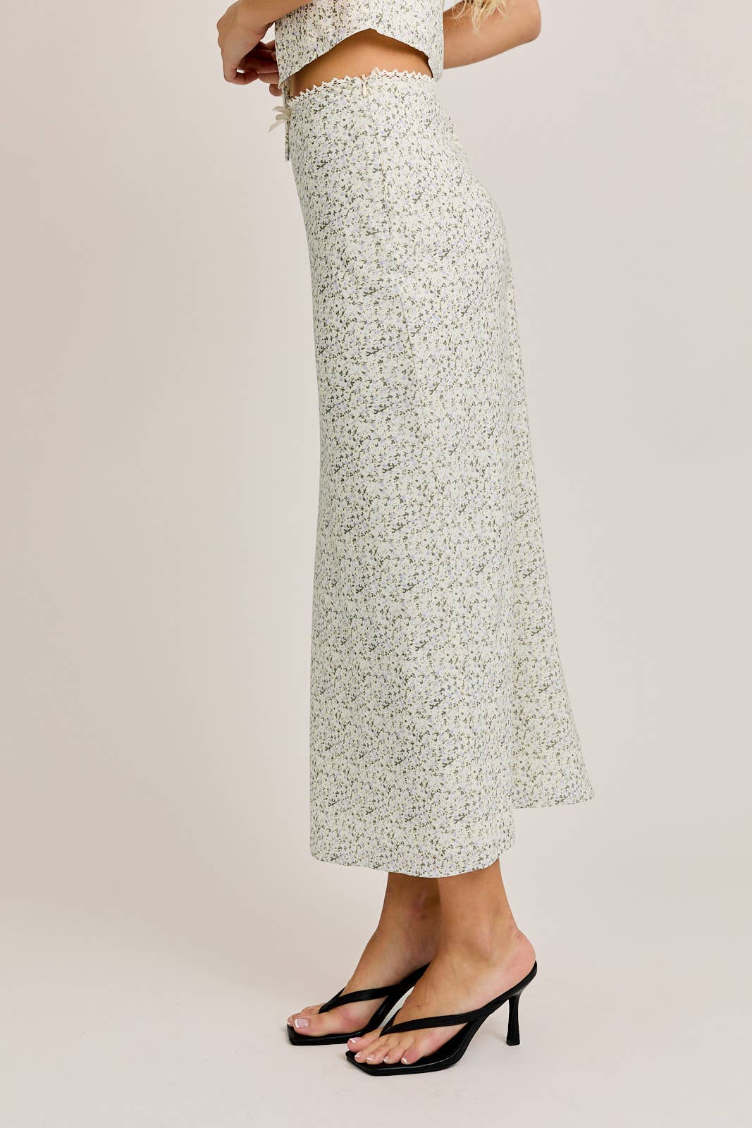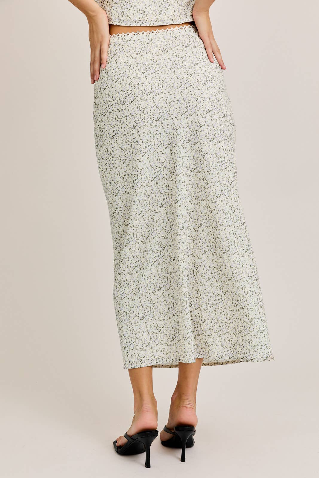 HIGH WAISTED LACE TRIM DETAIL FLORAL MAXI SKIRT: CREAM-LAVENDER DITSY / IS5162