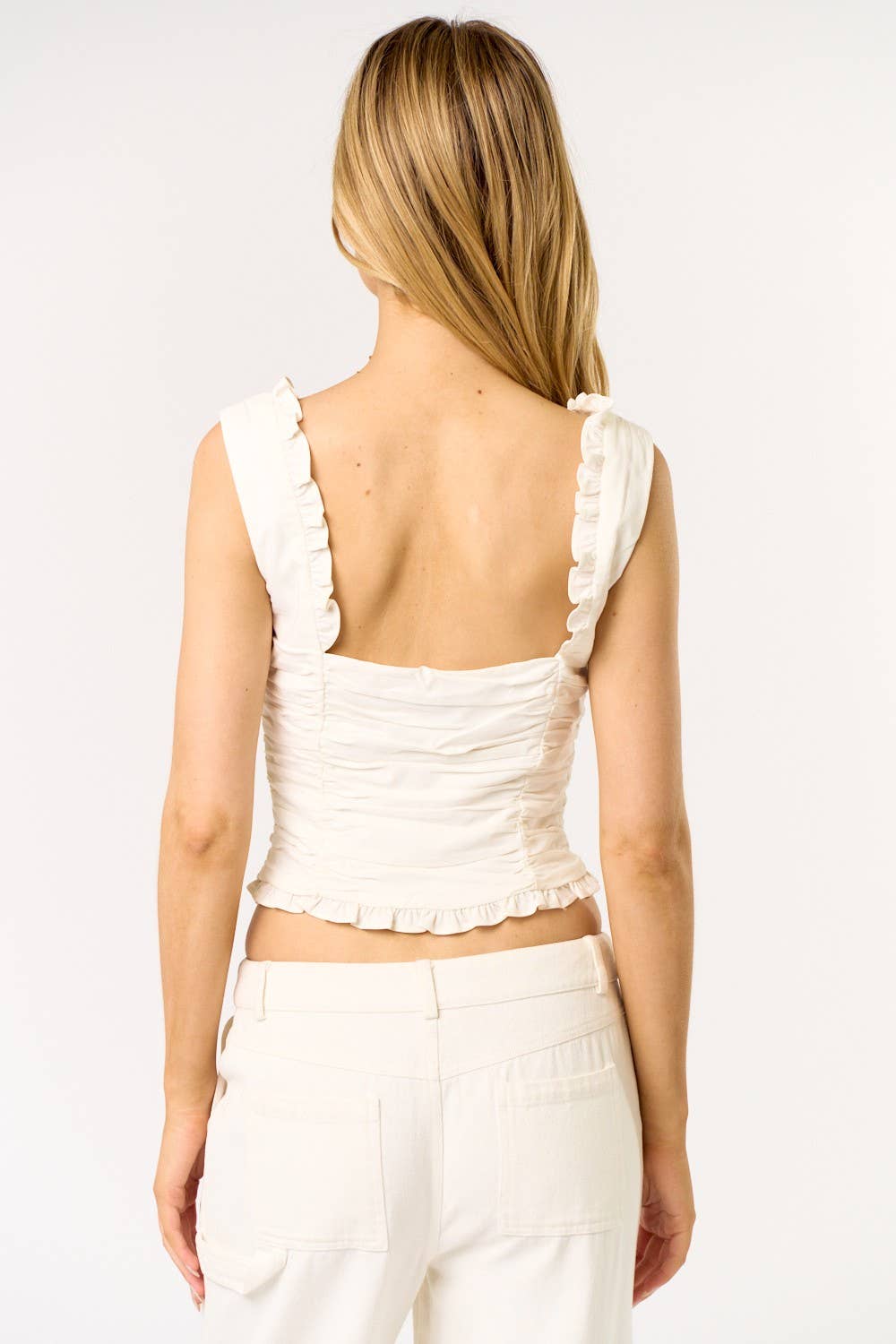 IBT33298 RUFFLE EDGE BUTTON FRONT RUCHED TANK TOP: OFF WHITE