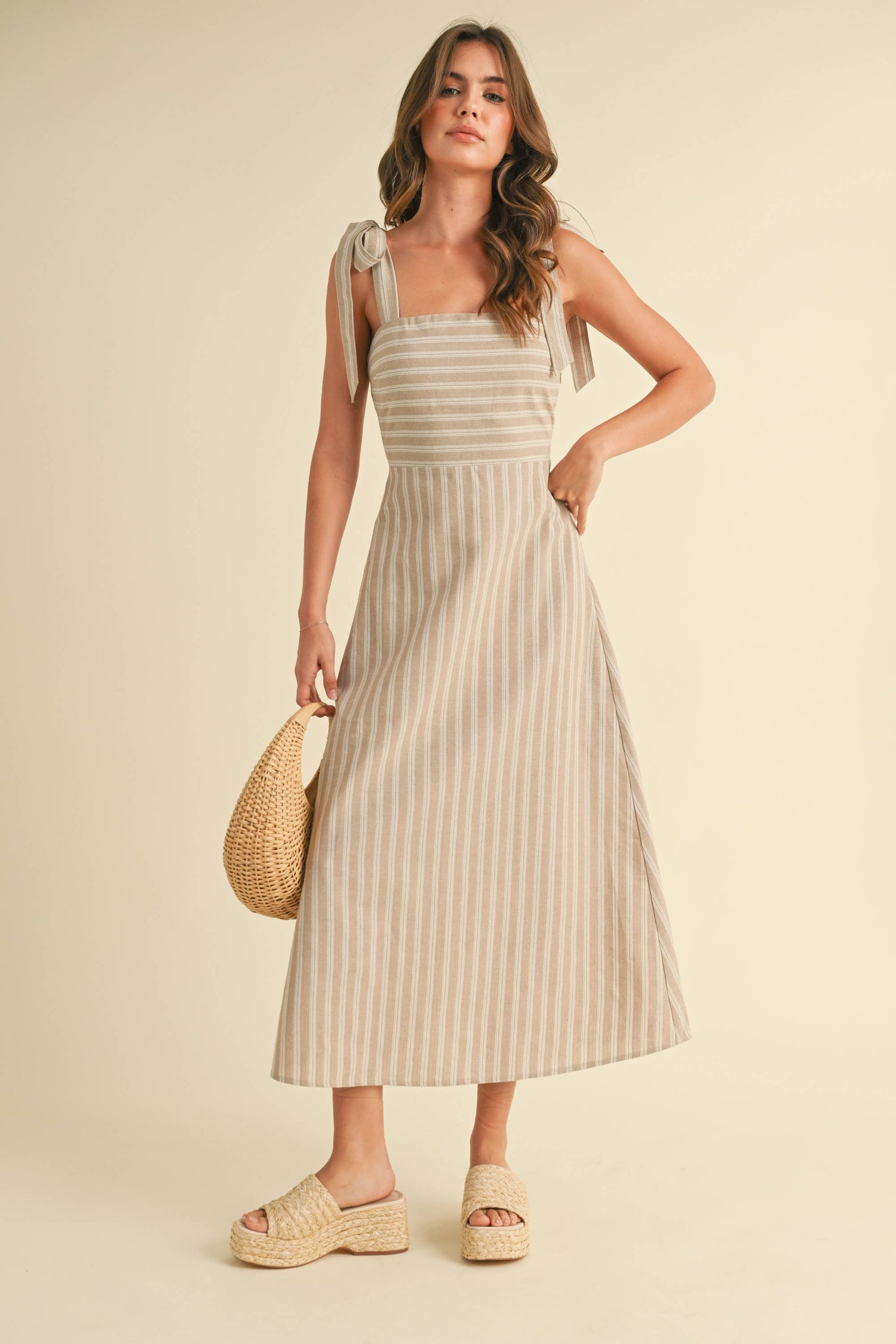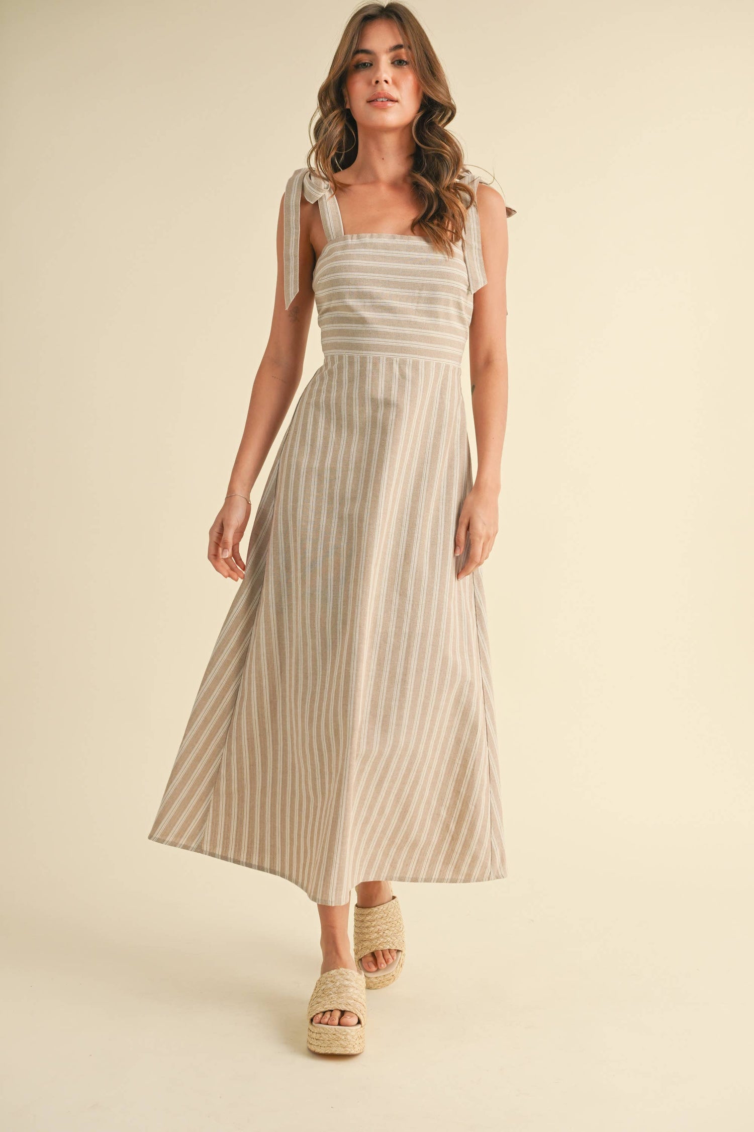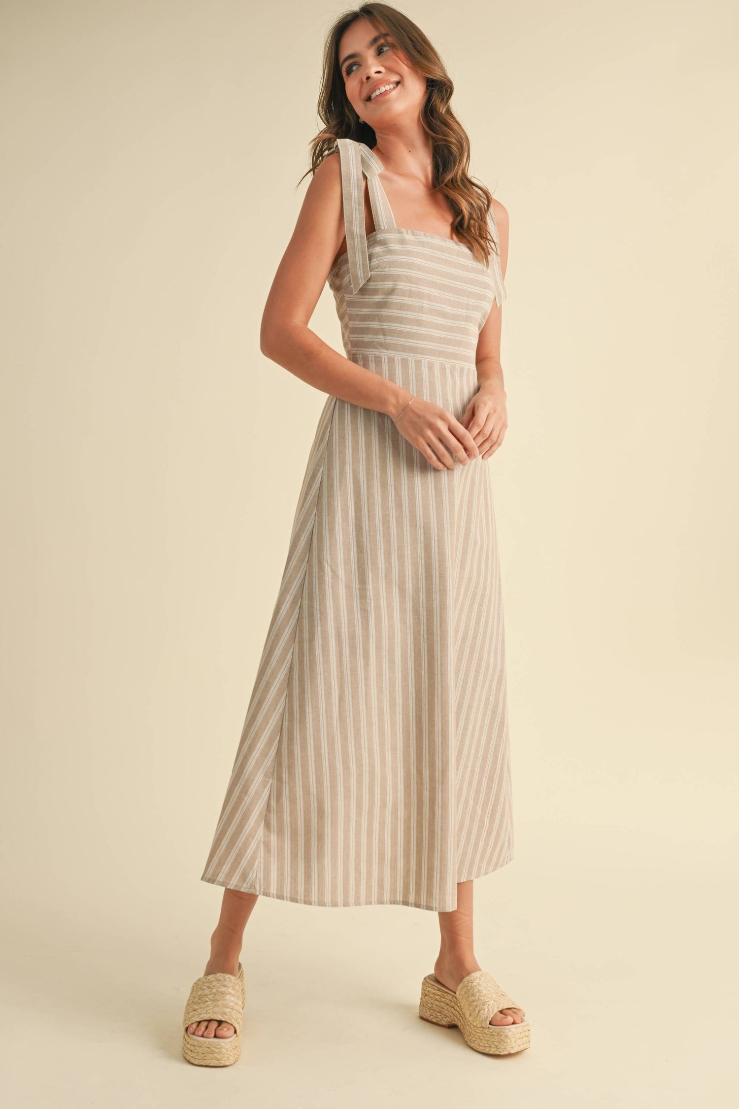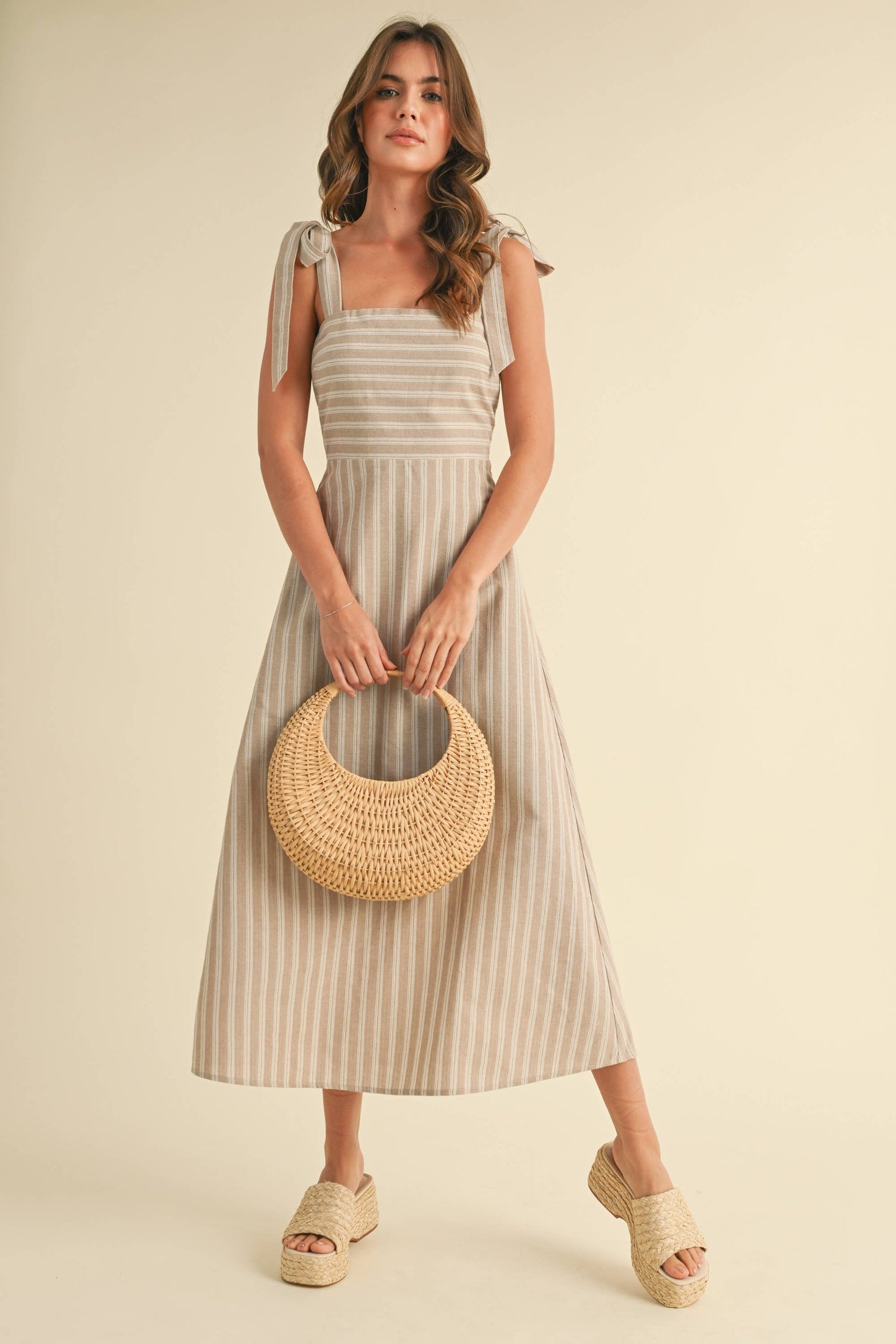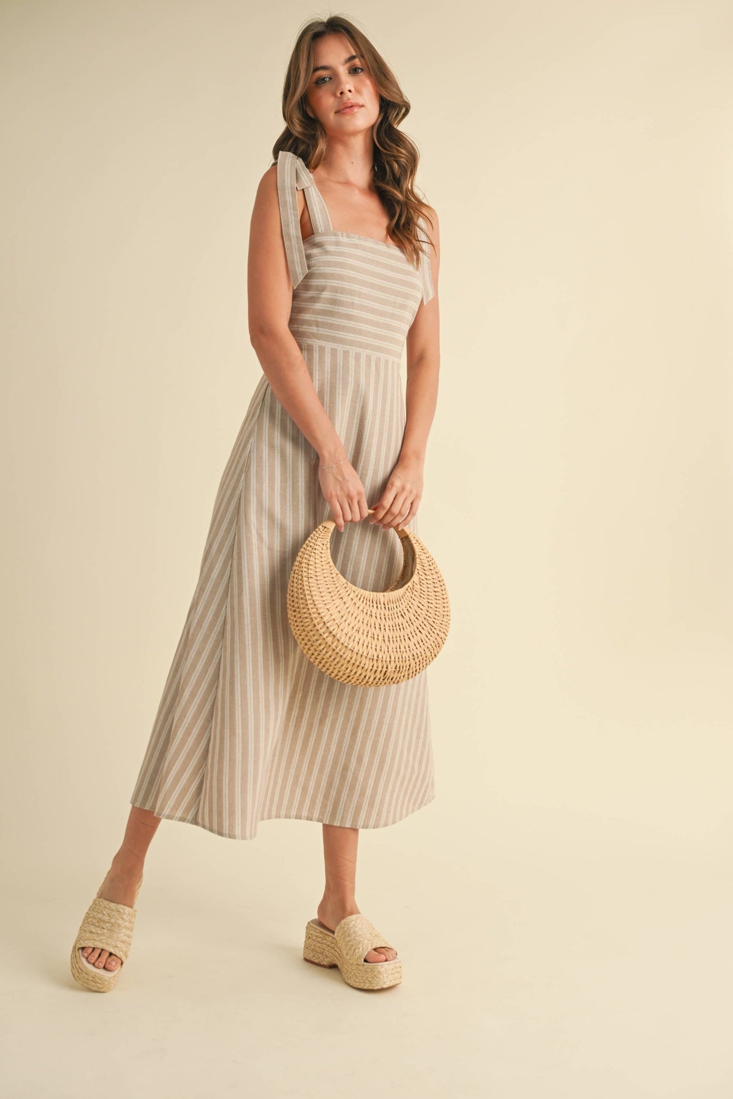 STRIPED SHOULDER TIE FLARED MIDI DRESS