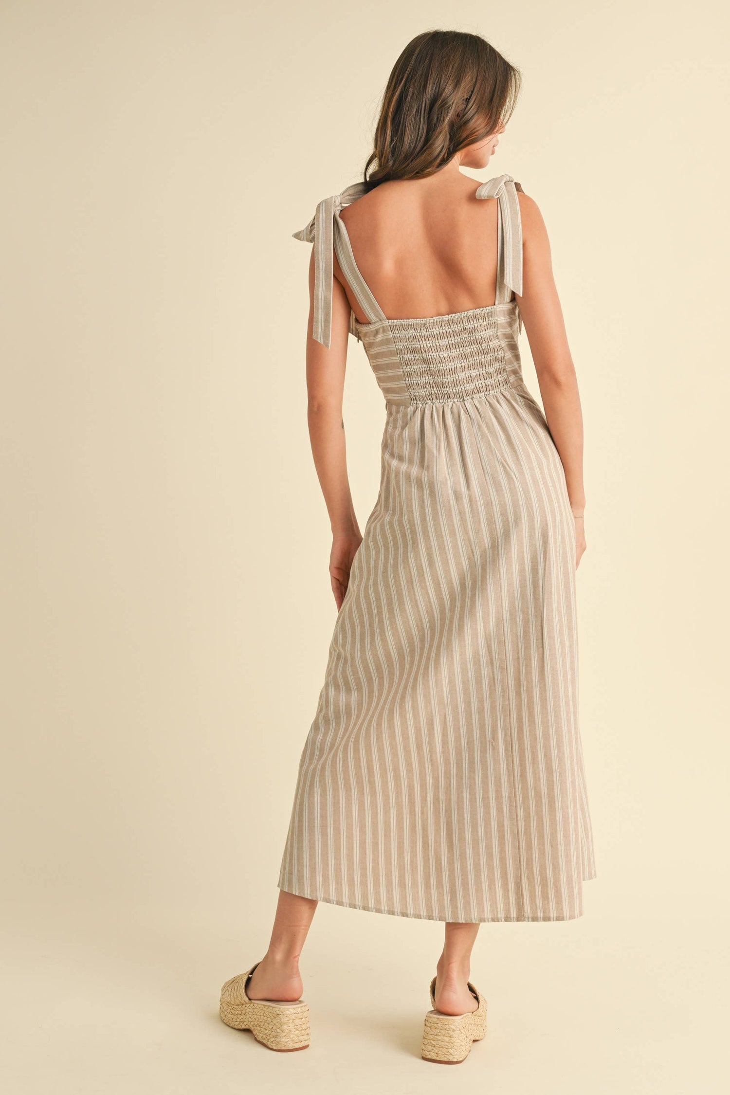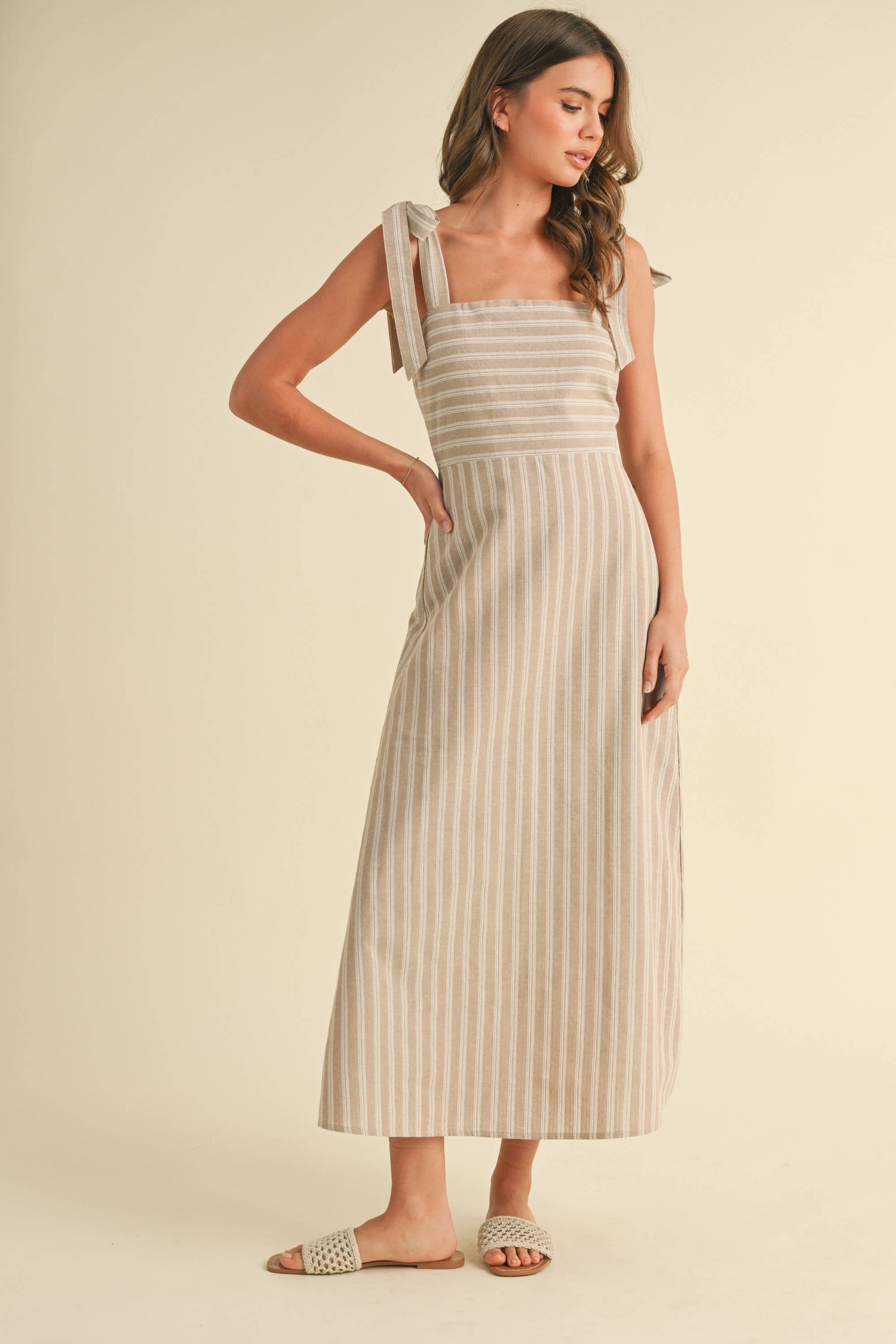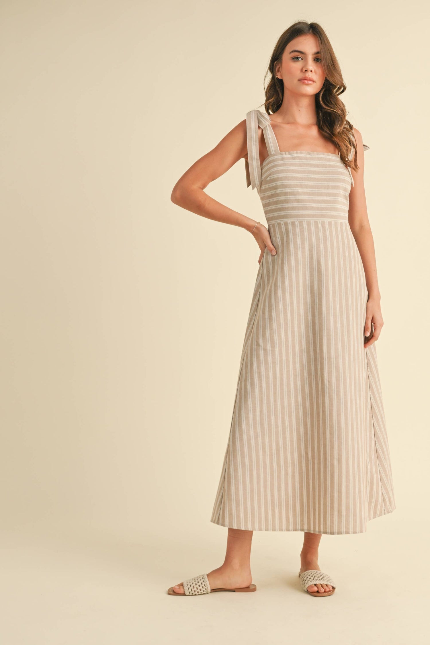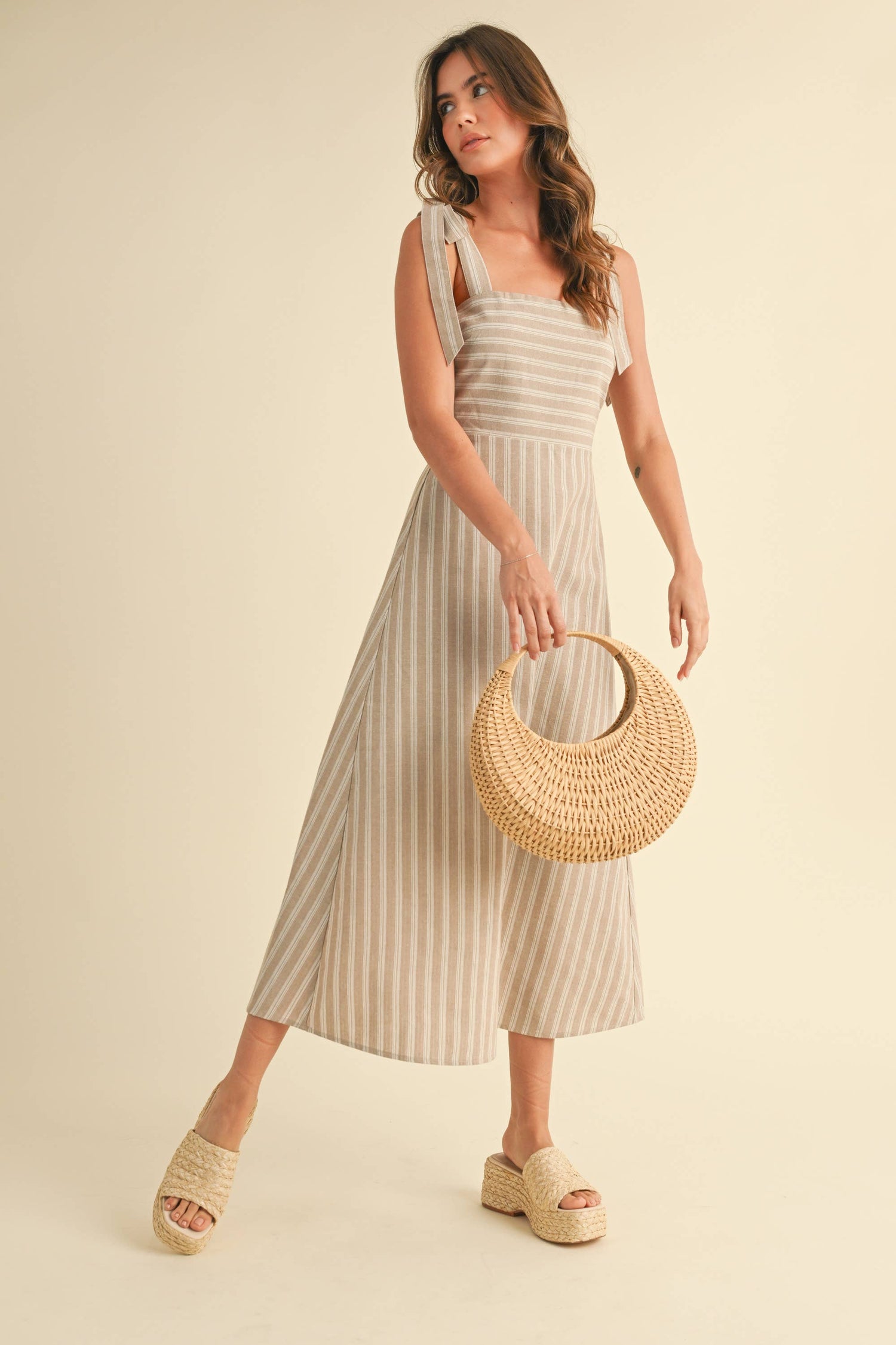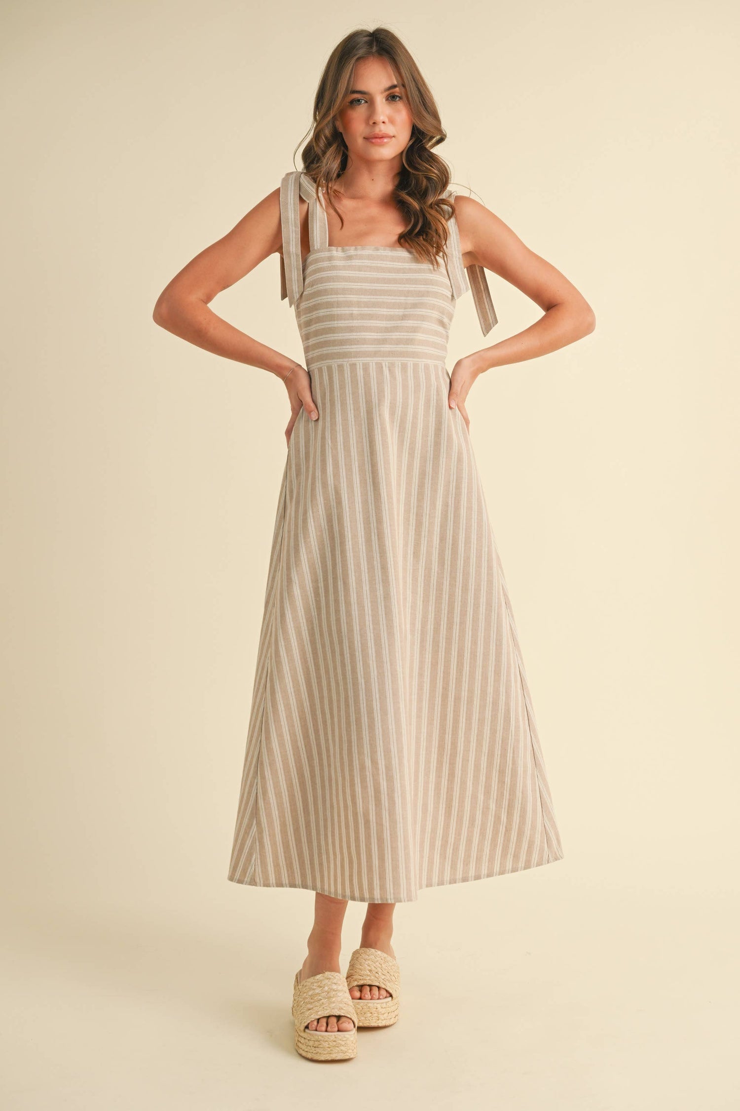 STRIPED SHOULDER TIE FLARED MIDI DRESS