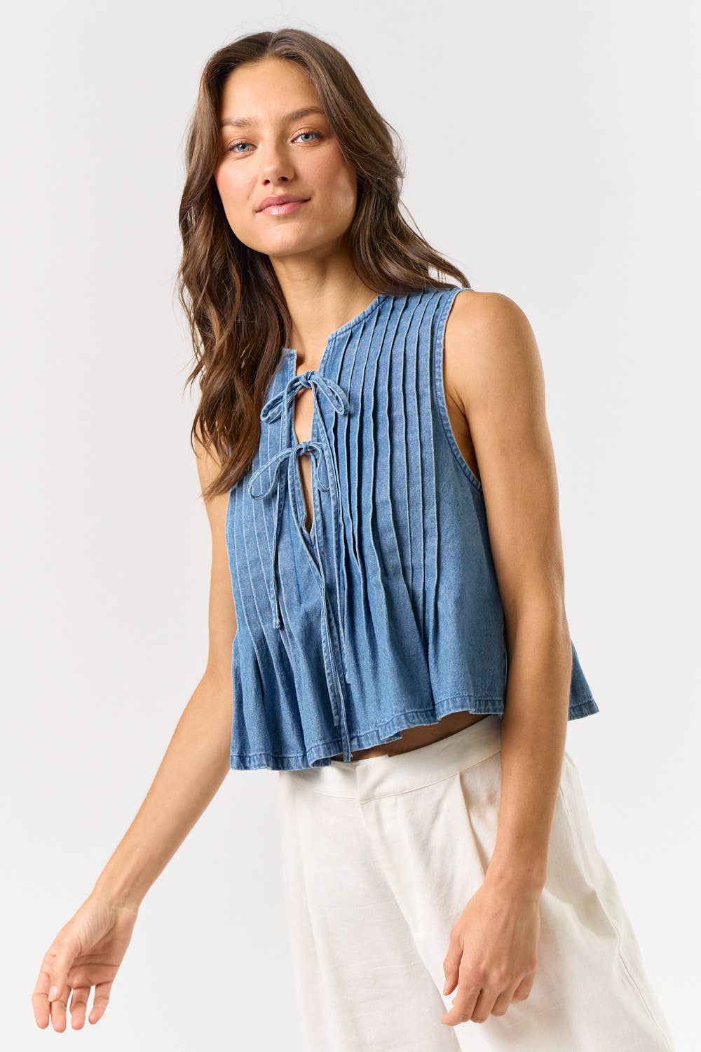 ILT5631 DENIM FRONT TIE SLEEVELESS TOP: DENIM