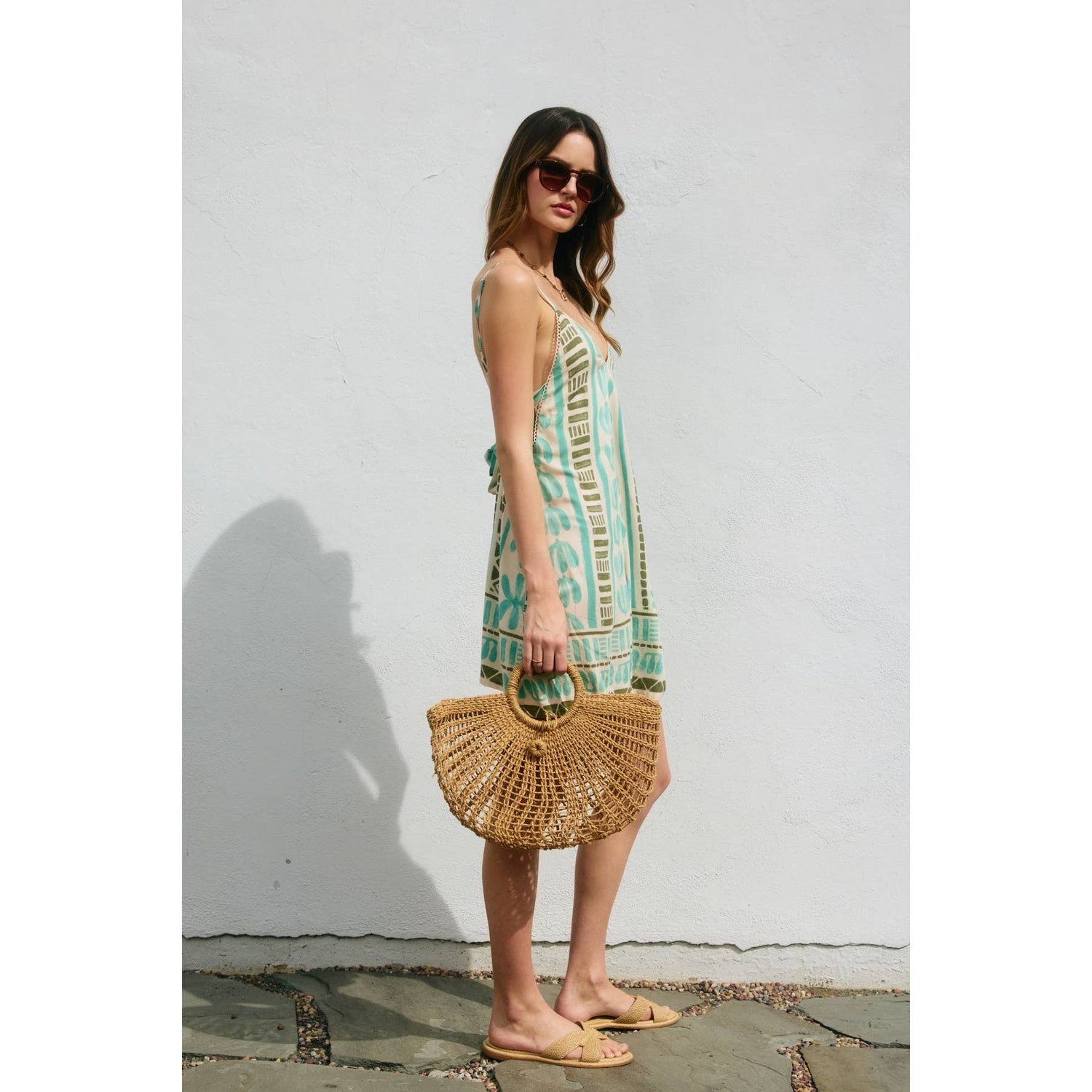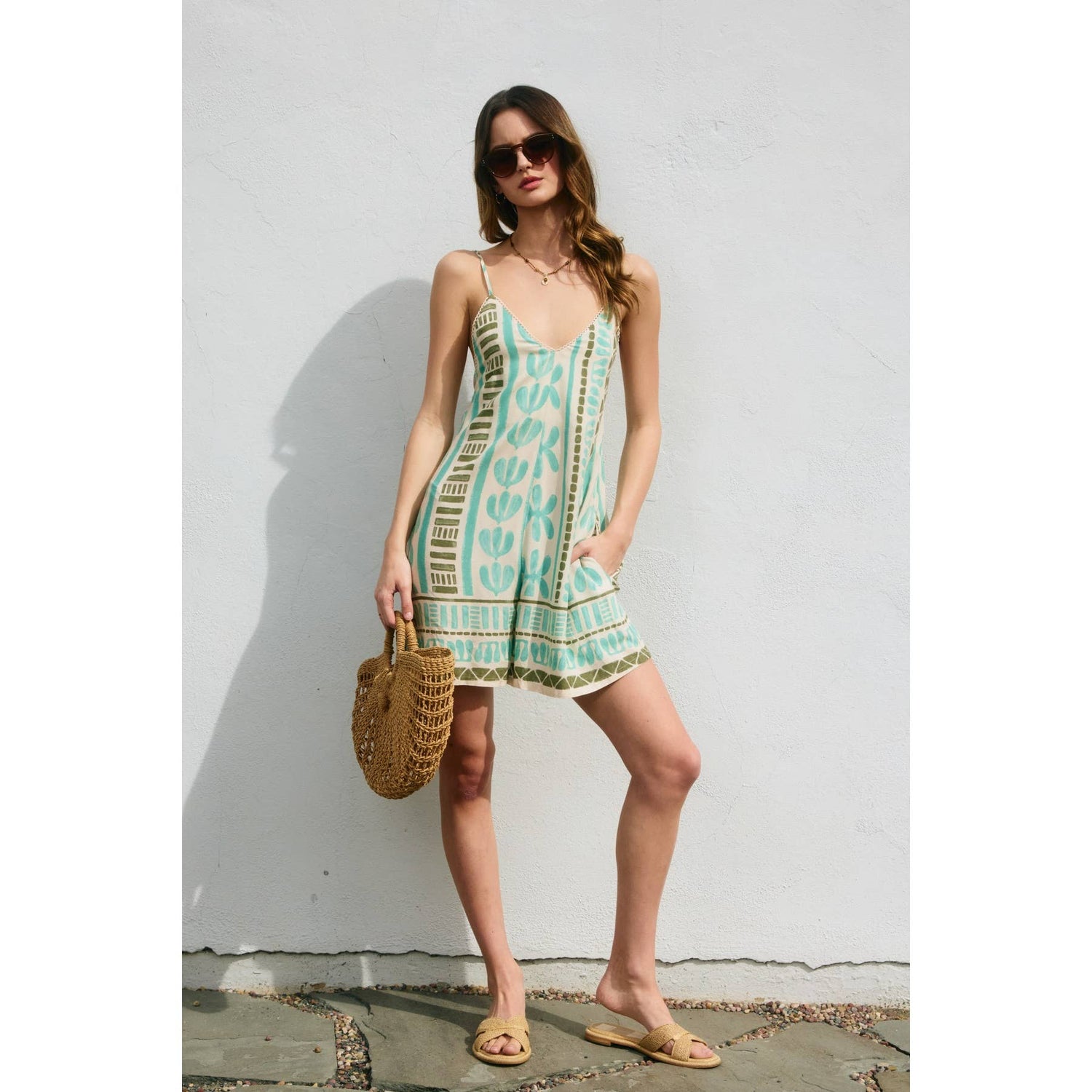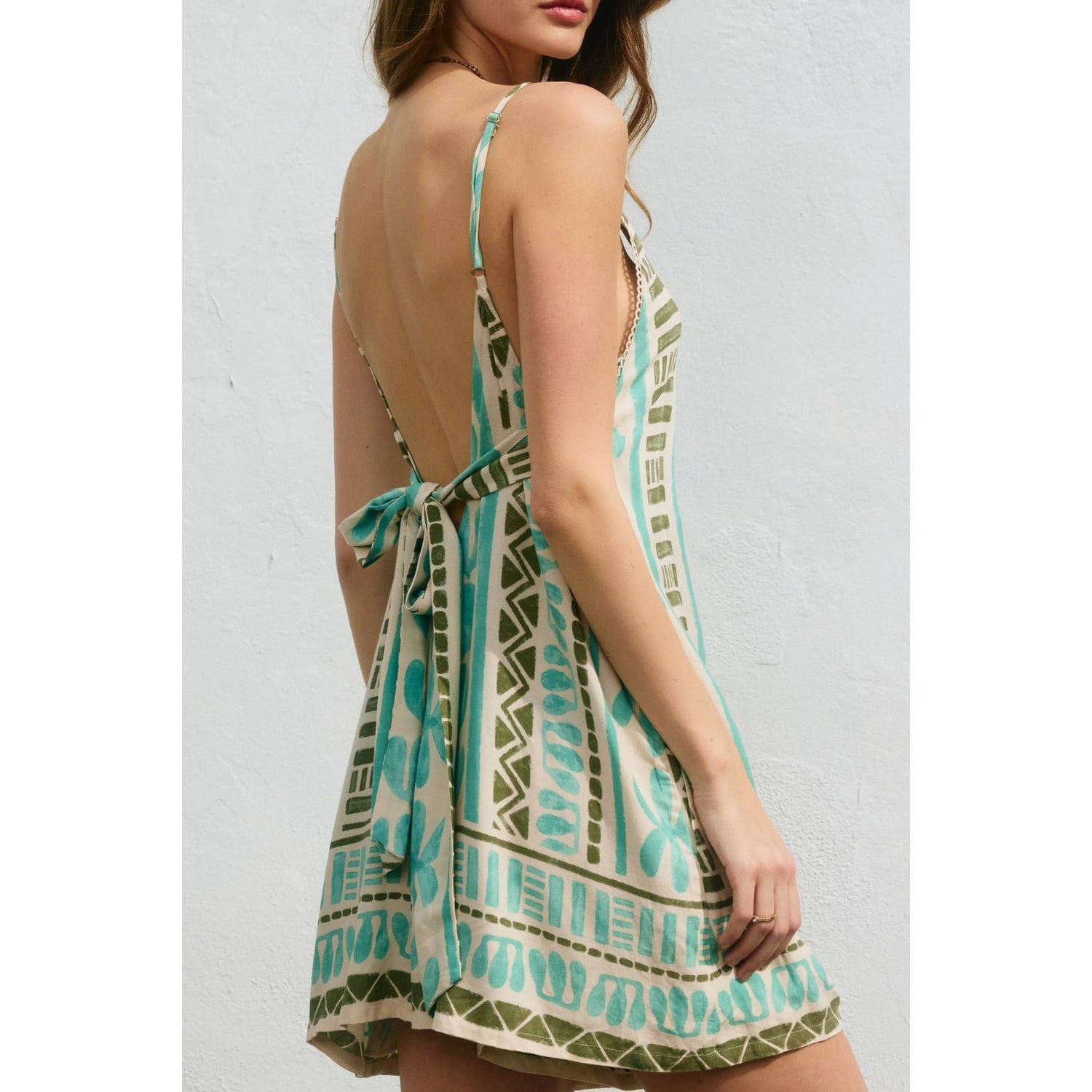 Border printed pull-on romper with an open back and a tie closure. Model is 5'9" and wearing size Small.