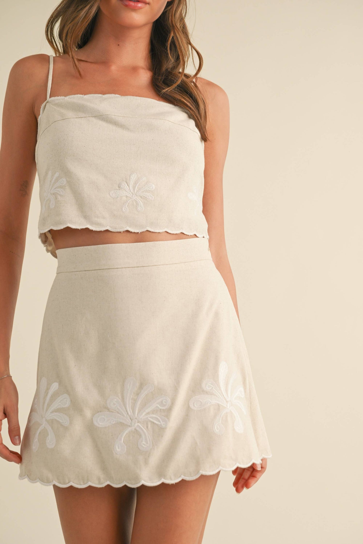 LINEN CAMI TOP AND MINI SKIRT SET WITH FLORAL EMBROIDERY BORDER DETAIL