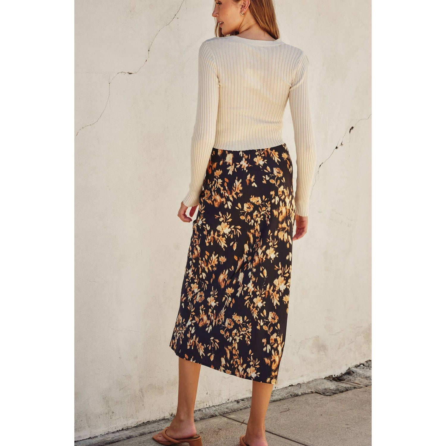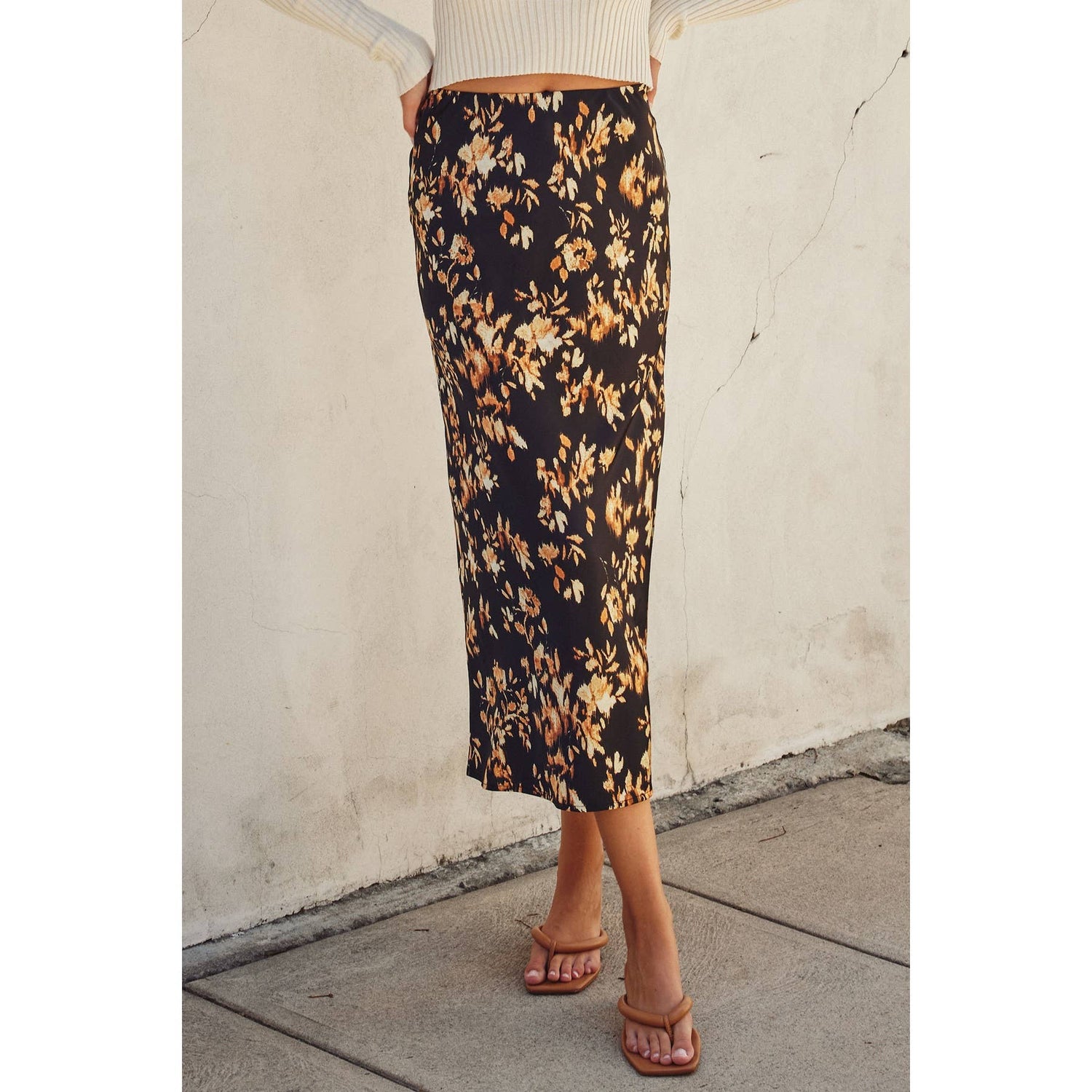 Floral satin maxi pull on skirt. Model is 5'10" and wearing size Small.