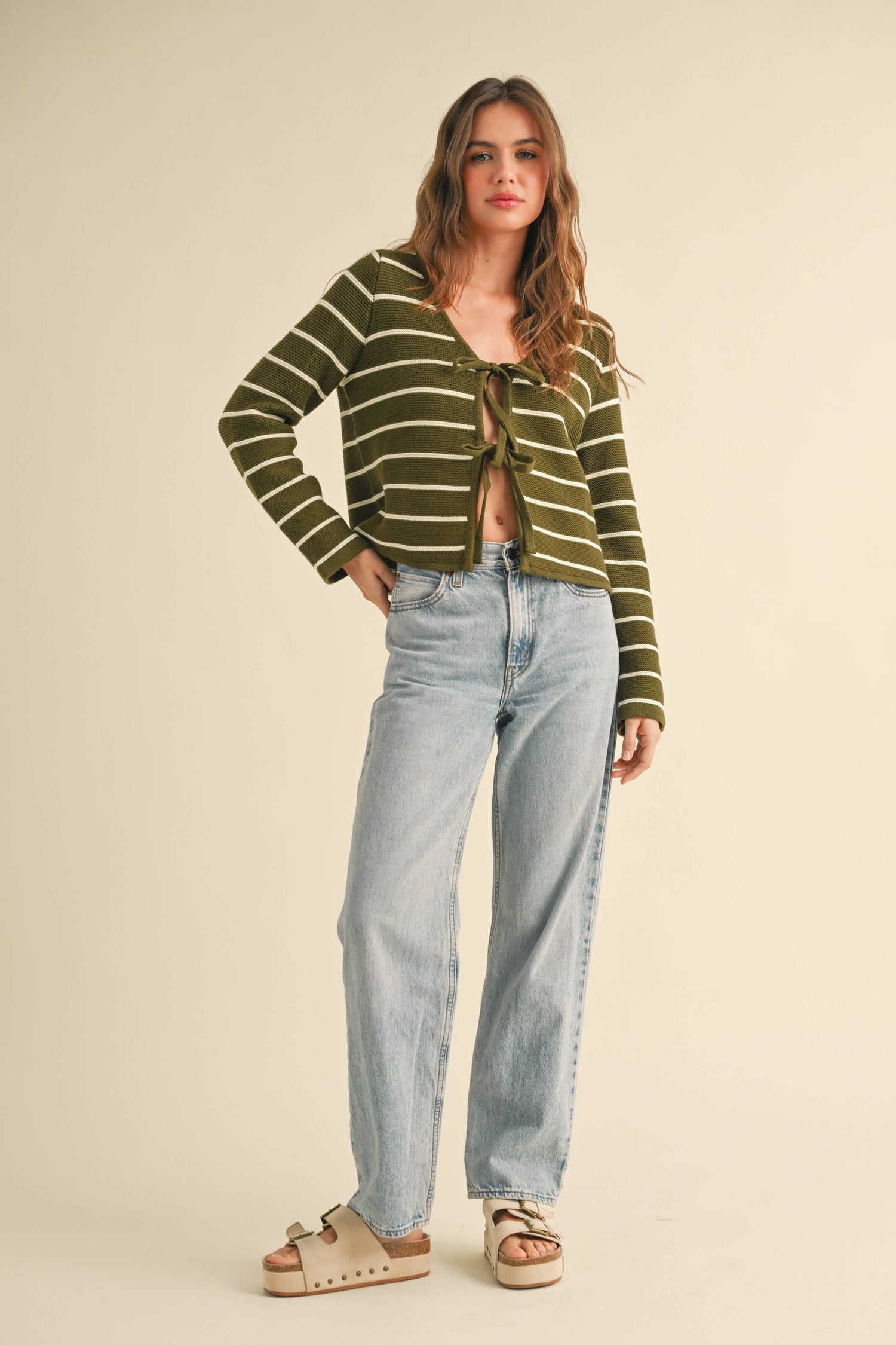 J4757 STRIPED TIED FRONT CARDIGAN: WHITE/BLACK