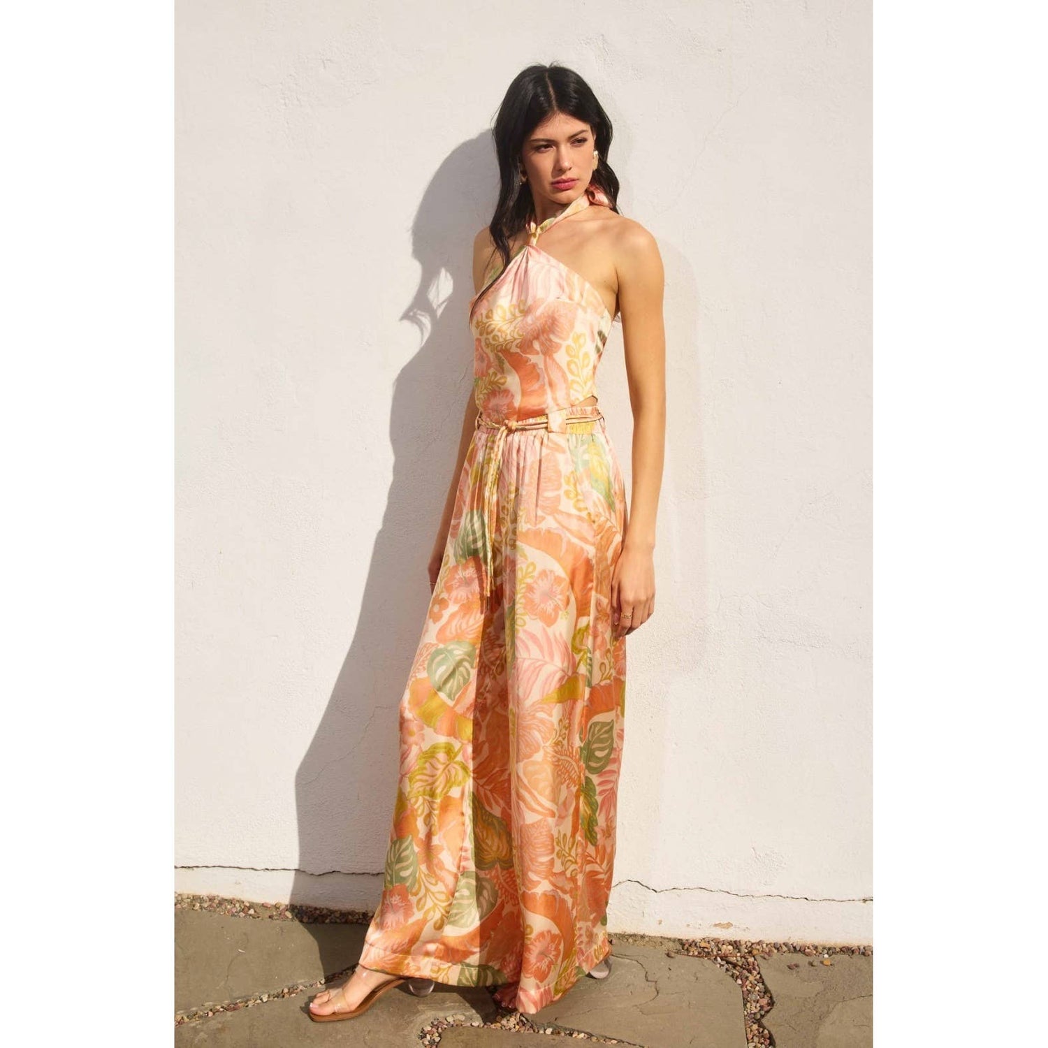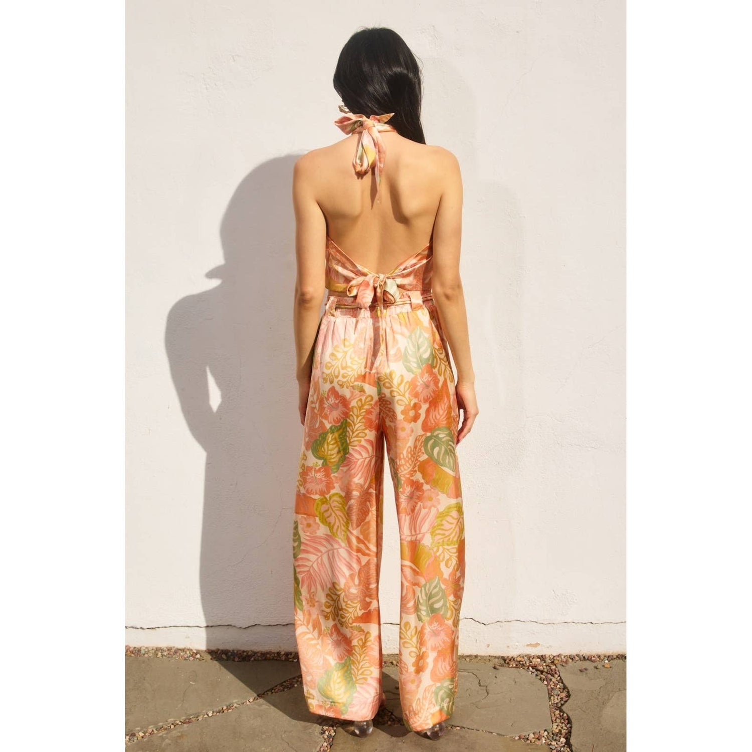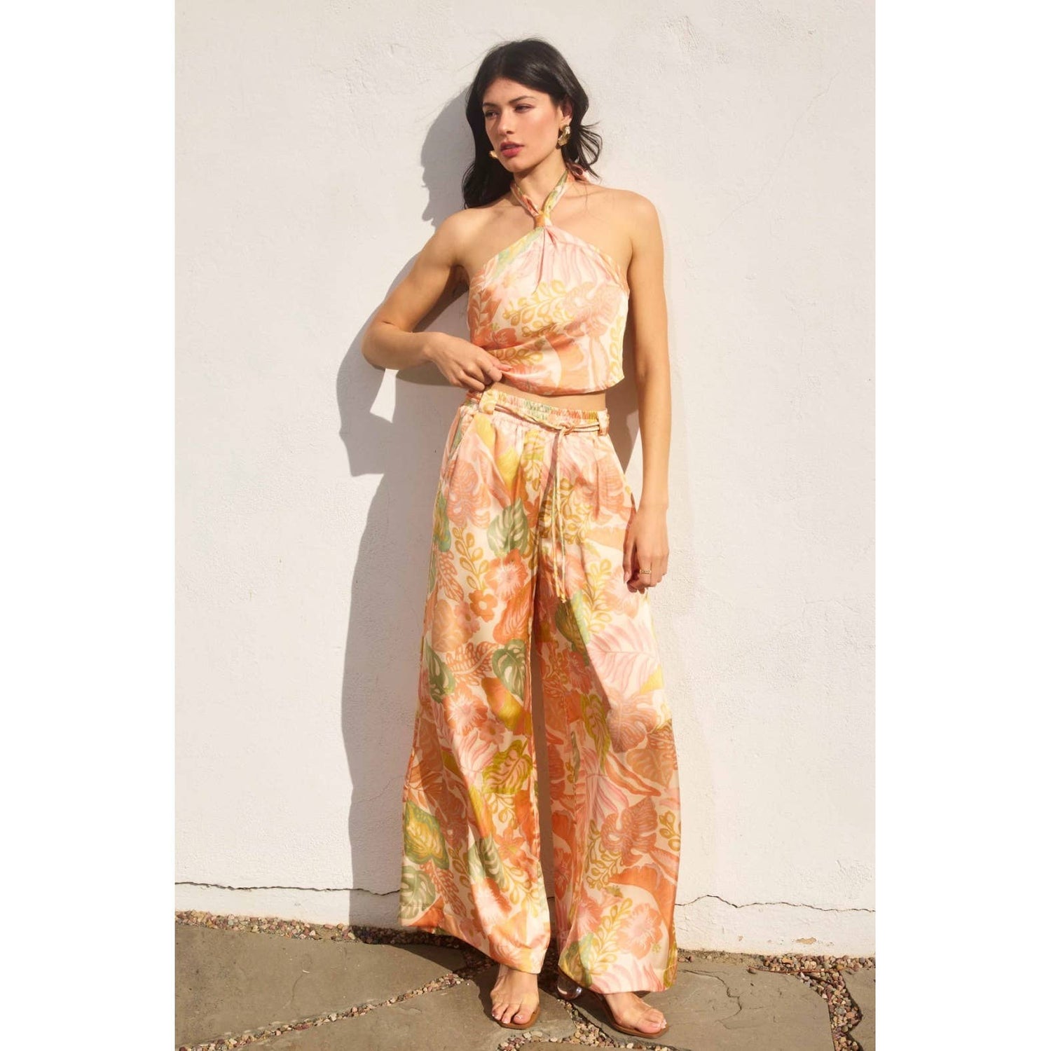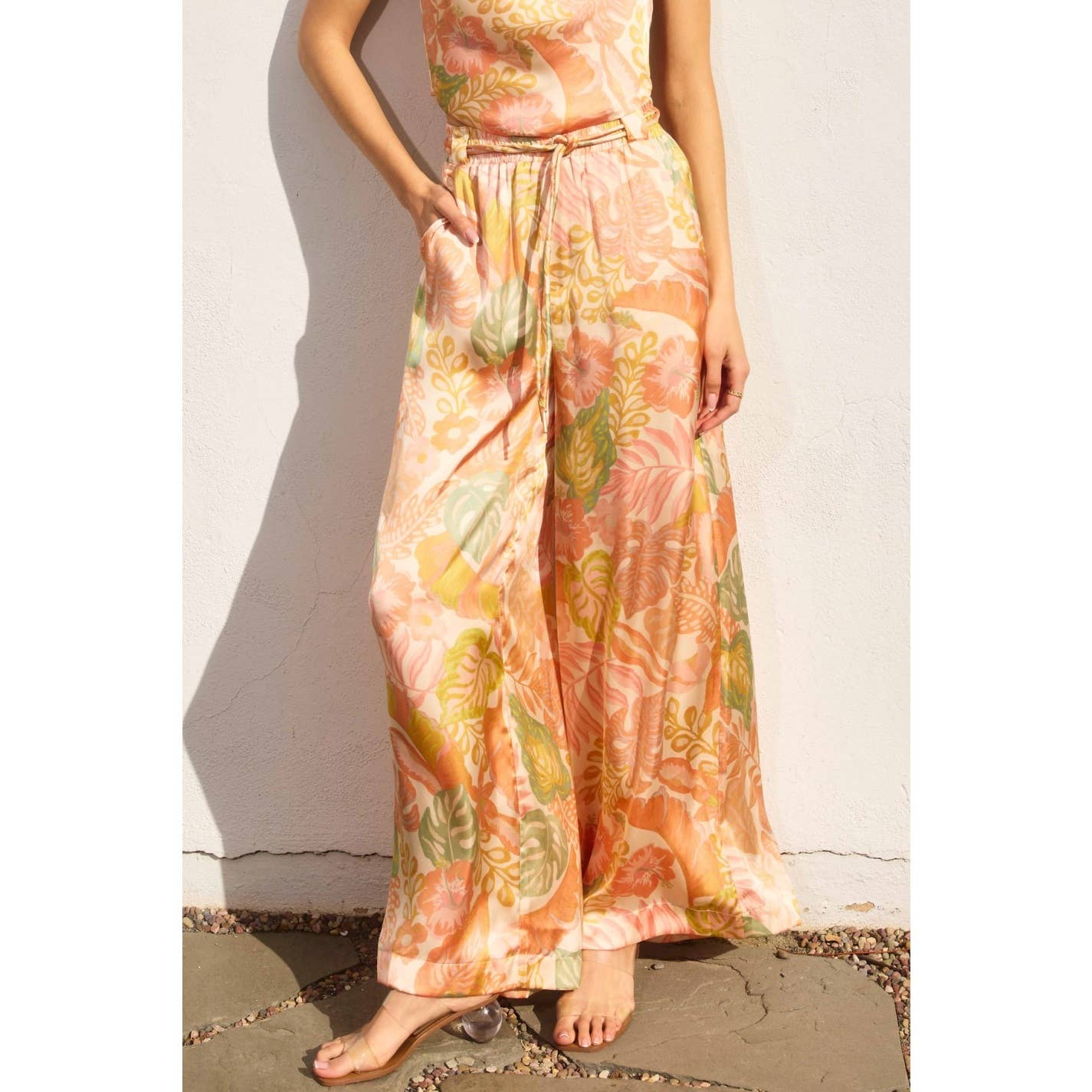 Floral printed satin wide leg pants. Model is 5'8" and wearing size Small.