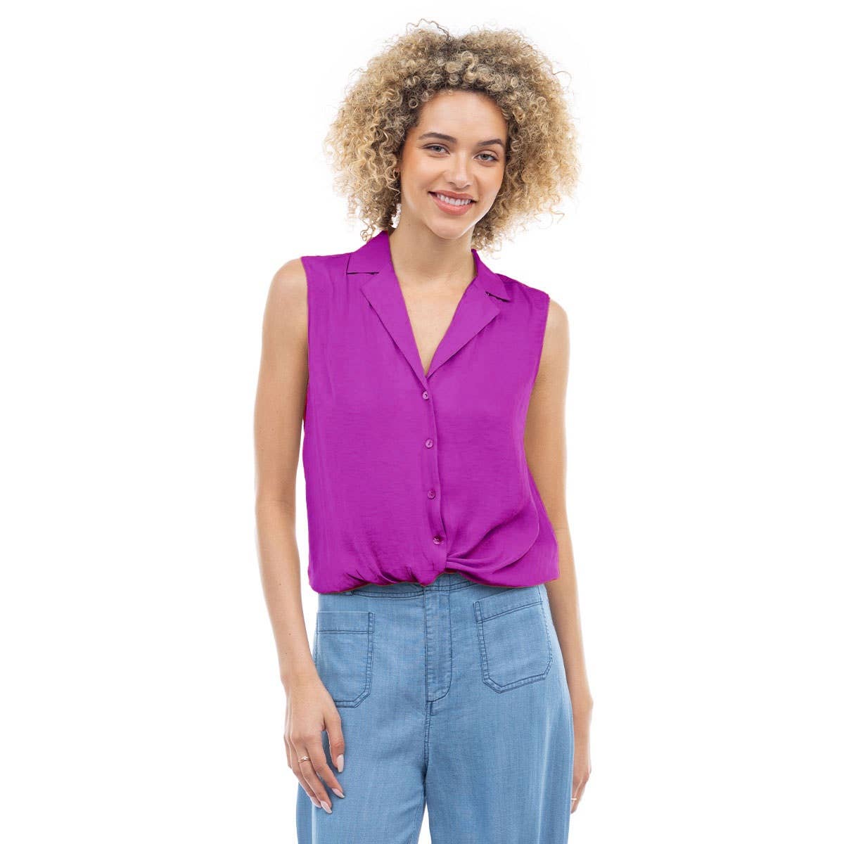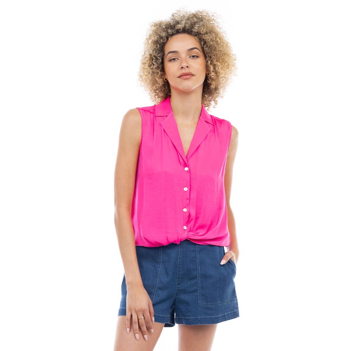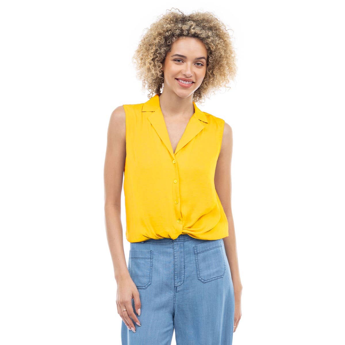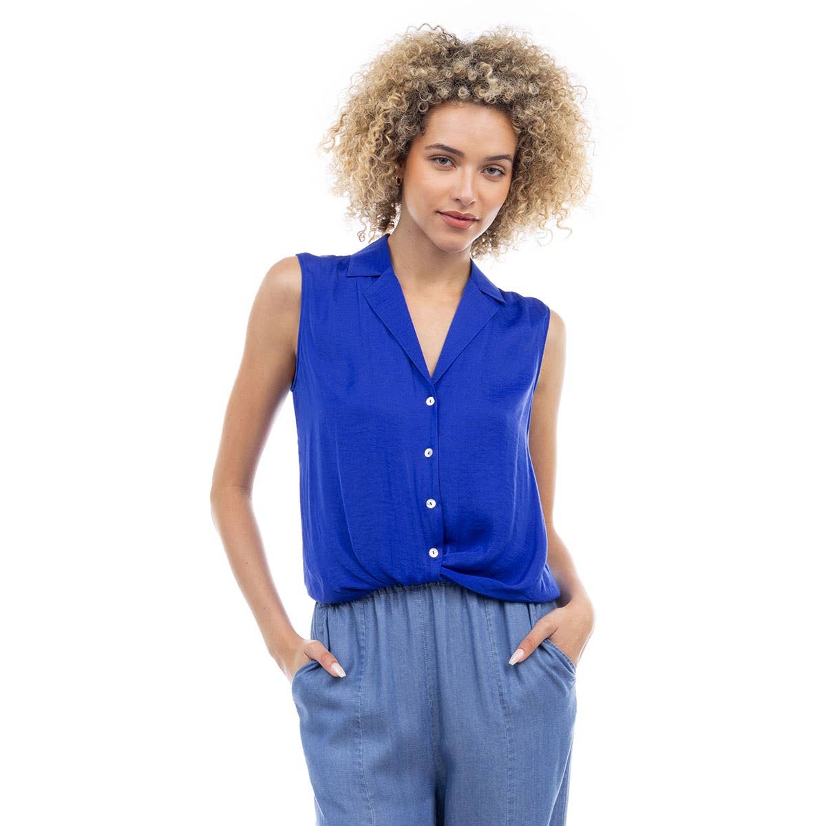 This sleeveless top features a crisp collar and a front knot detail, creating a polished and contemporary look. The soft fabric and sleeveless design provide cool comfort, making it ideal for warm weather. Available in vibrant colors, it's a stylish choice for both office and leisure.