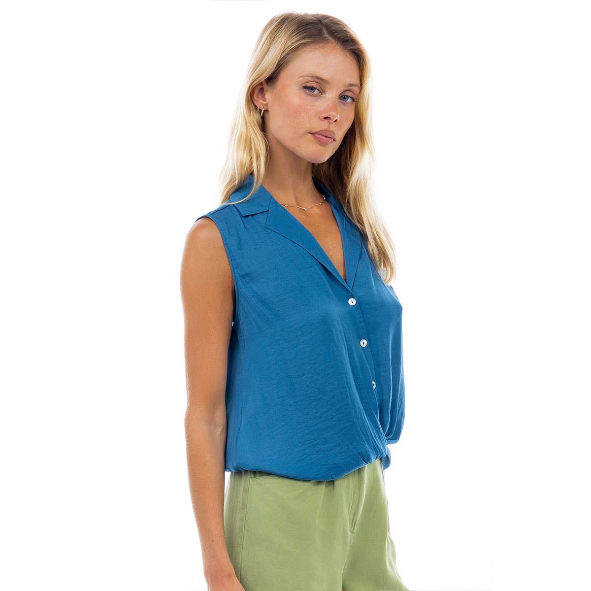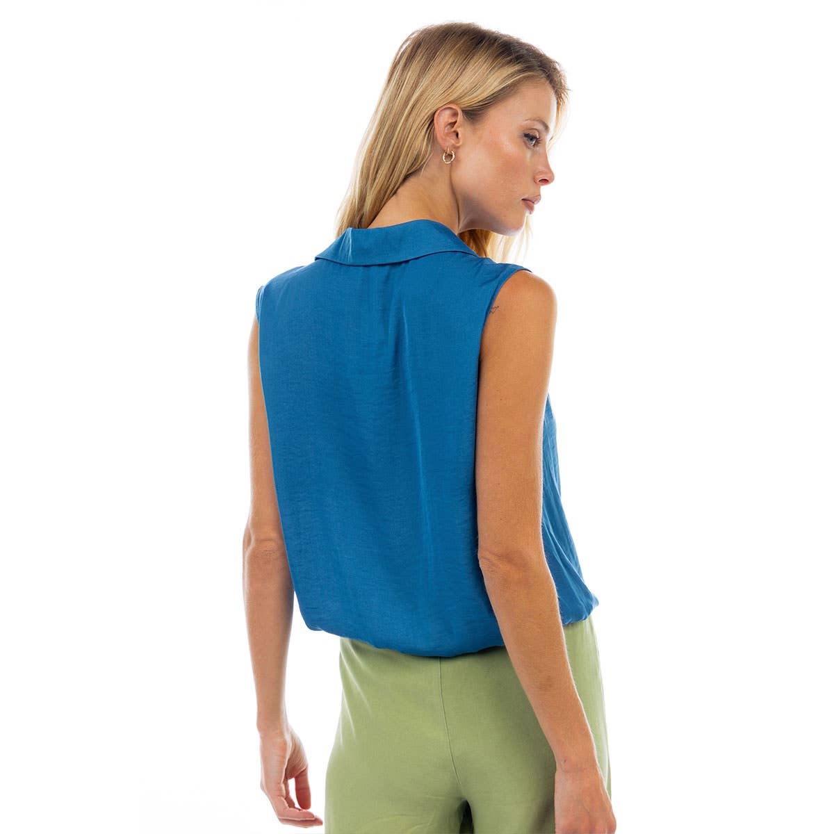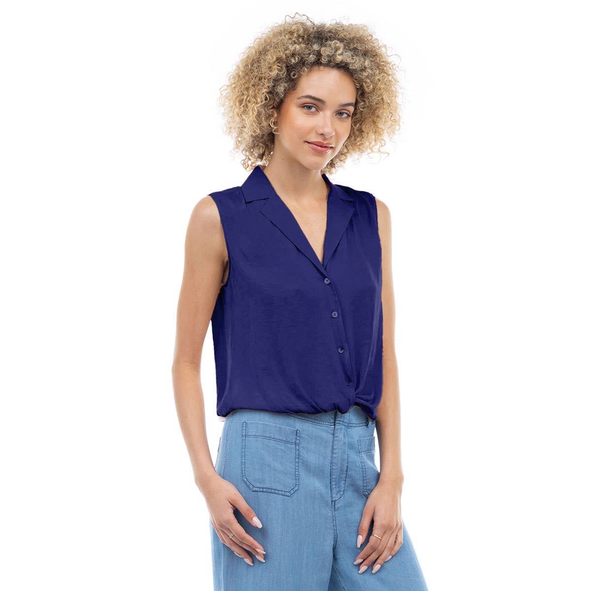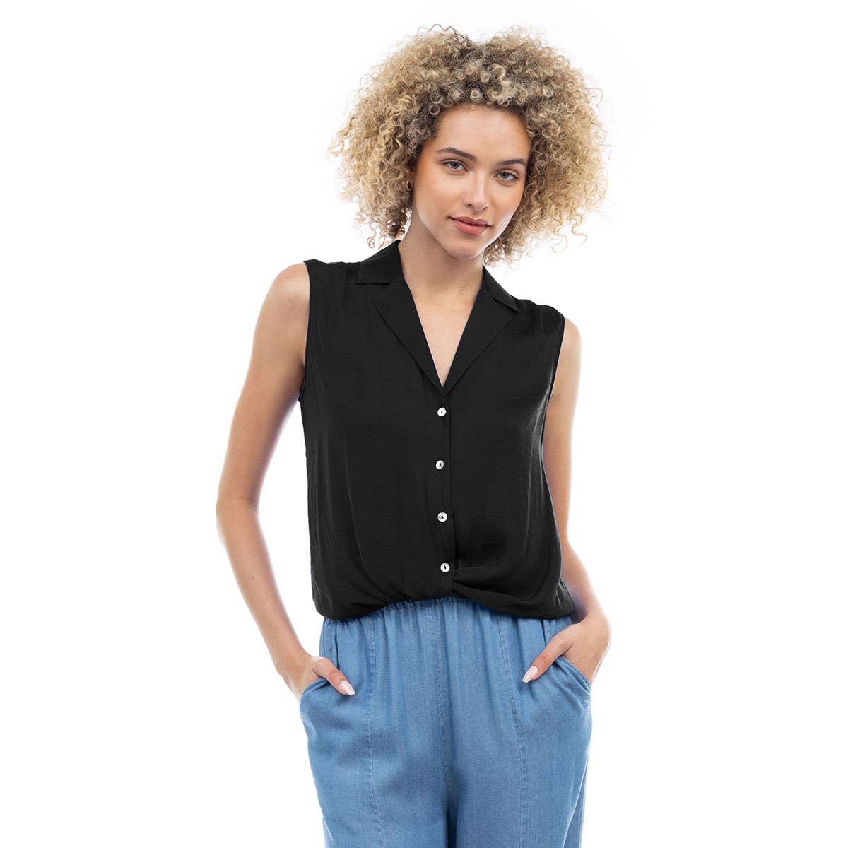 This sleeveless top features a crisp collar and a front knot detail, creating a polished and contemporary look. The soft fabric and sleeveless design provide cool comfort, making it ideal for warm weather. Available in vibrant colors, it's a stylish choice for both office and leisure.