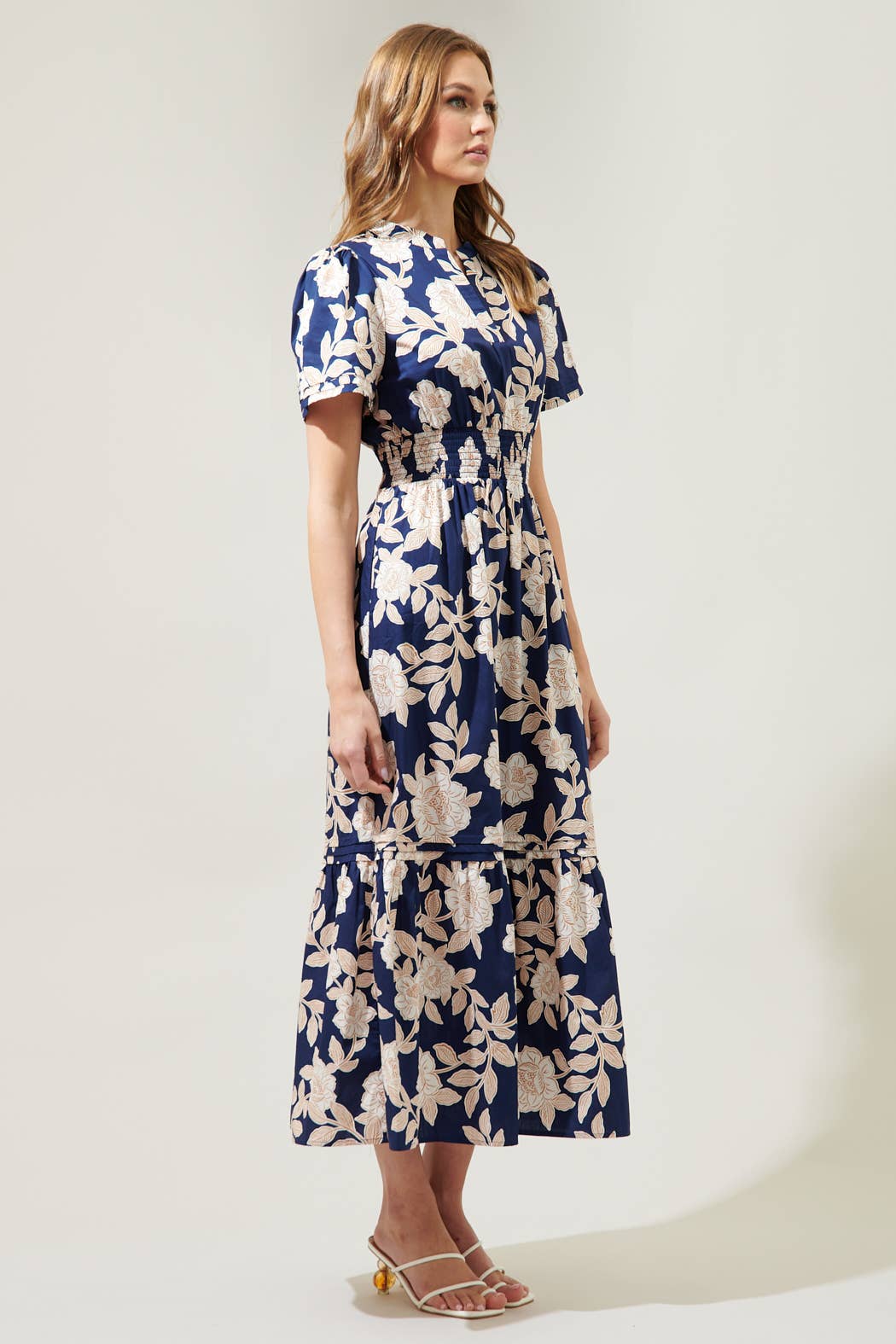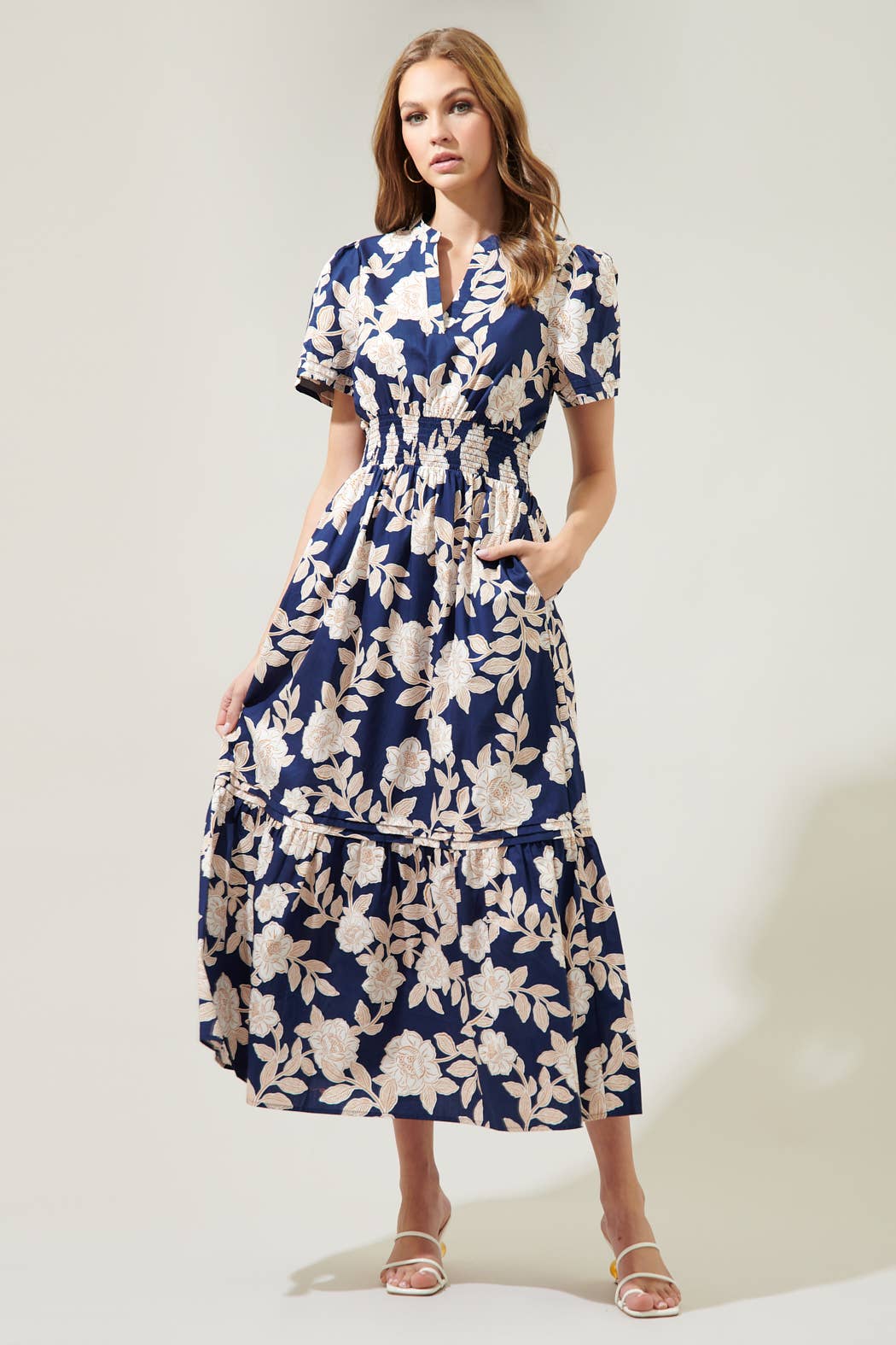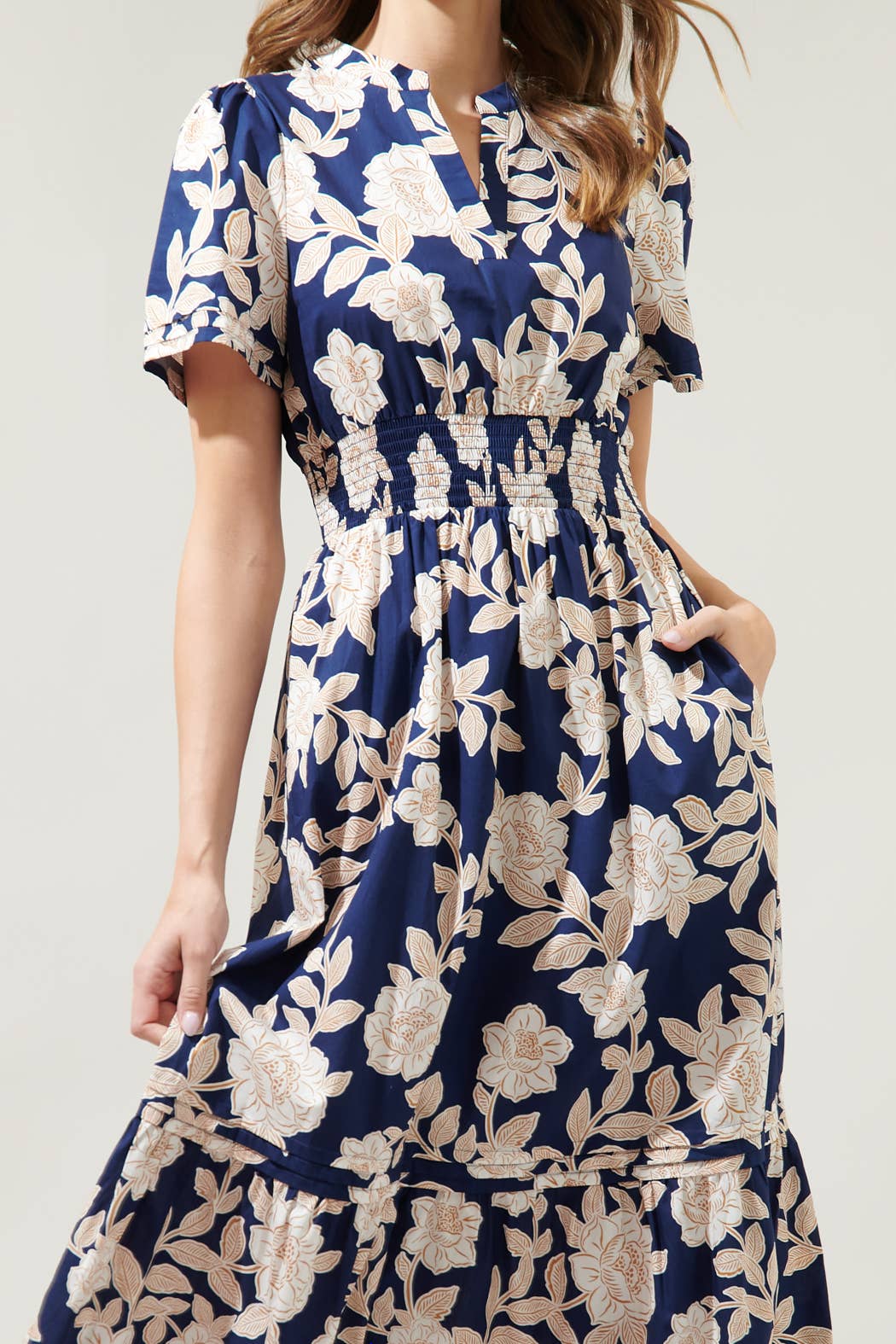"Something to admire, just like the night sky. The Lilo floral print takes on a deep, navy-ground to shape the Belraj Midi. A split neckline framed by short sleeves tops a flowy midi skirt that's separated by a smocked waistline. Pleated layer details sweep across the bottom third of the skirt to create a single tier.