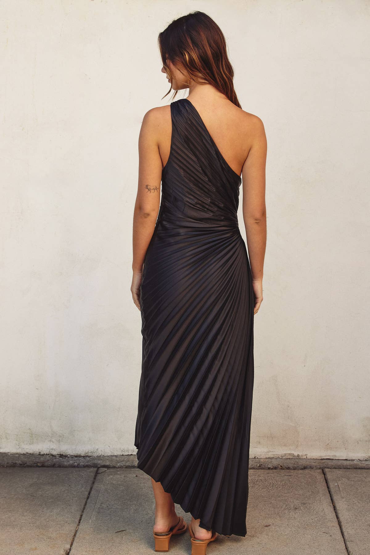 All over pleated maxi dress featuring an asymmetrical design. Model in MIMOSA, ATLANTIC JEWEL, SAGE is 5'10" , Model in GOLDEN OCHRE, PEARL, OLIVE GREEN is 5'9", Model in BLUE SAPPHIRE, FRESCO BLUE SIENNA, MIDNIGHT NAVY, MERLOT, VIVA MAGENTA is 5'8", Mode in BLACK, GOLDEN SAND is 5'7' and wearing size Small.
