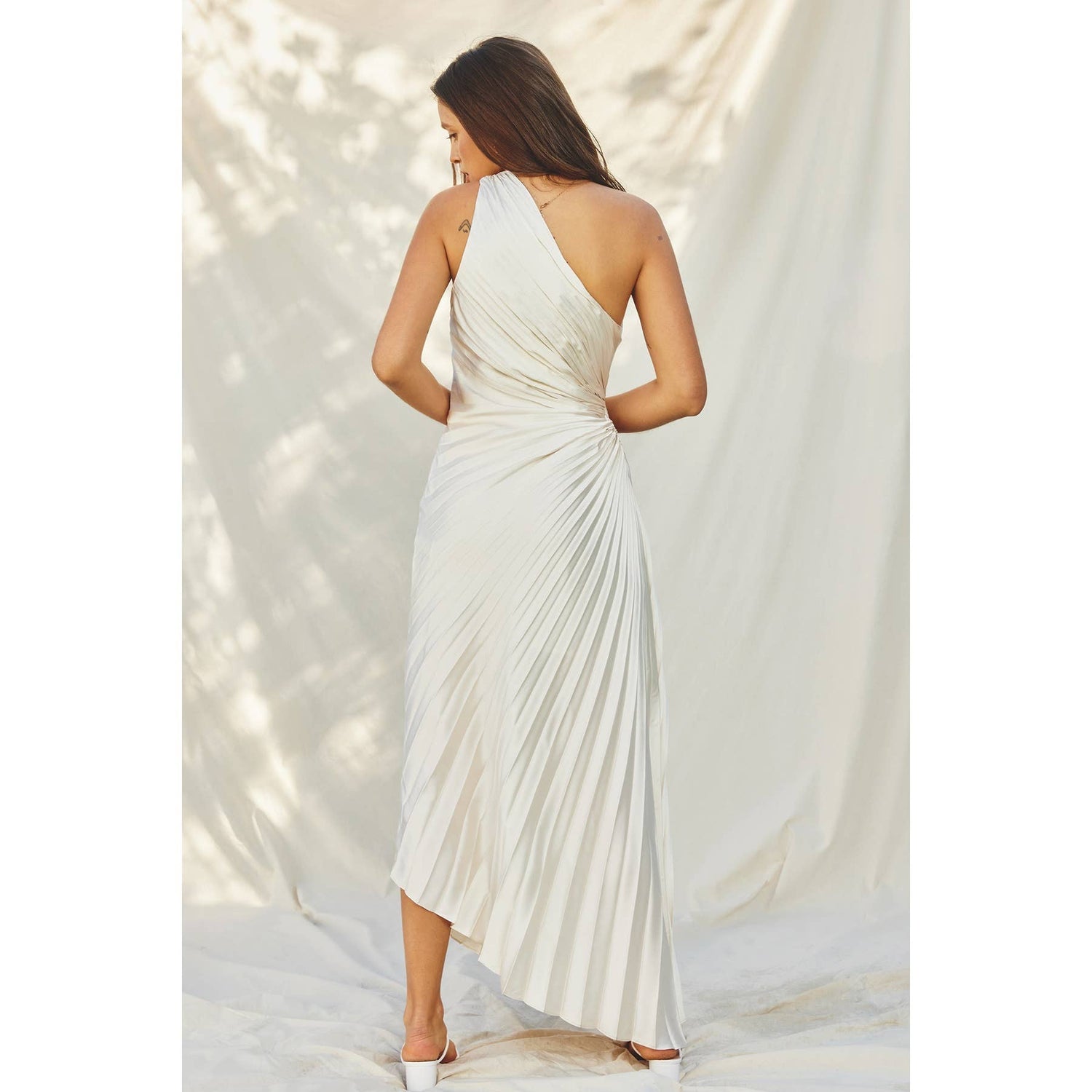 All over pleated maxi dress featuring an asymmetrical design. Model in Golden Ochre is 5'9" and wearing size Small.