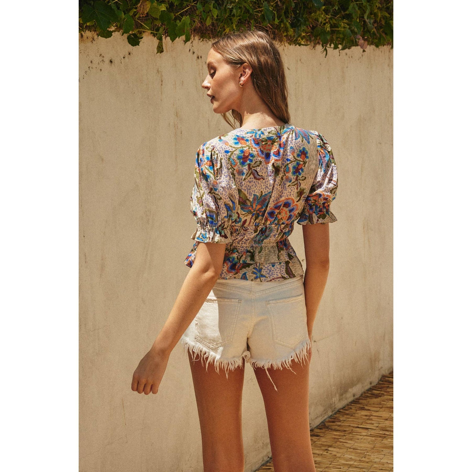 Floral printed short sleeves top with ruffled detailing. Model is 5'10" and wearing size Small.