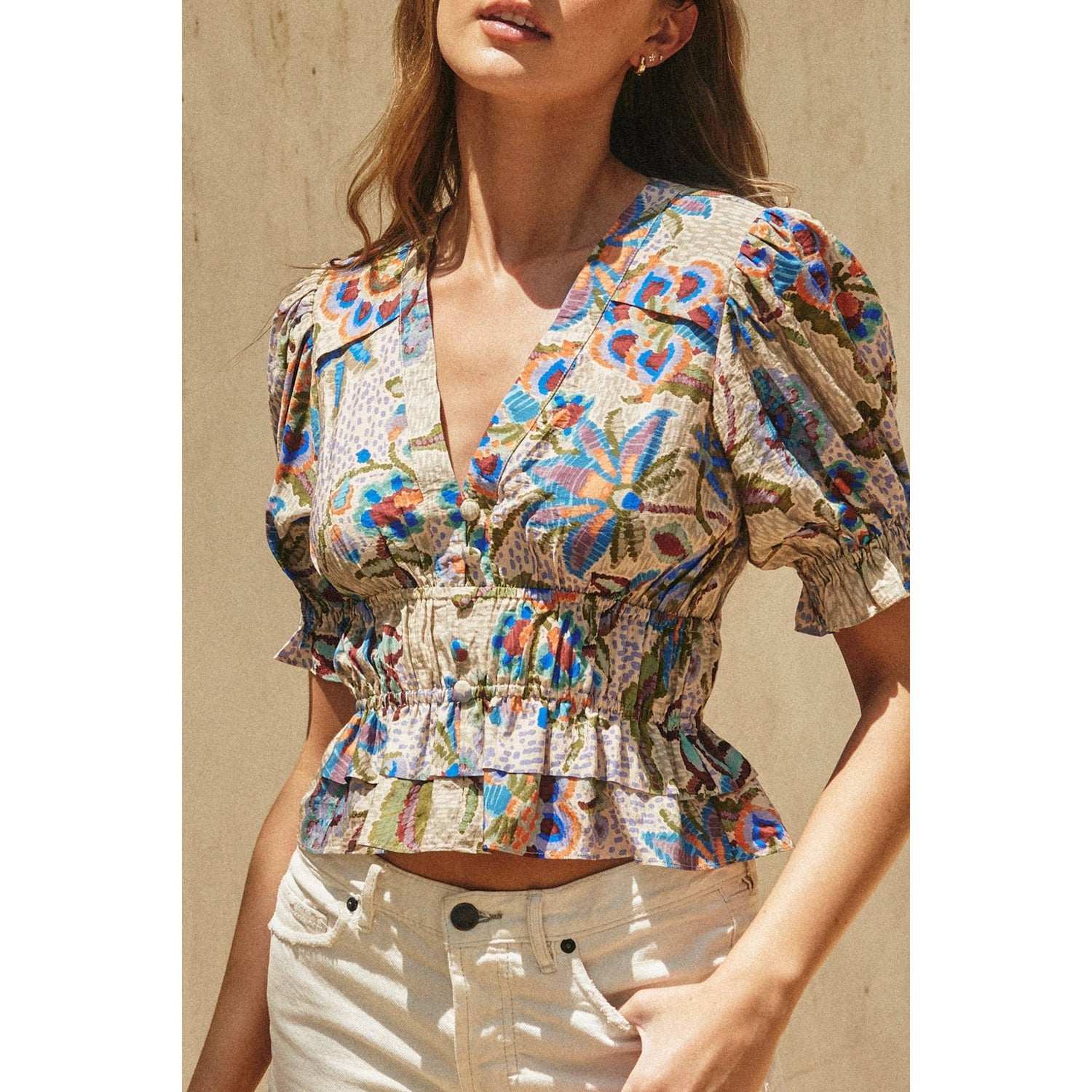 On The Dot Puff Sleeve Ruffled Top: MOSAIC VINEYARD / FT11900-P1696