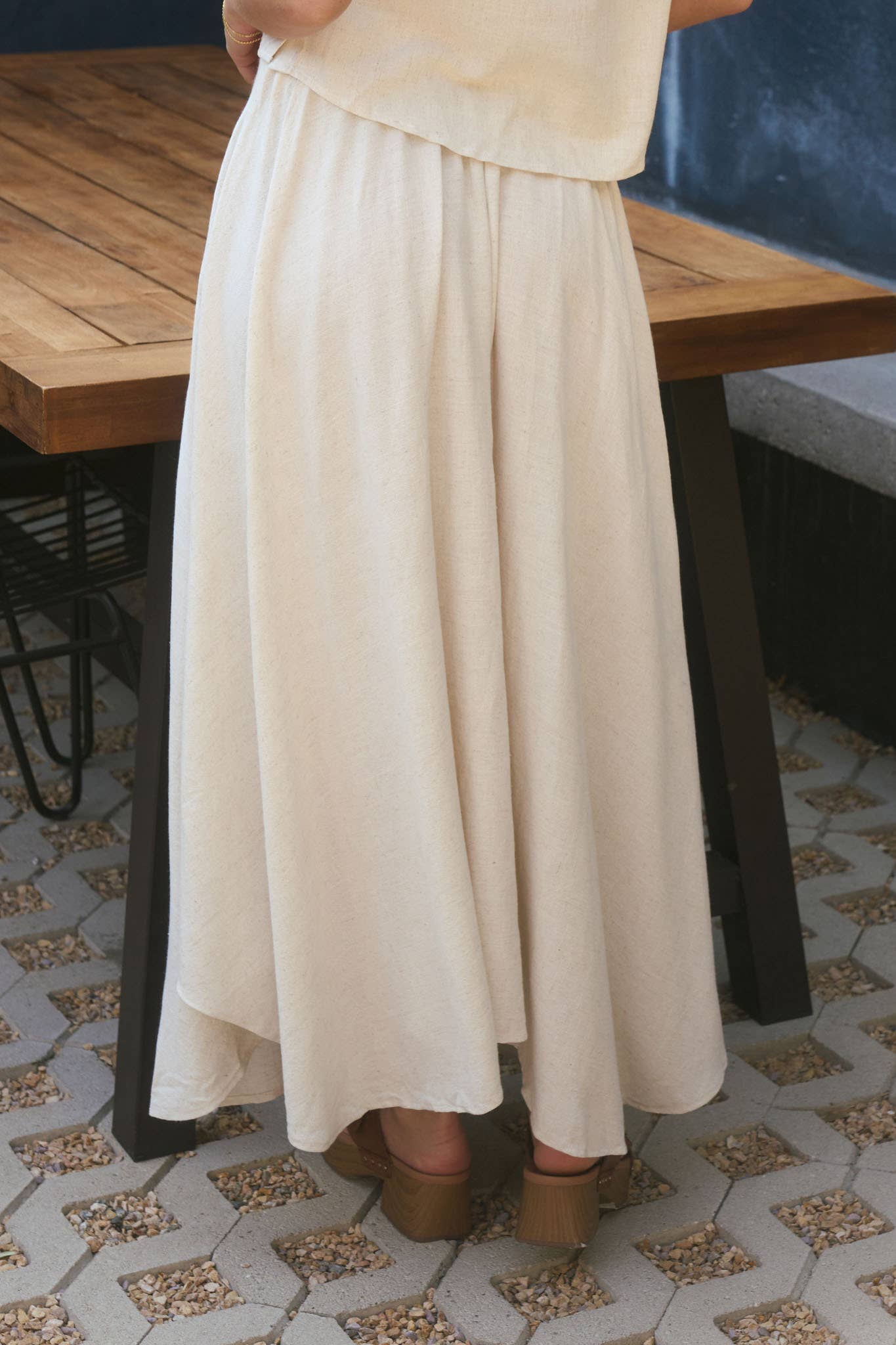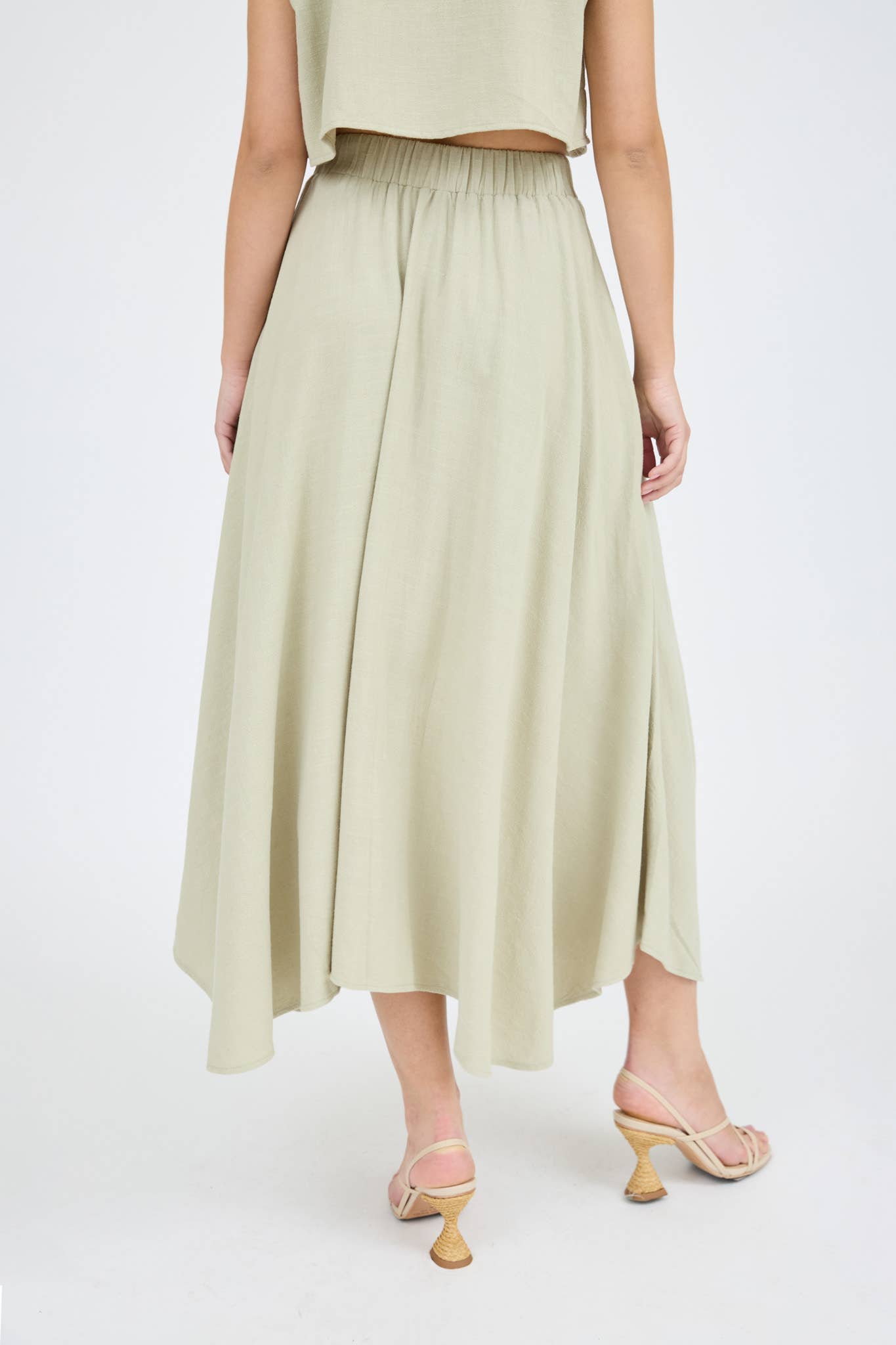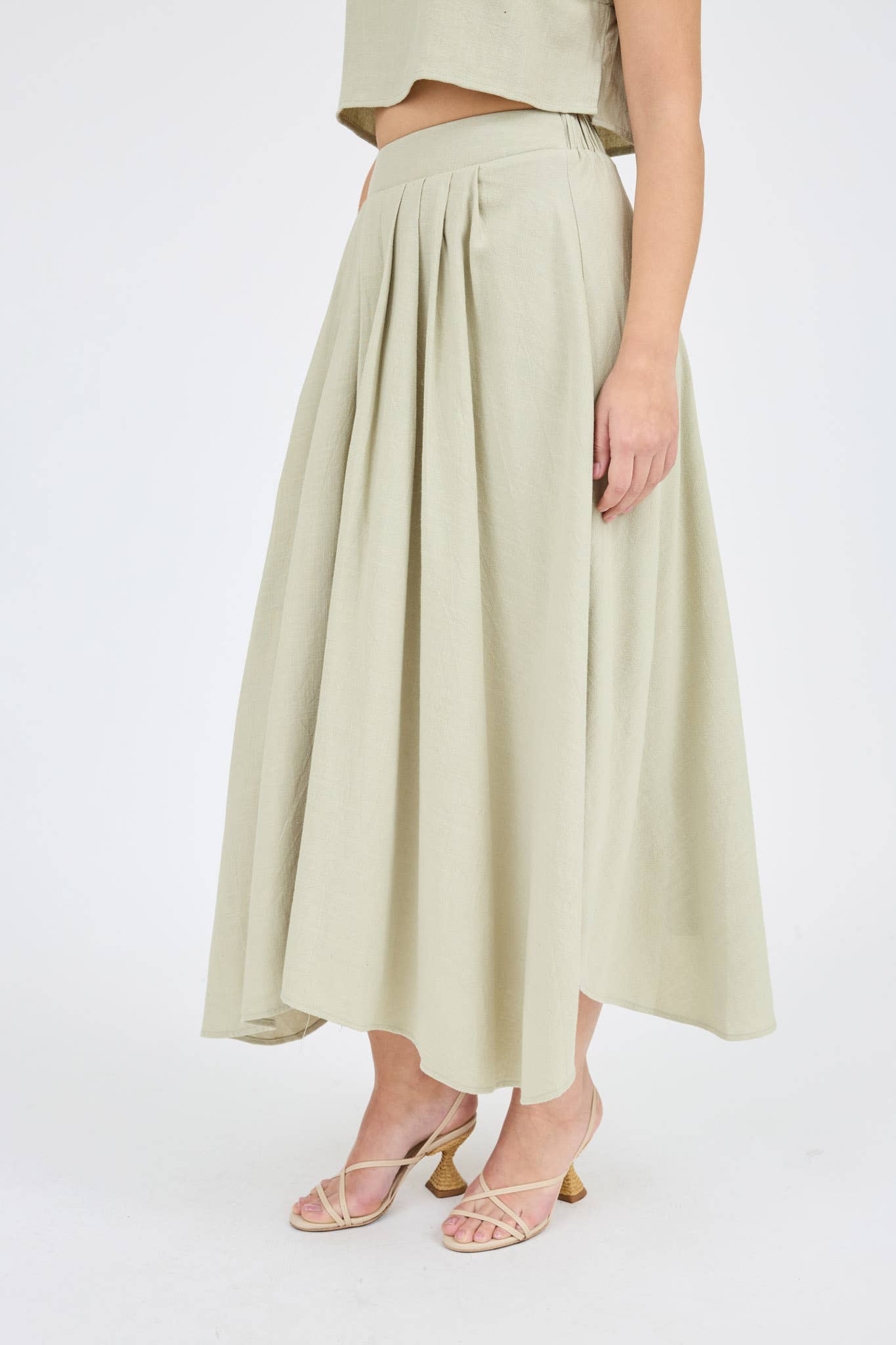 HIGH WAIST BACK ELASTIC TUNNEL FRONT PLEATED HANDKERCHIEF HEM LINEN SKIRT MAXI SKIRT 85%RAYON 15%LINEN