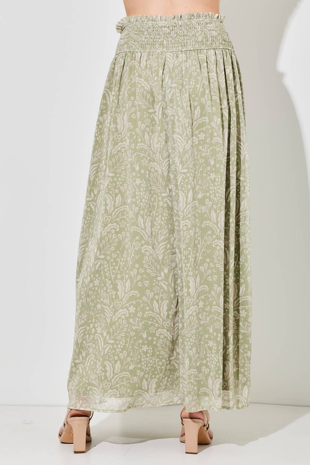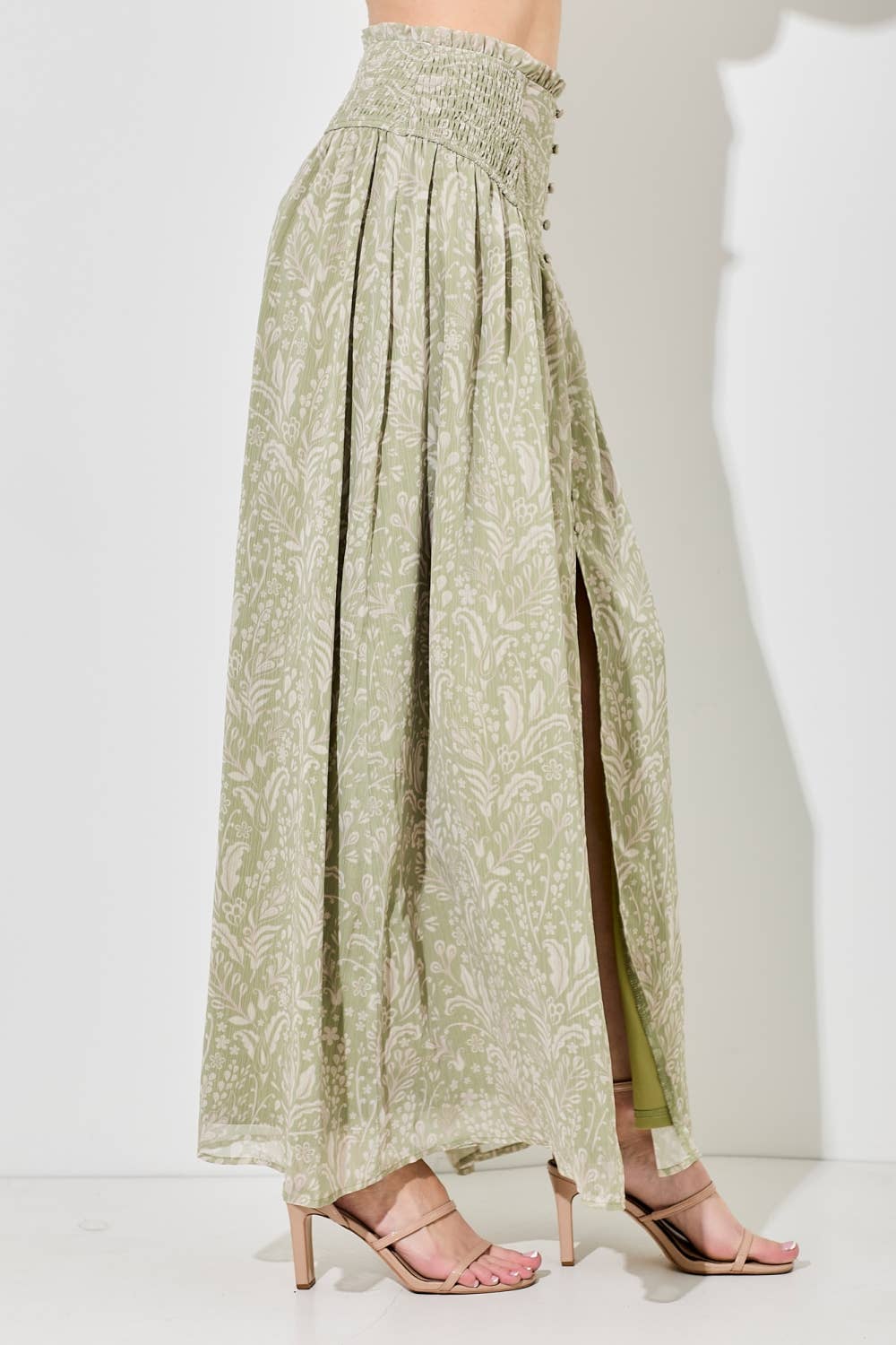 PRINTED BUTTON UP MAXI SKIRT W SLIT: LT SAGE