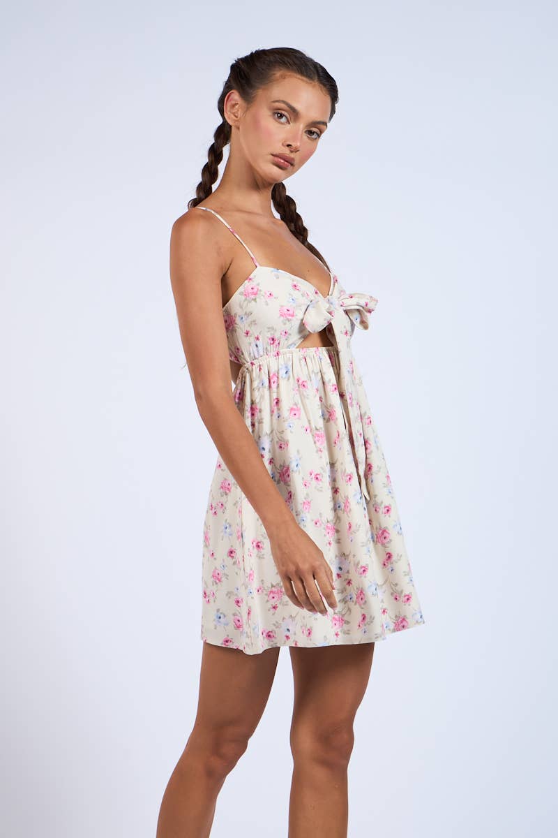 PURPLE-PINK FLORAL FRONT TIE OPEN BACK MINI DRESS: Berries Floral / SM-D20679H