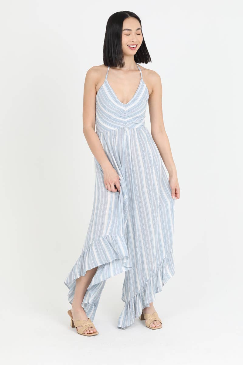 V NECK HALTER ANGLED HEM WIDE LEG JUMPSUIT