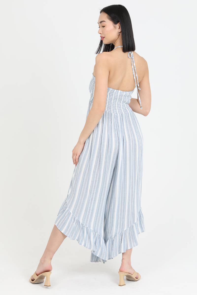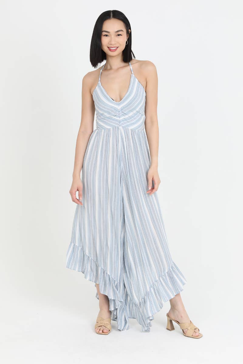 Q5X21-ML14 V NECK HALTER ANGLED HEM WIDE LEG JUMPSUIT