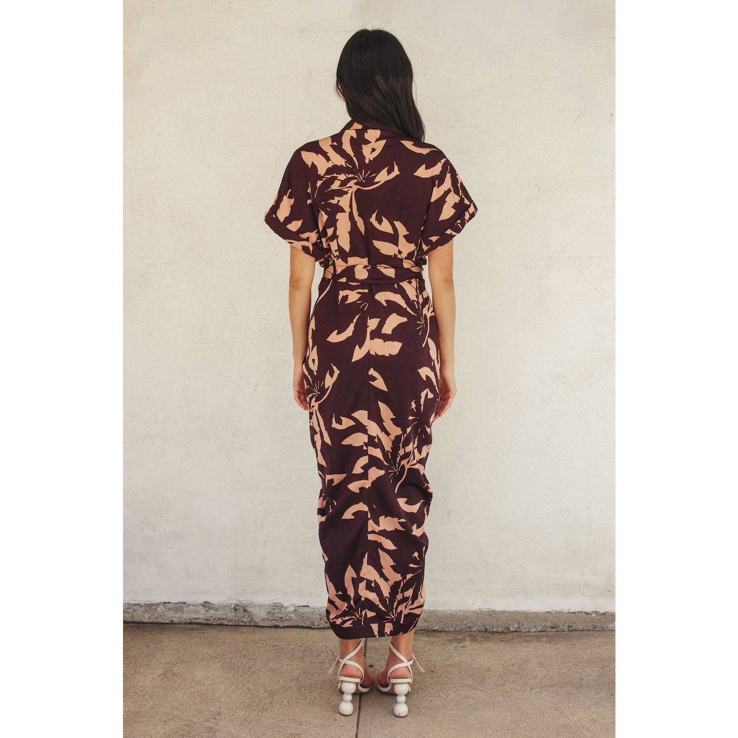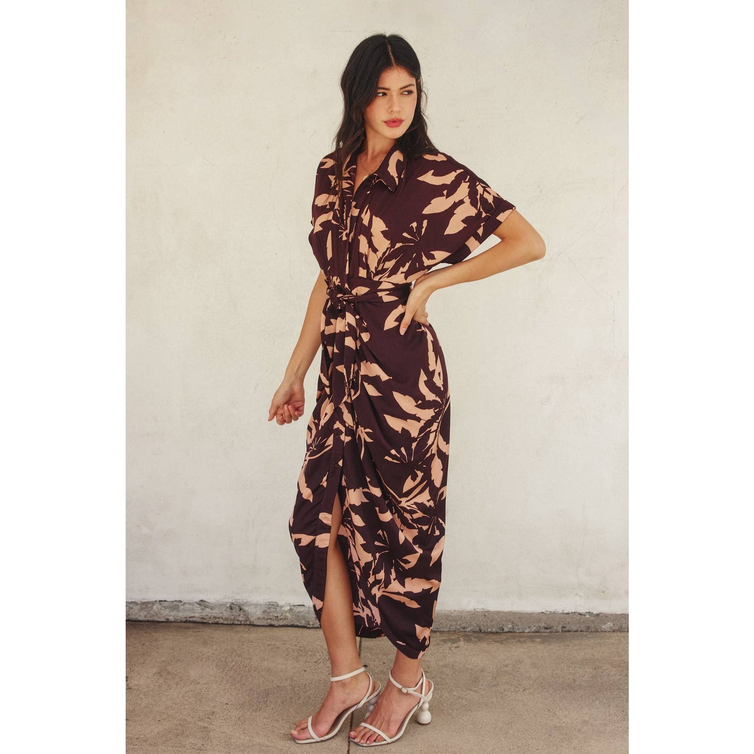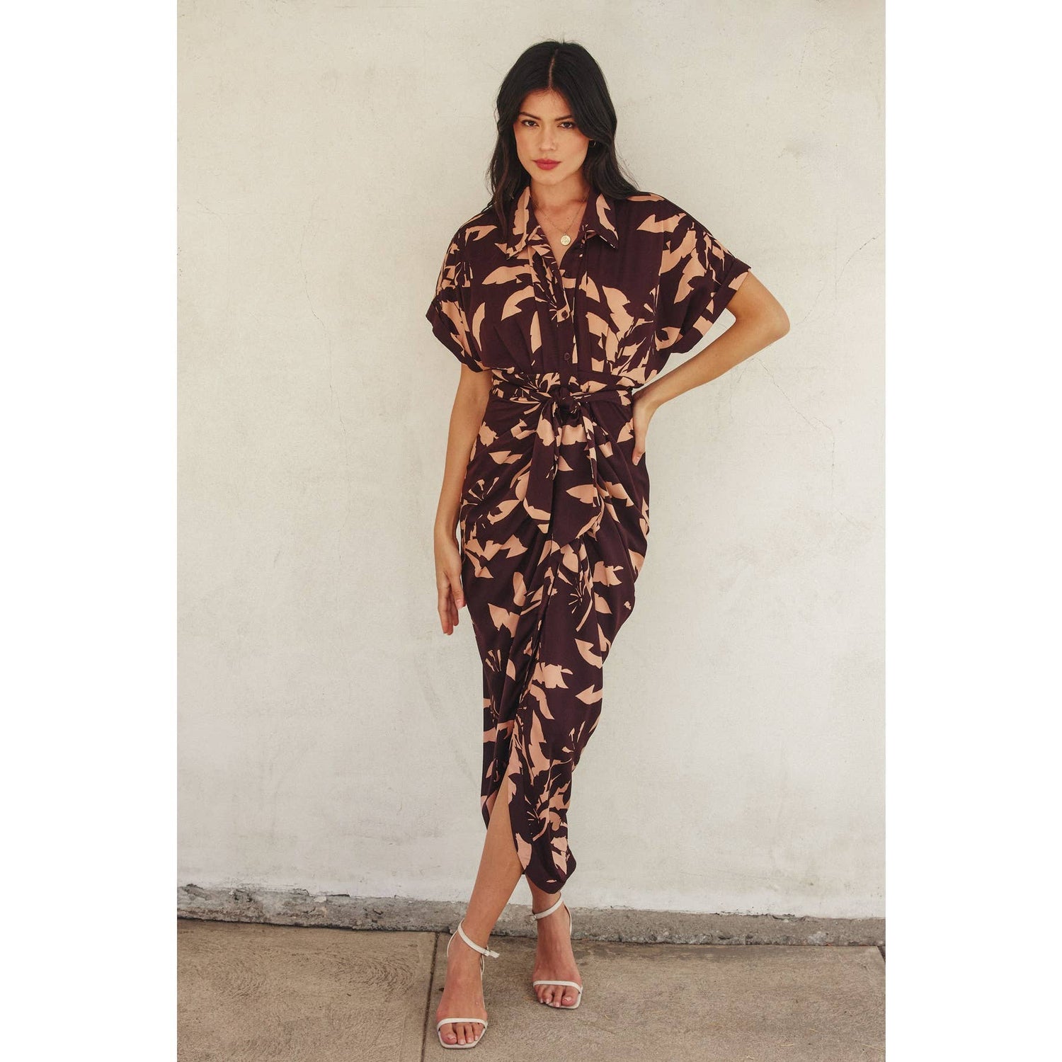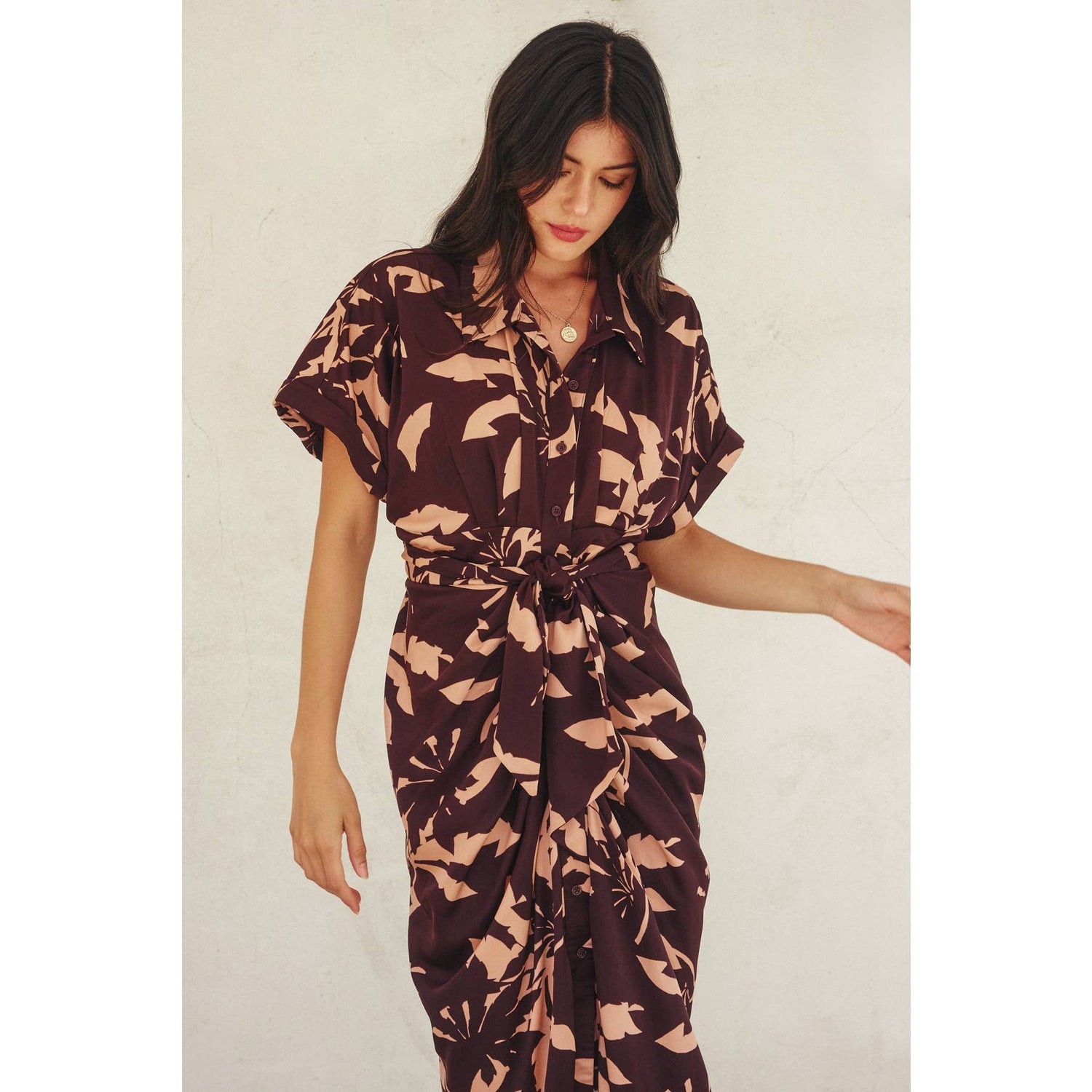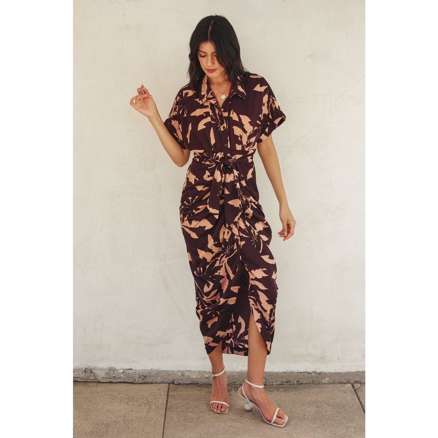 Leafy print shirt dress with ruching details. Model is 5'8" and wearing size Small. - Collared - Button down - Ruching detail - Rolled up short sleeves - Sash belt - Unlined Shell: 100% Polyester Lining: None Available By DRIED PALM : 10/11/2024