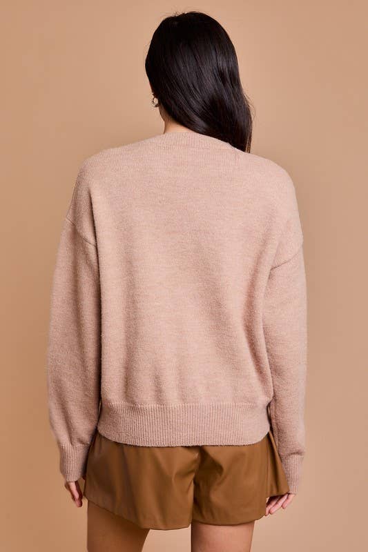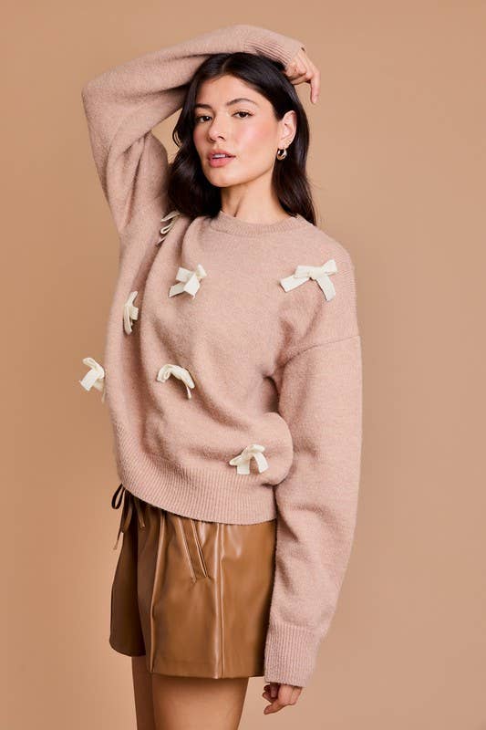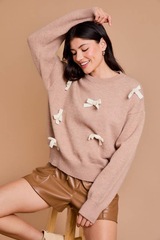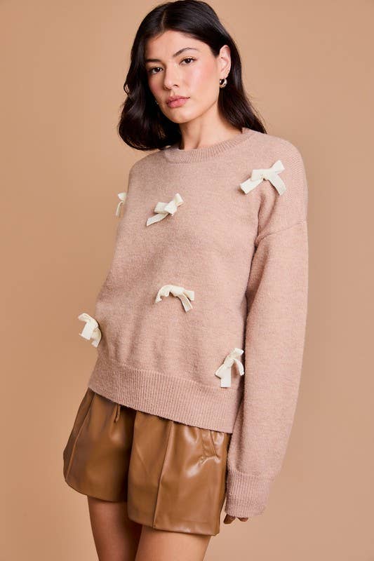 Round Neck Long Sleeve Bows Sweater: Taupe-cream / MWT7241G