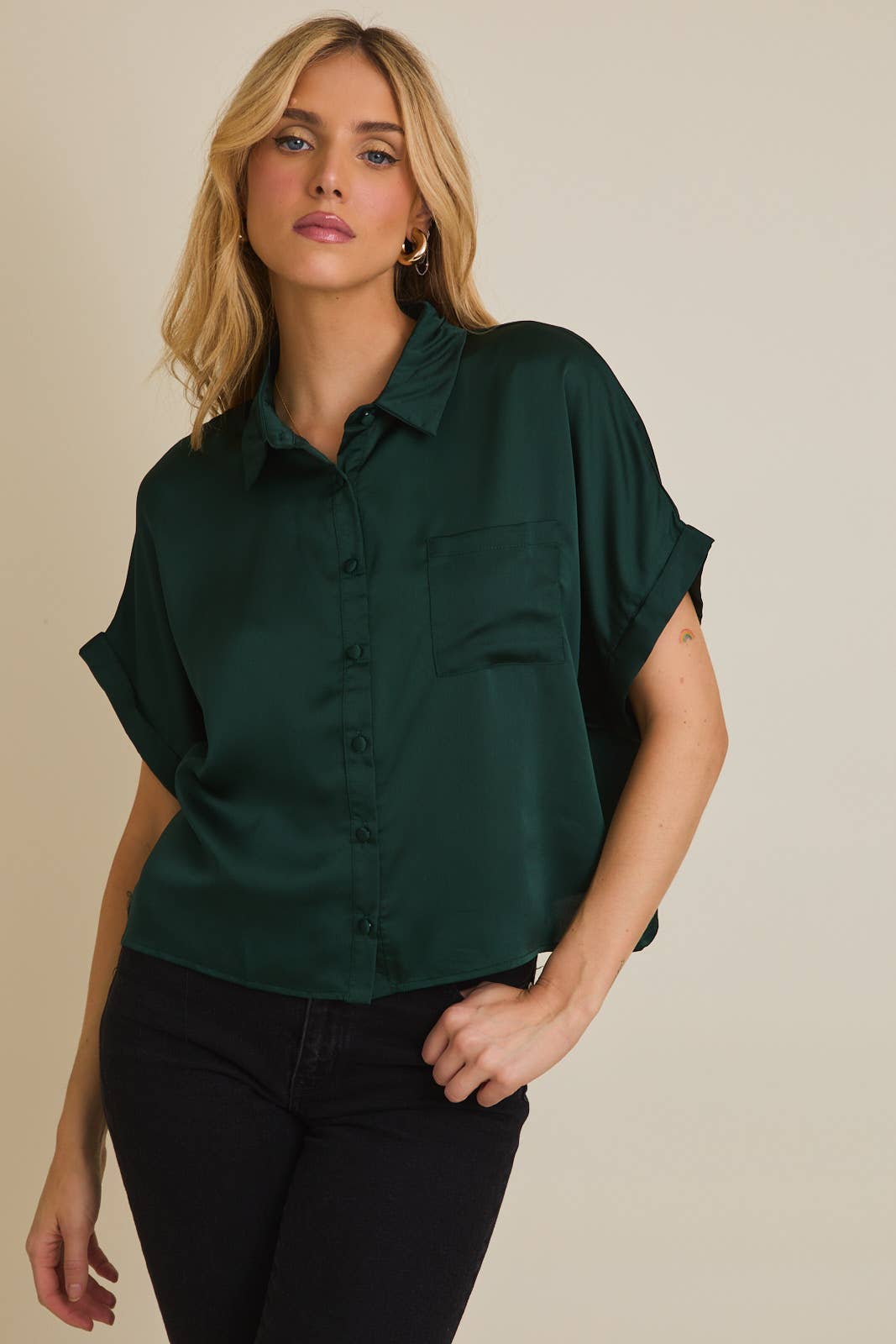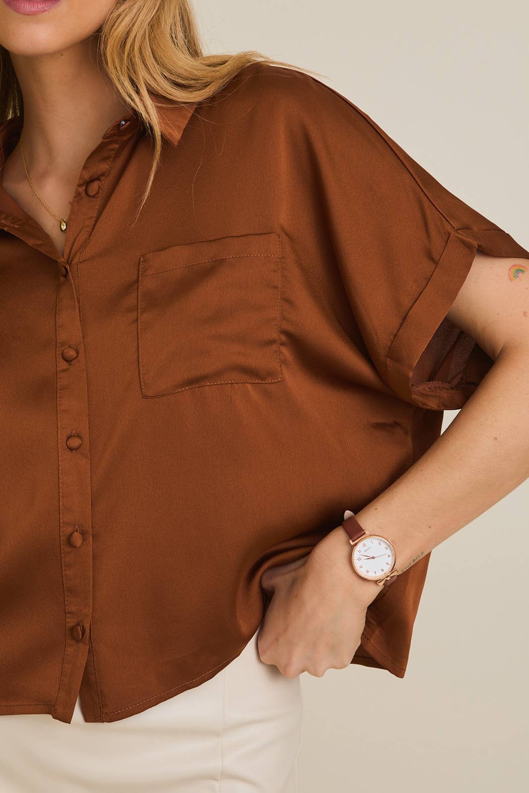 SATIN BOXY BUTTON DOWN BLOUSE: Camel / JT2060