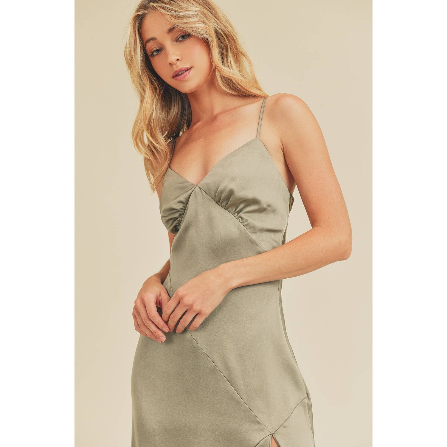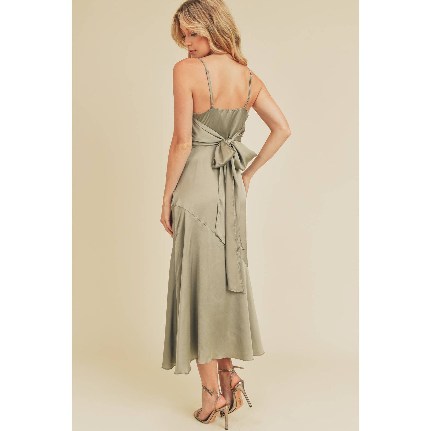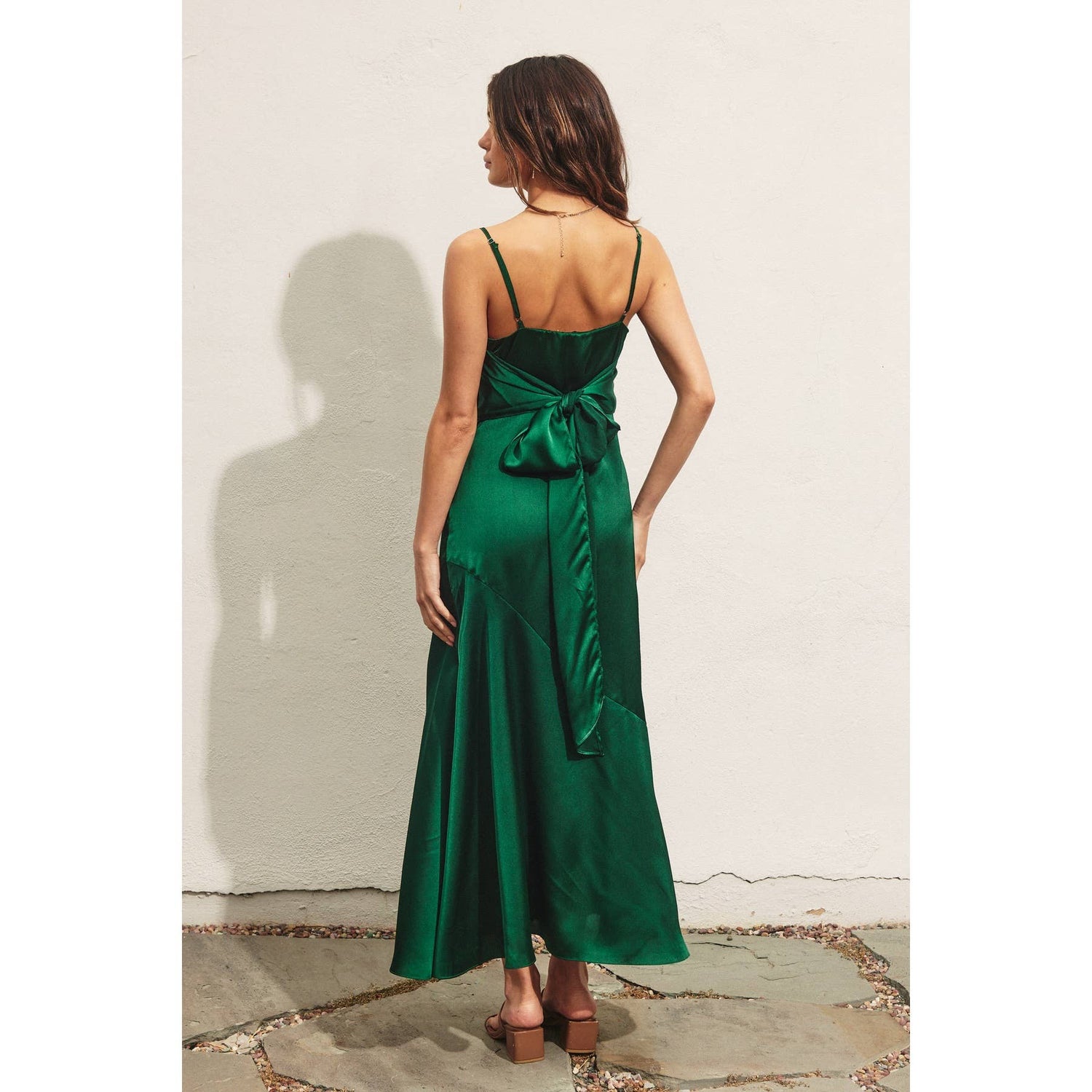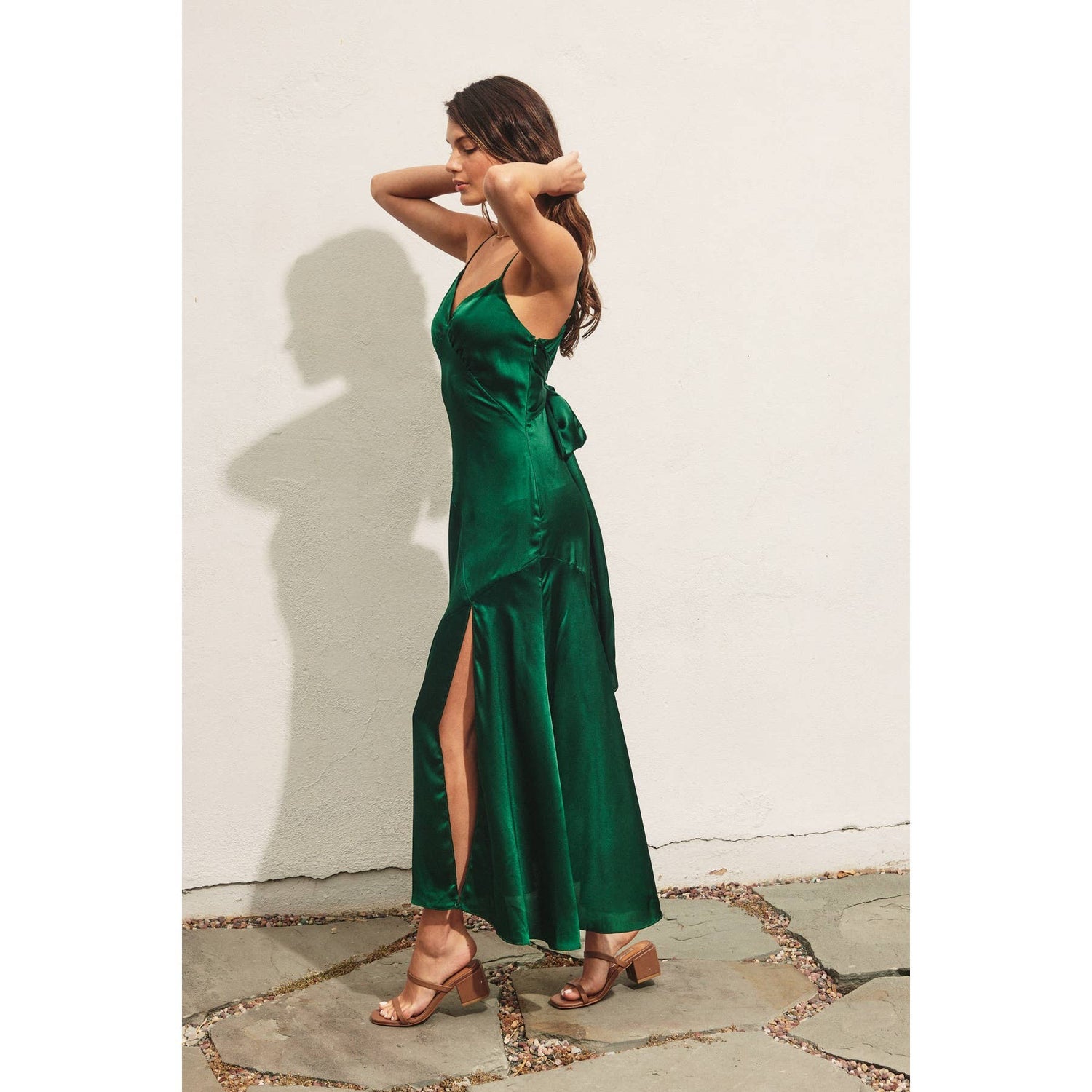 Satin midi slip dress featuring a plunging neckline, diagonal seam, flared hem, front slit and tying sash at back. Model(except EMERALD, DARK SAPPHIRE) is 5'10", Model in EMERALD, DARK SAPPHIRE is 5'7". They are wearing size Small.