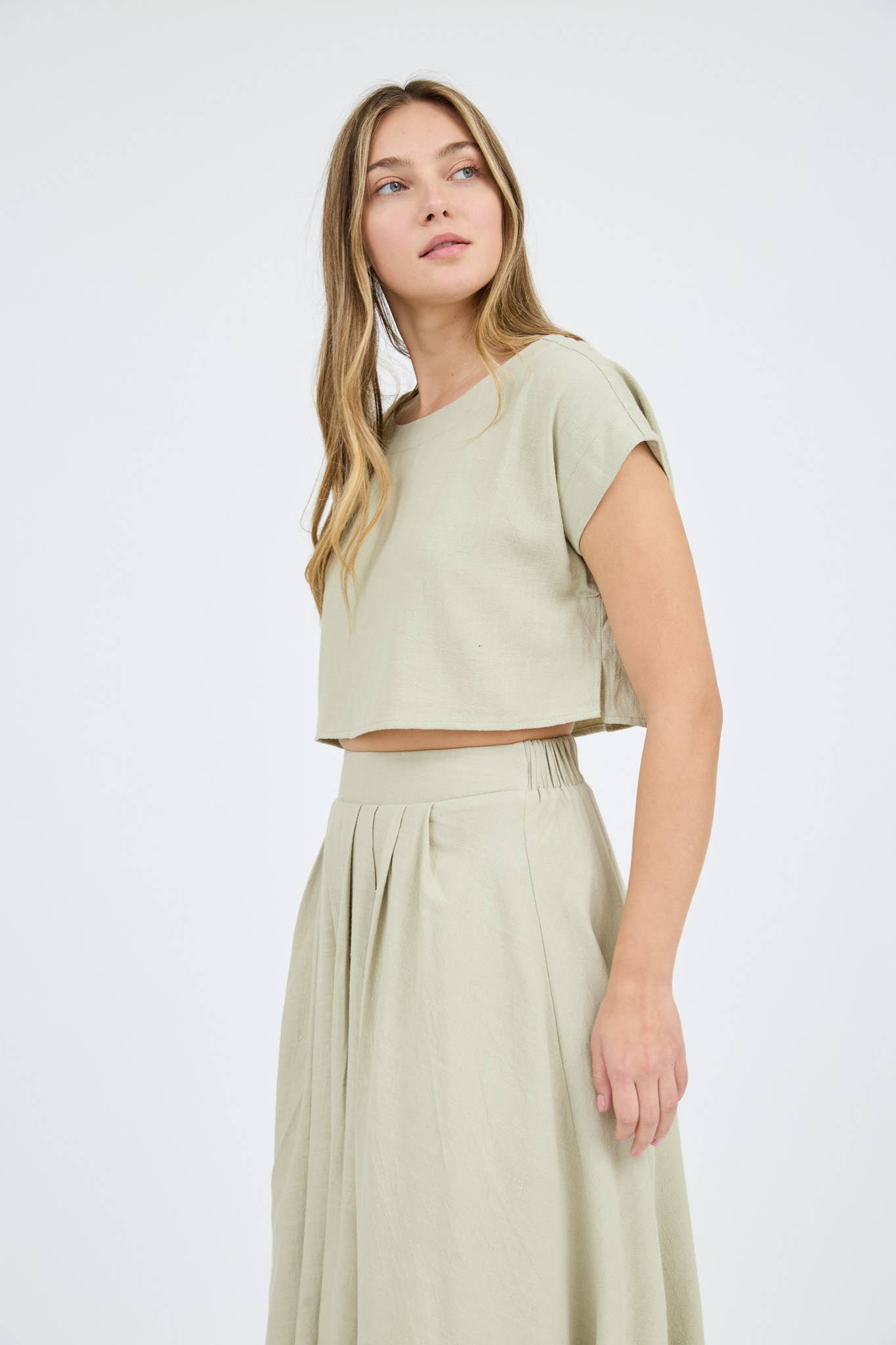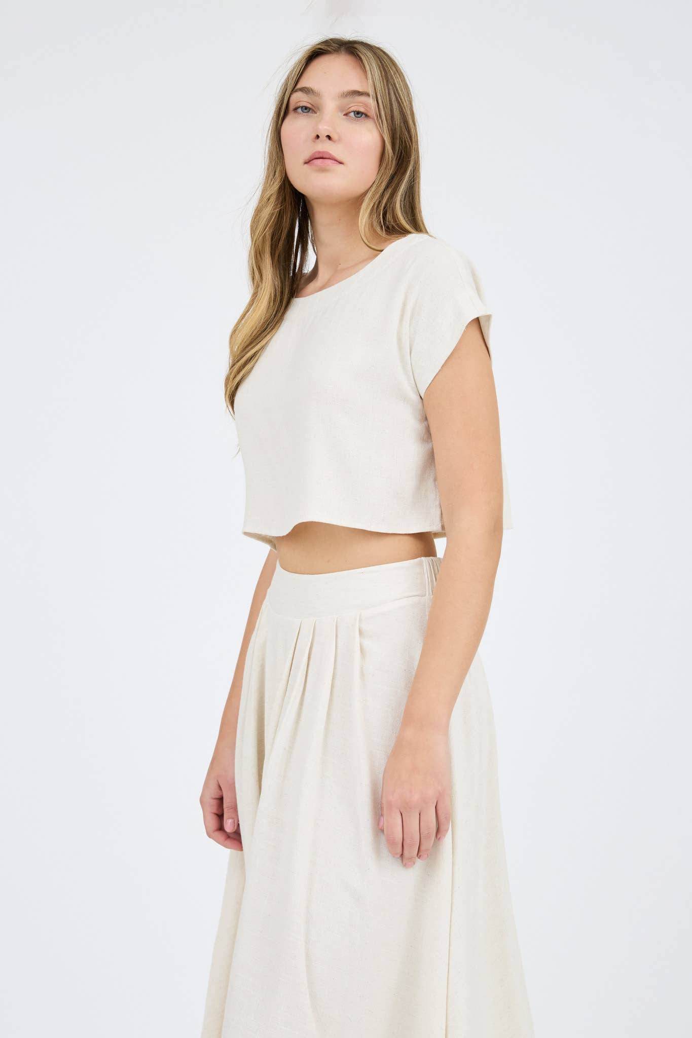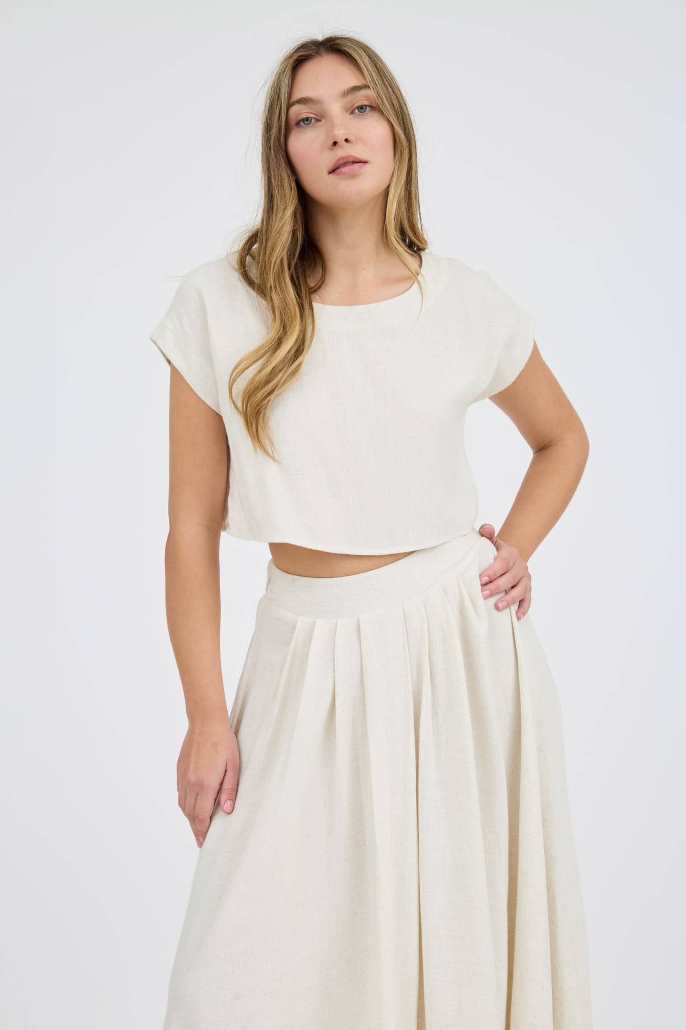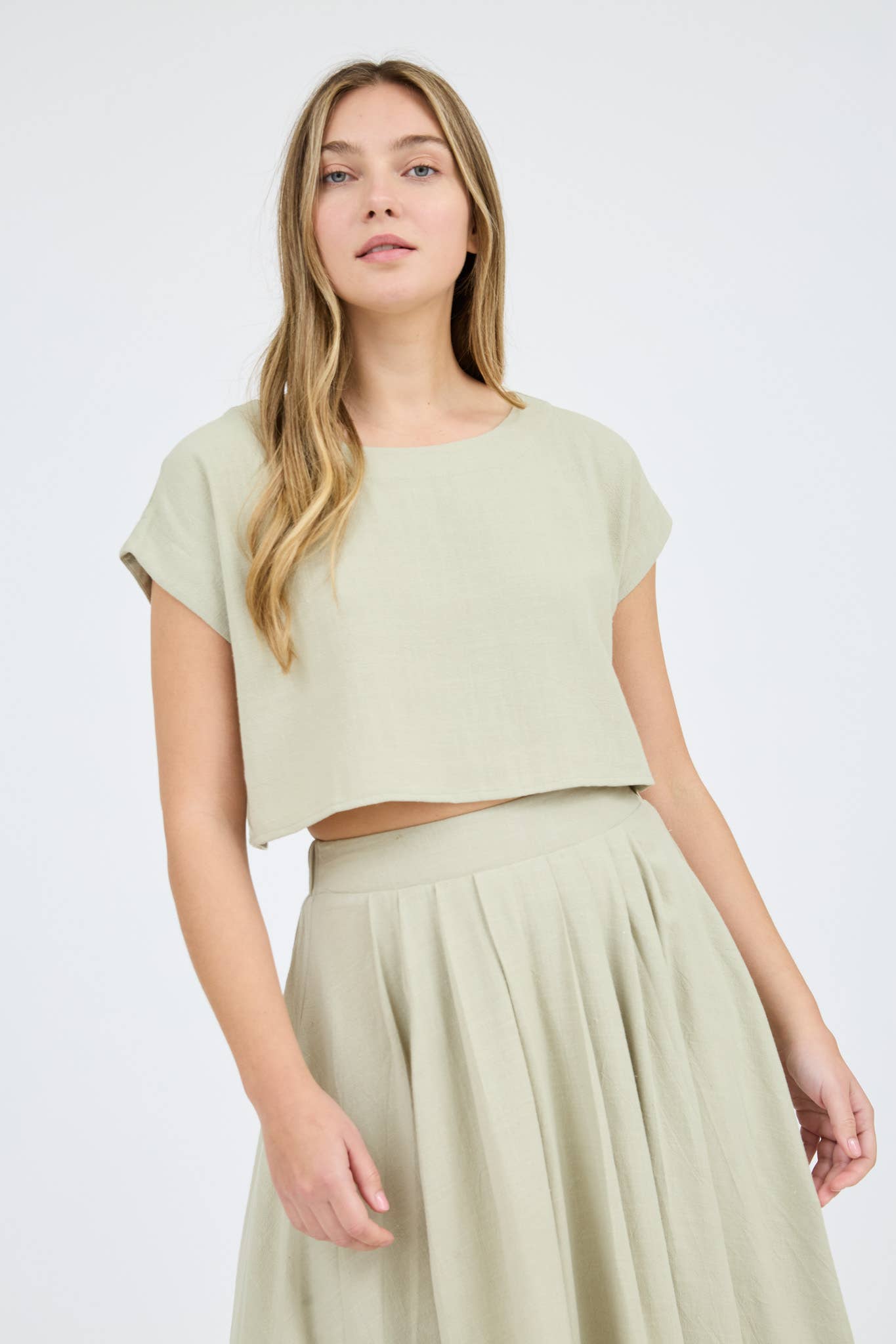 BOAT NECK SHORT SLEEVES CROPPED BOXY FIT LINEN SOLID WOVEN TOP 85%RAYON 15%LINEN