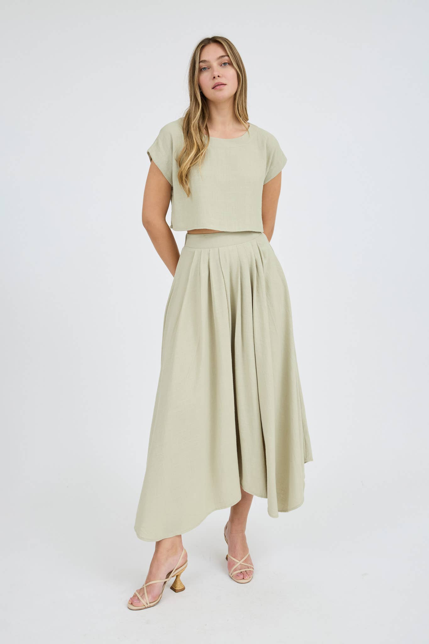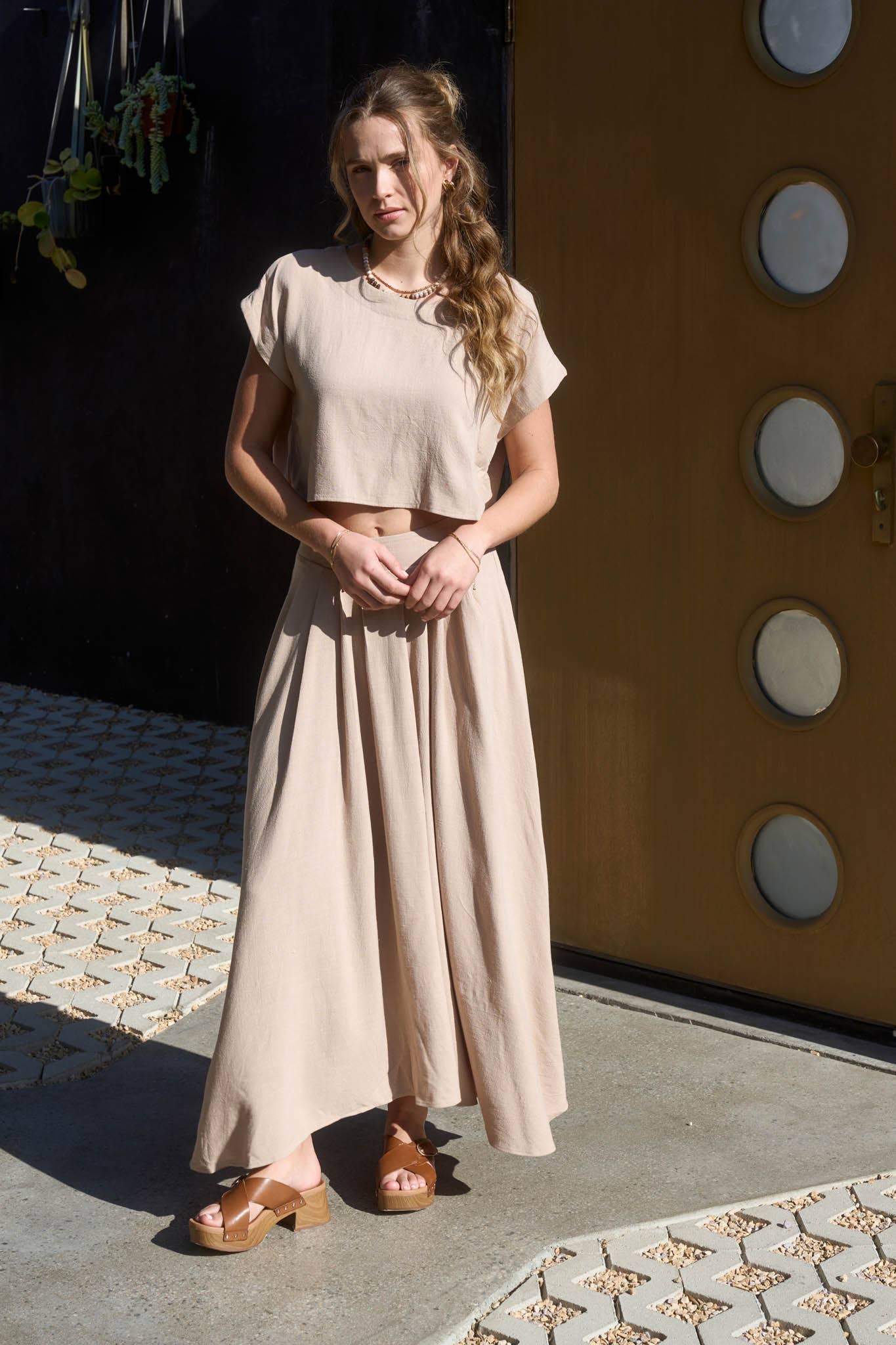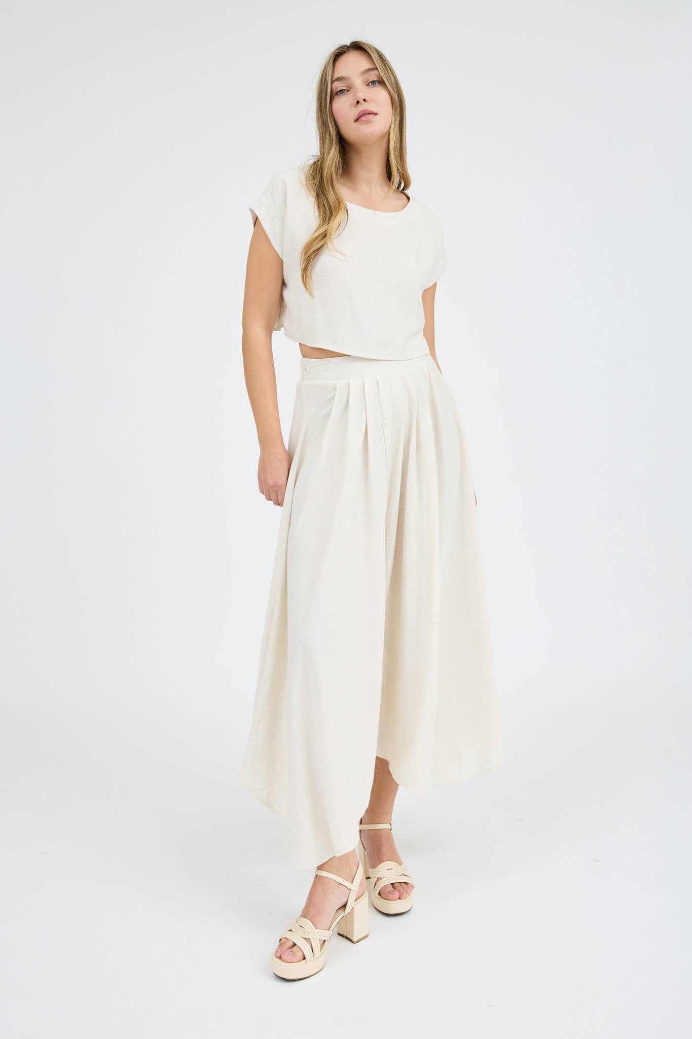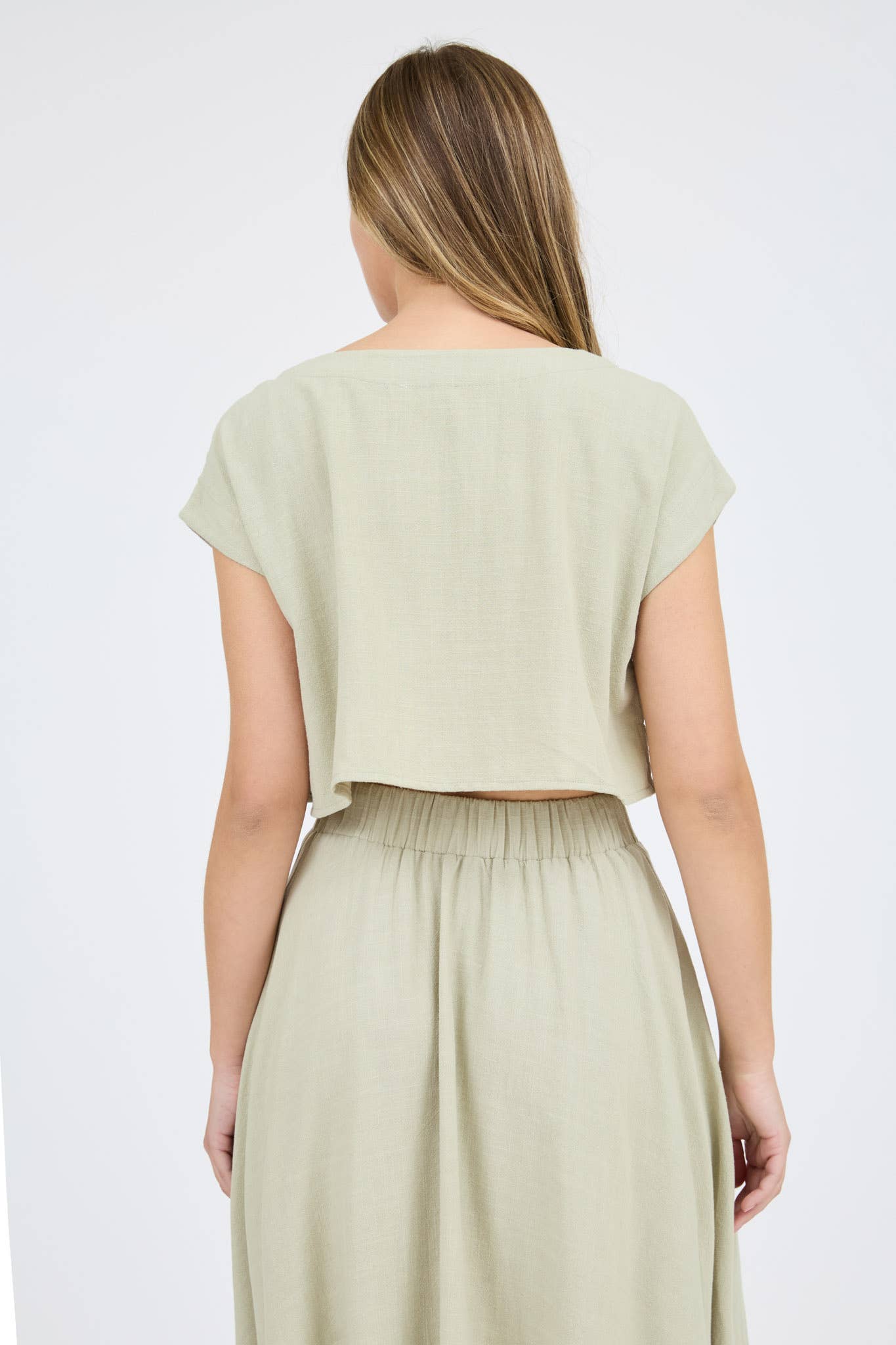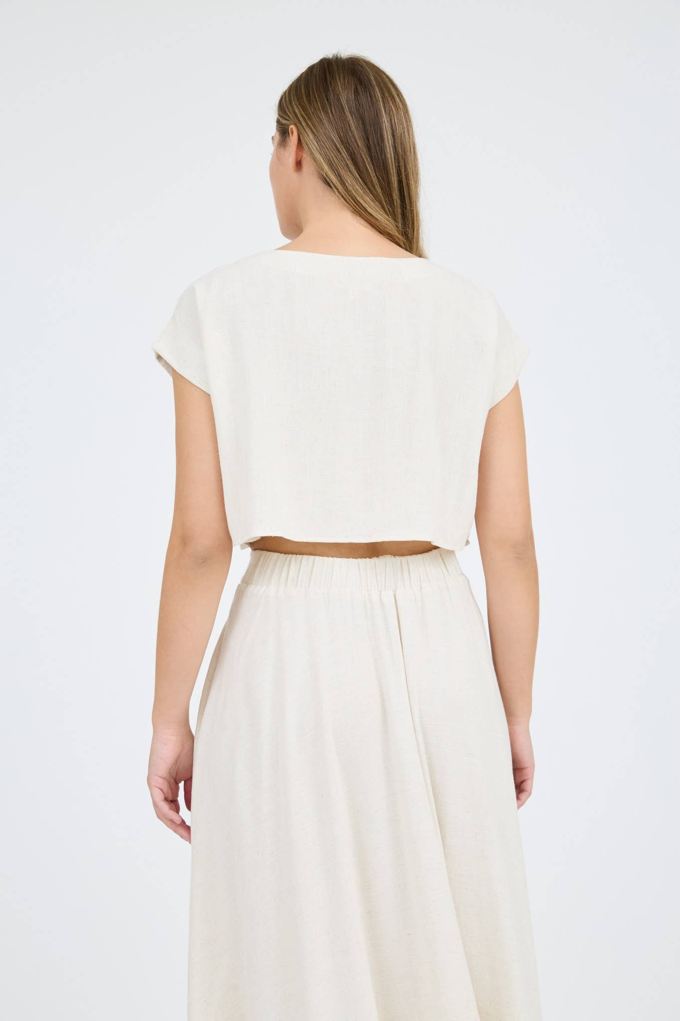 BOAT NECK SHORT SLEEVES CROPPED BOXY FIT LINEN SOLID WOVEN TOP 85%RAYON 15%LINEN