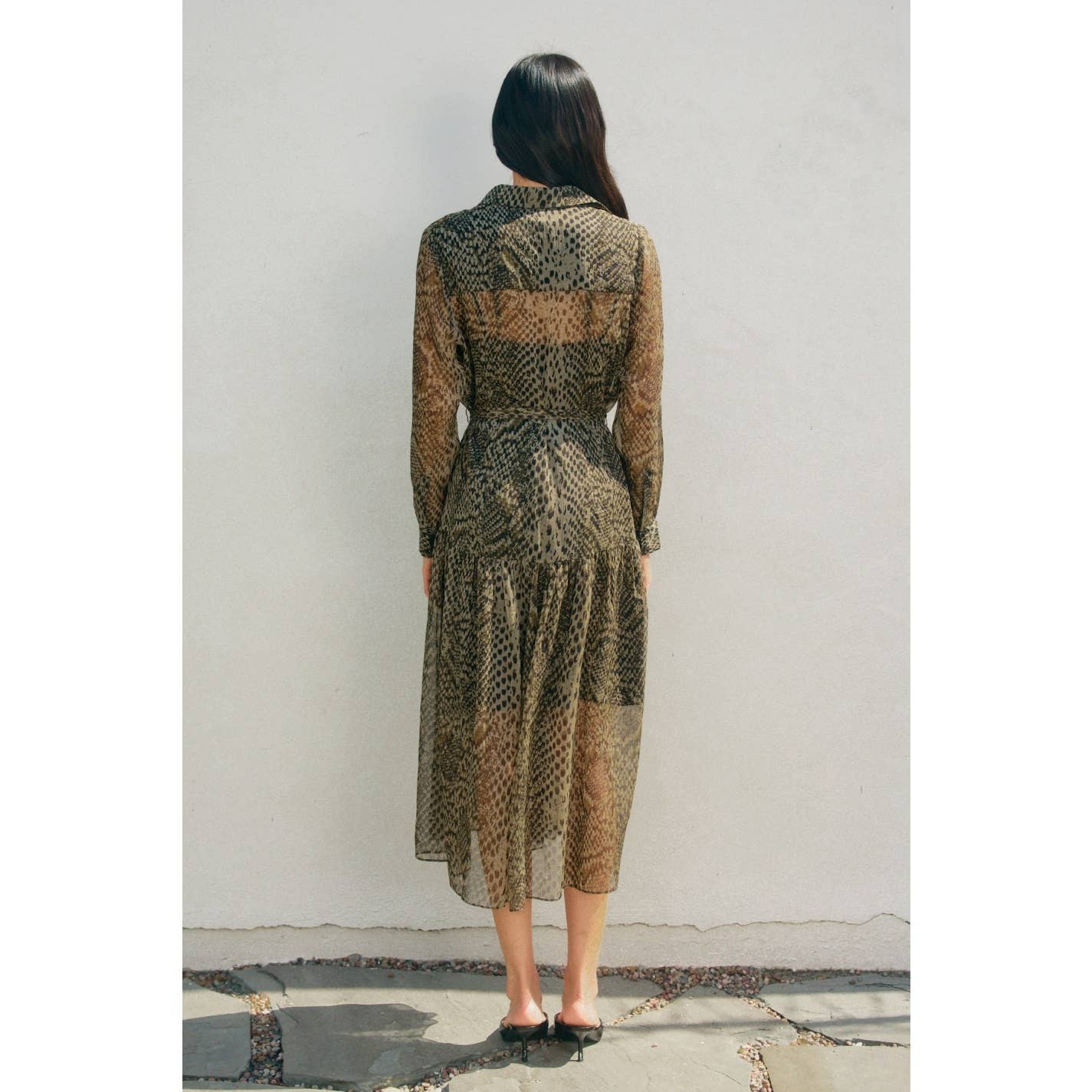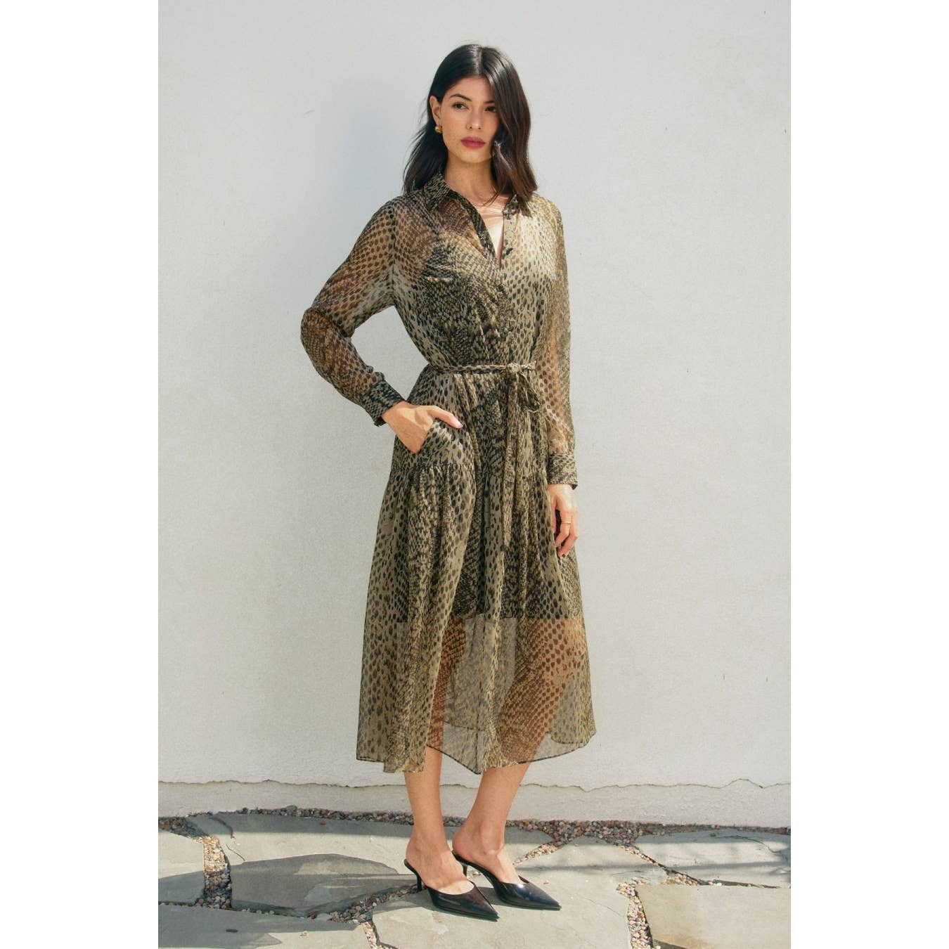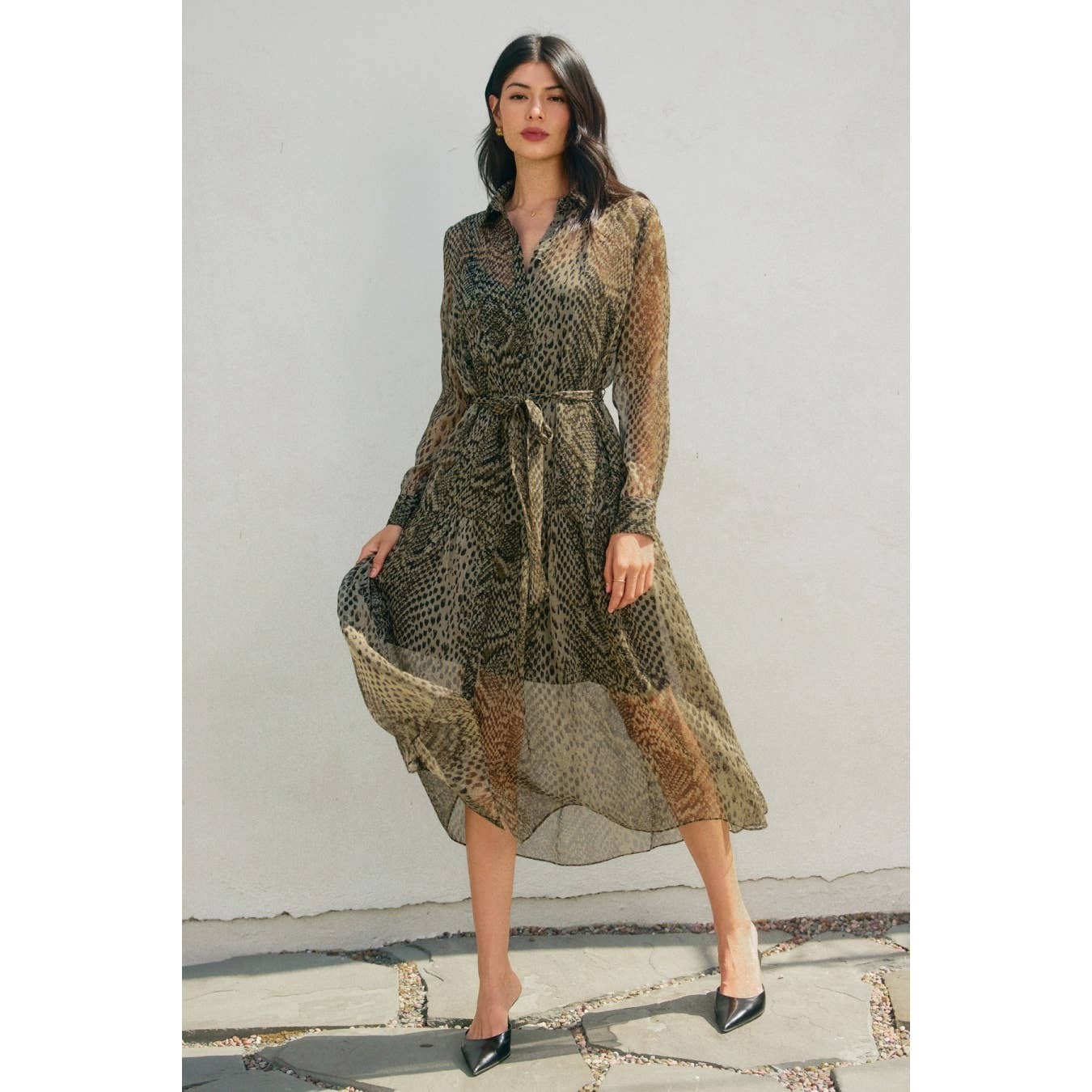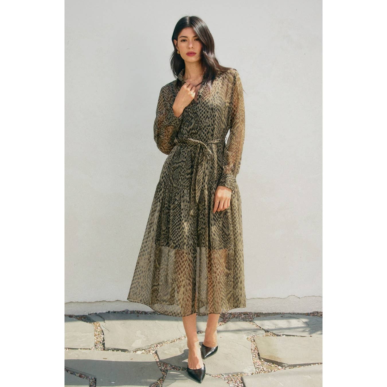 Animal printed satin midi dress with the waist belt. Model is 5'8" and wearing size Small.