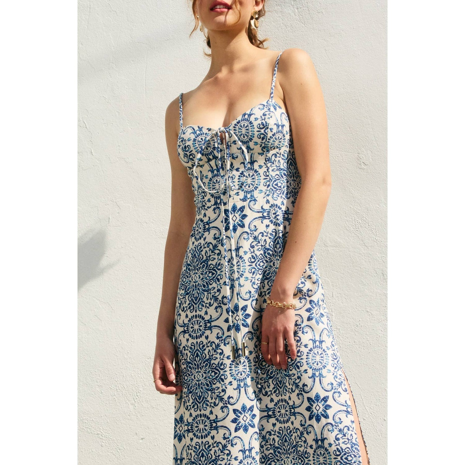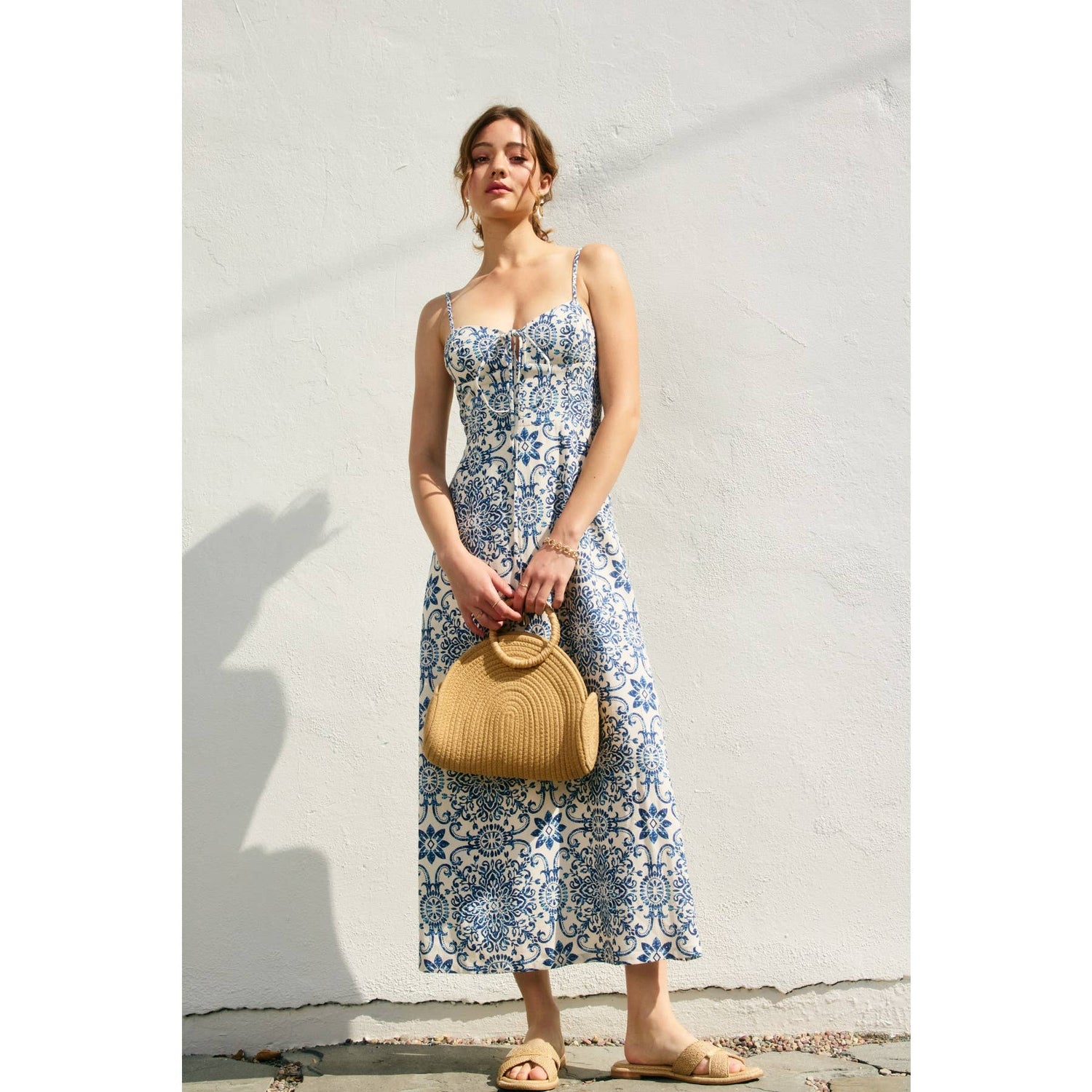 Tile inspired print front V cut out sleeveless maxi dress. Model is 5'6" and wearing size Small.