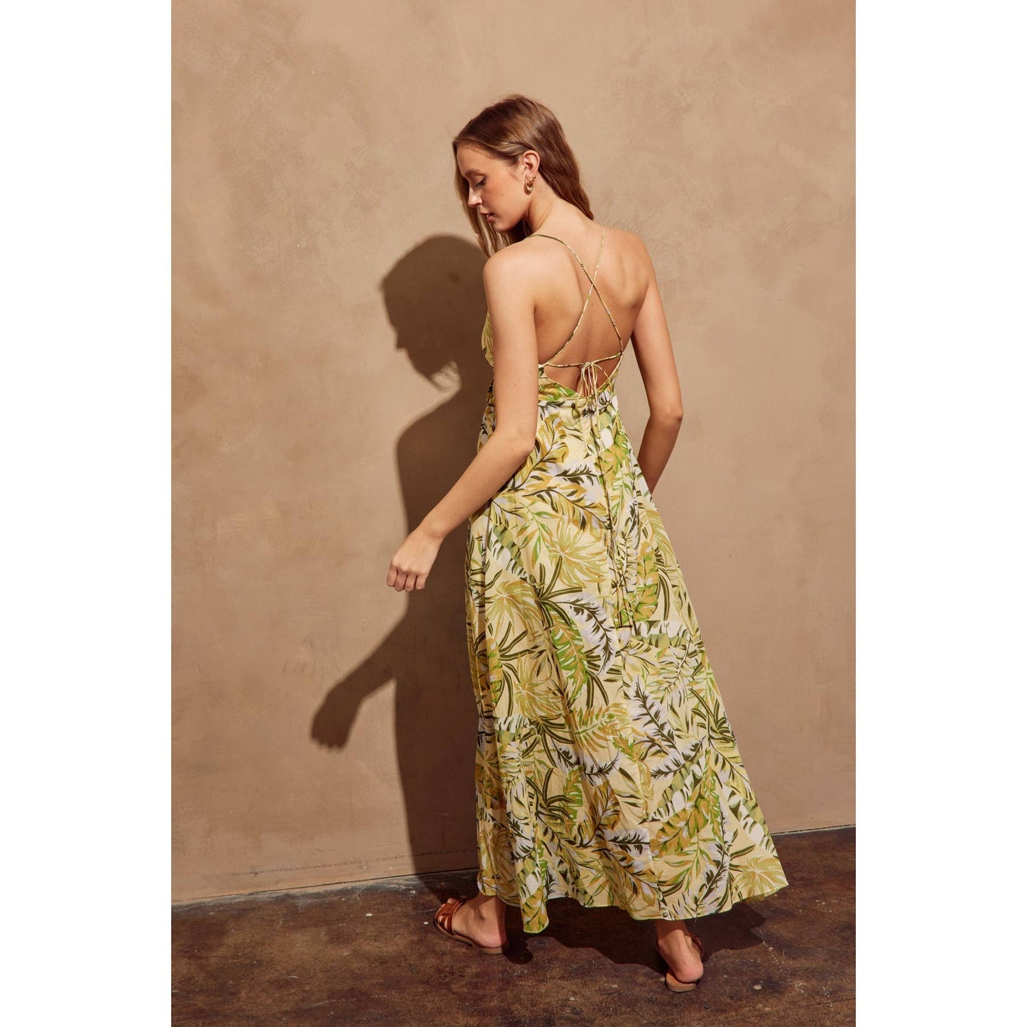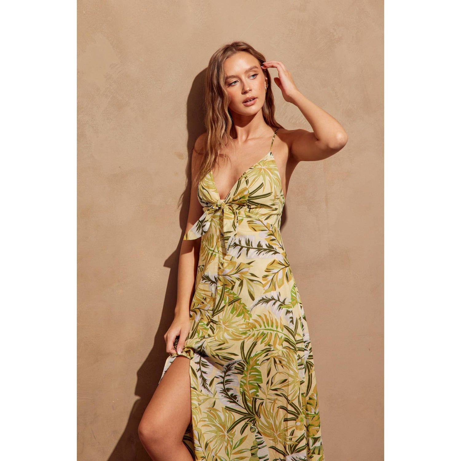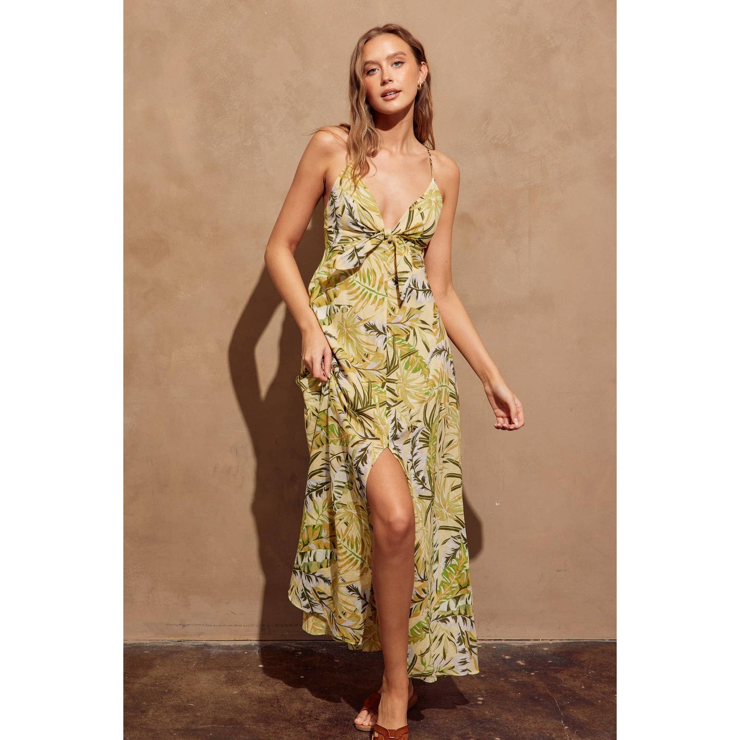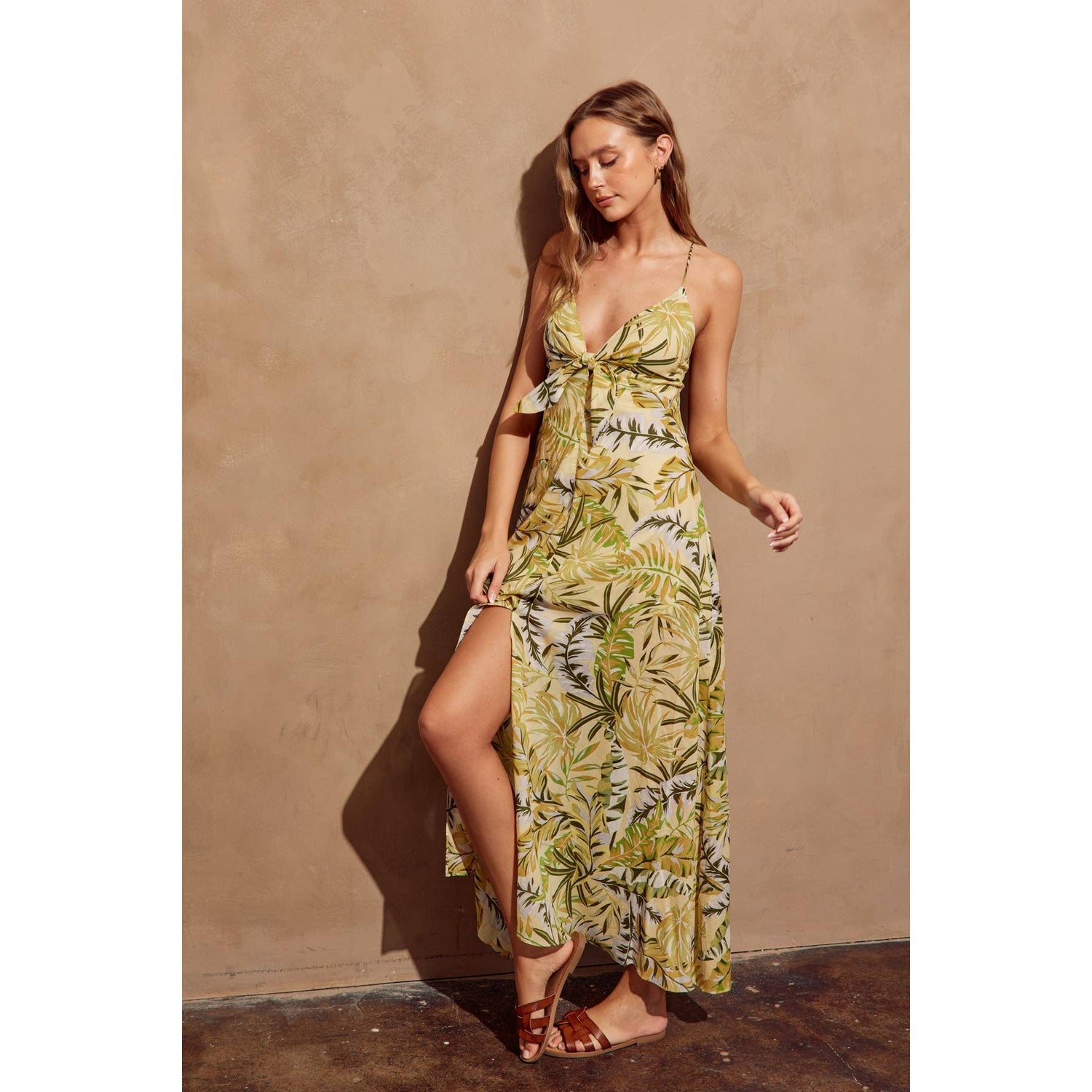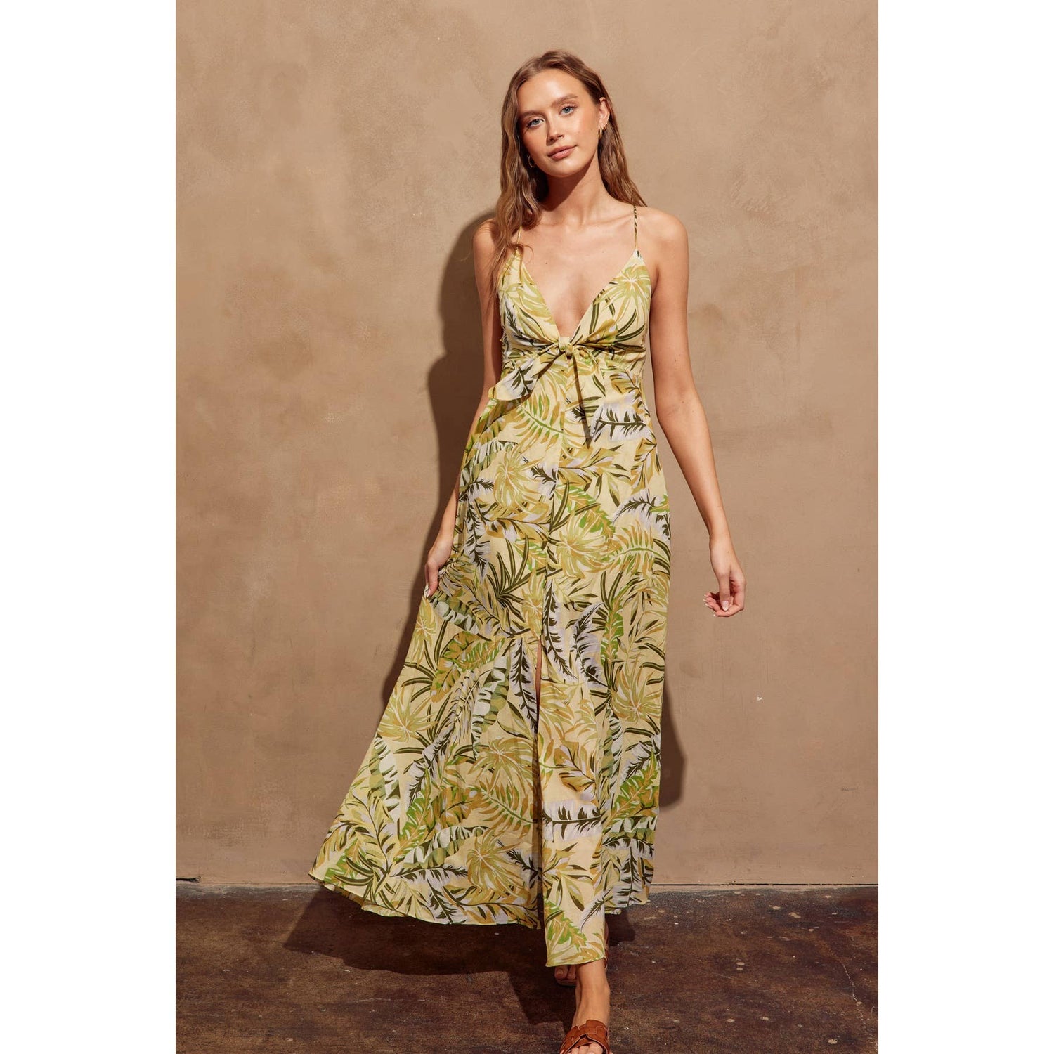 Leafy print maxi dress with a knot detail. Model is 5'10" and wearing size Small.