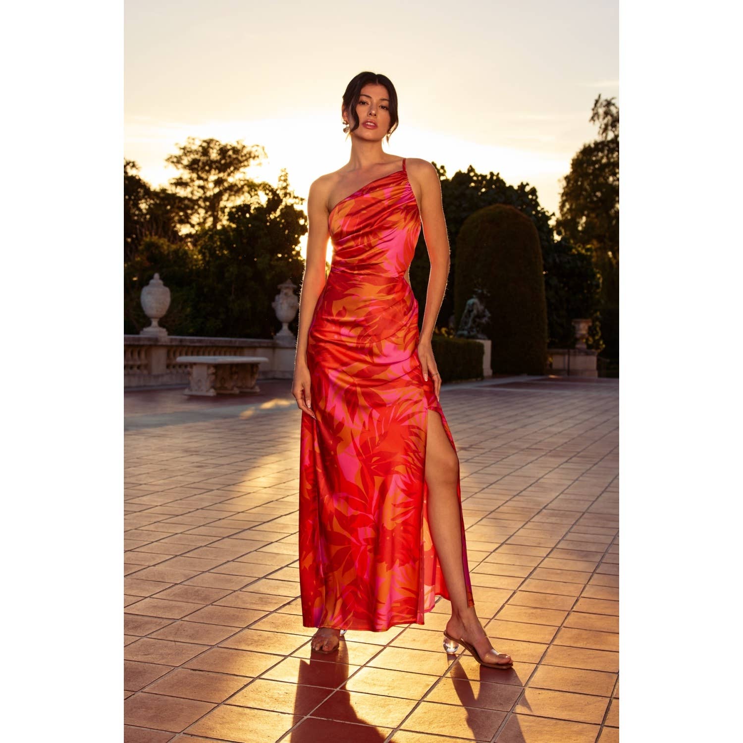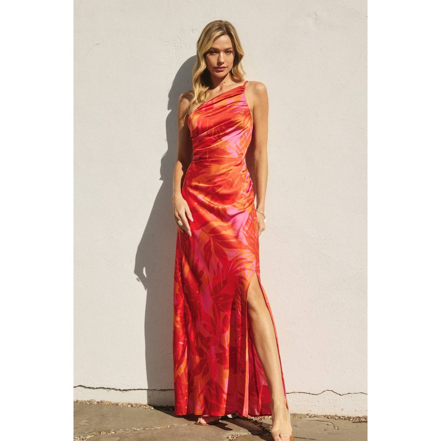 Sunset Lover One Shoulder Ruched Maxi Dress: FLAME SCARLET / FD12686-P1931_1