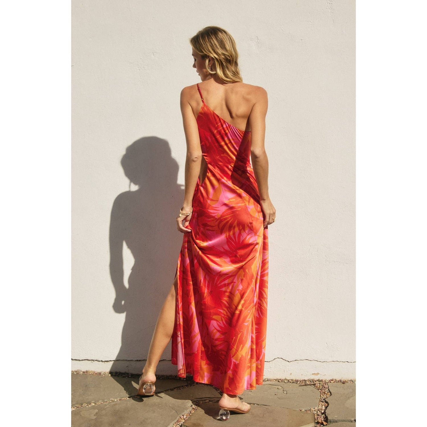 Tropical print maxi dress featuring asymmetrical details. The editorial model is 5'8" and ecomm model is 5'9". They are wearing size Small.