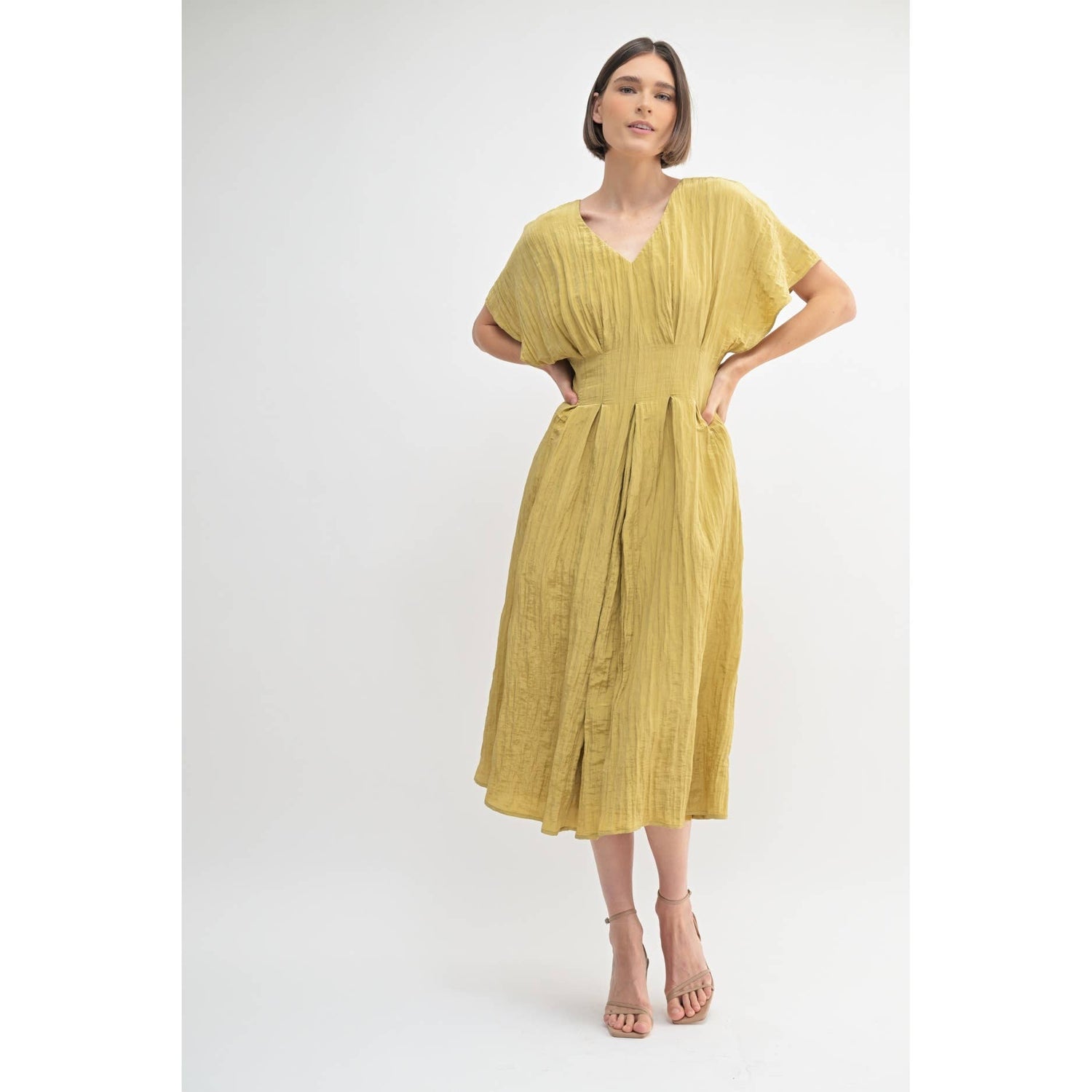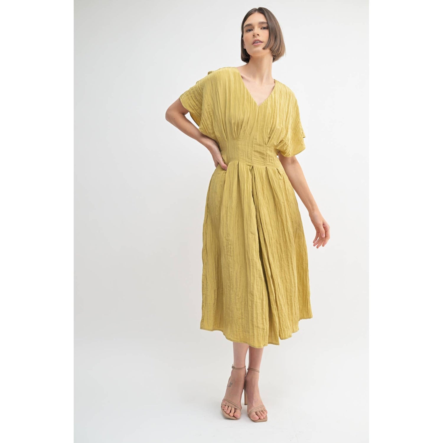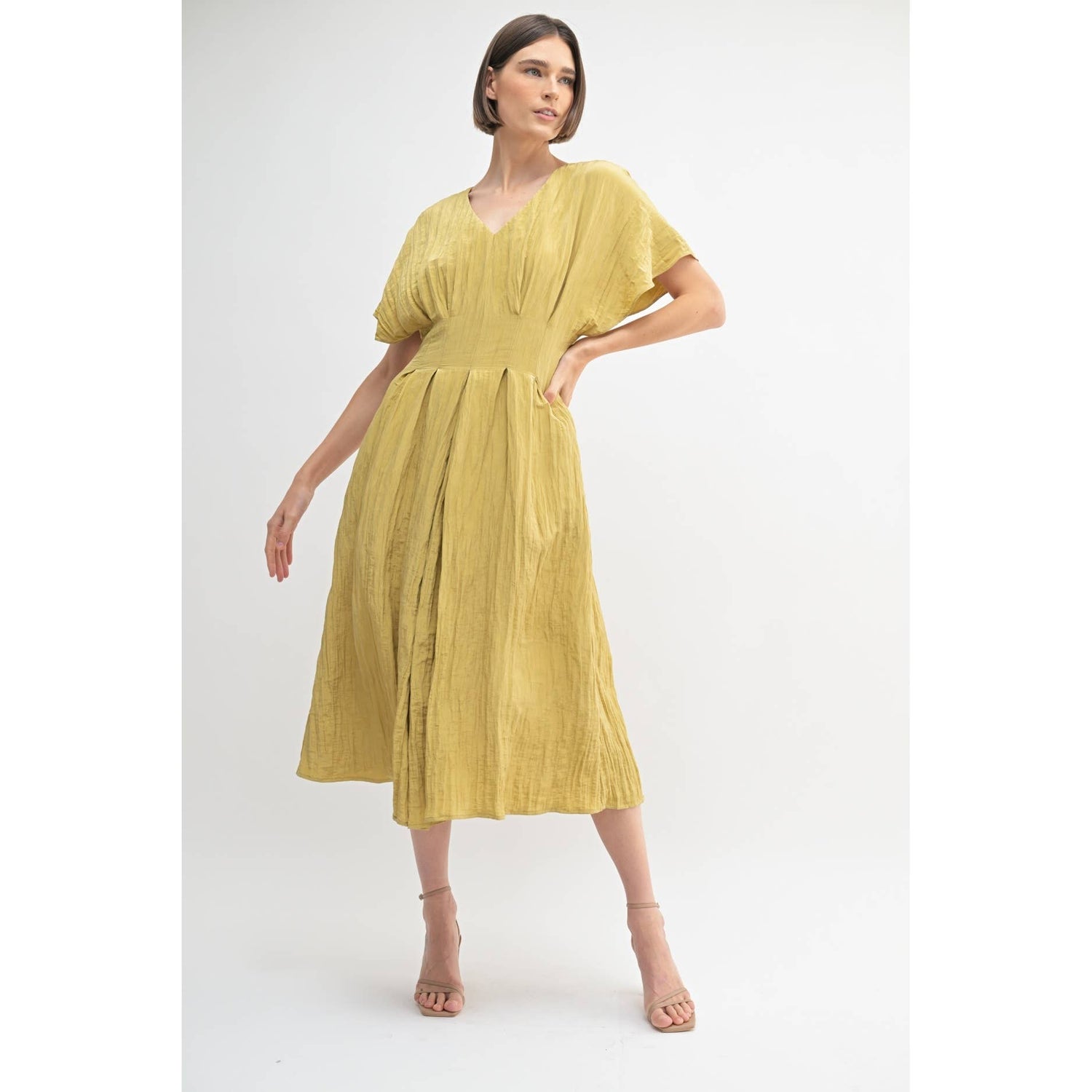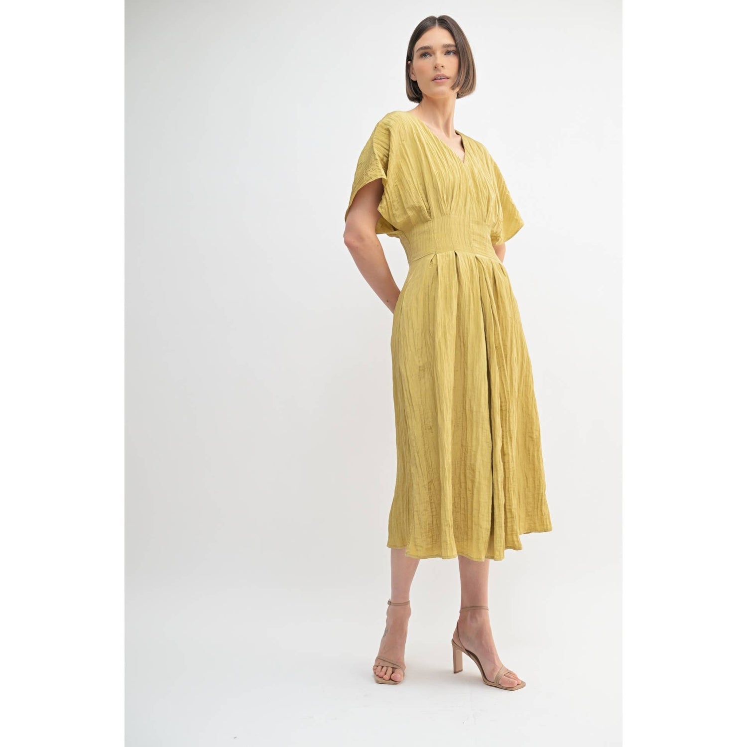 TEXTURE WOVEN V NECK PLEAT DETAIL MIDI DRESS