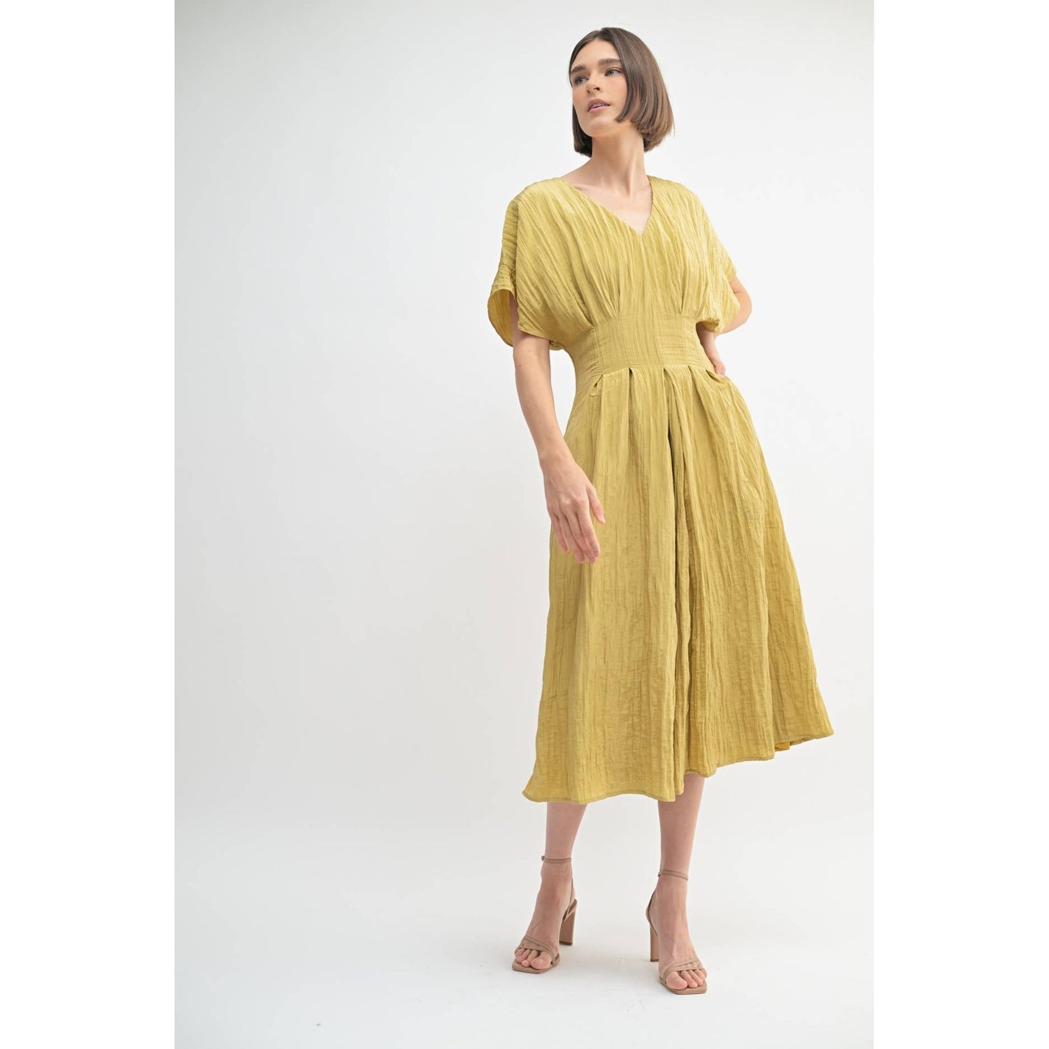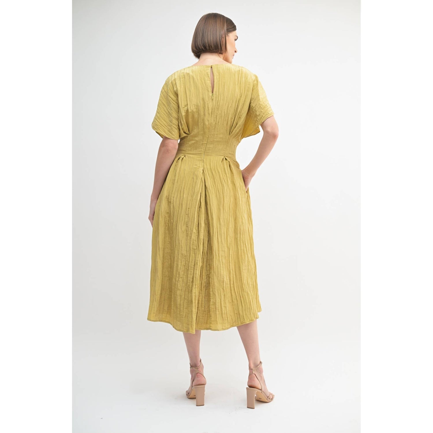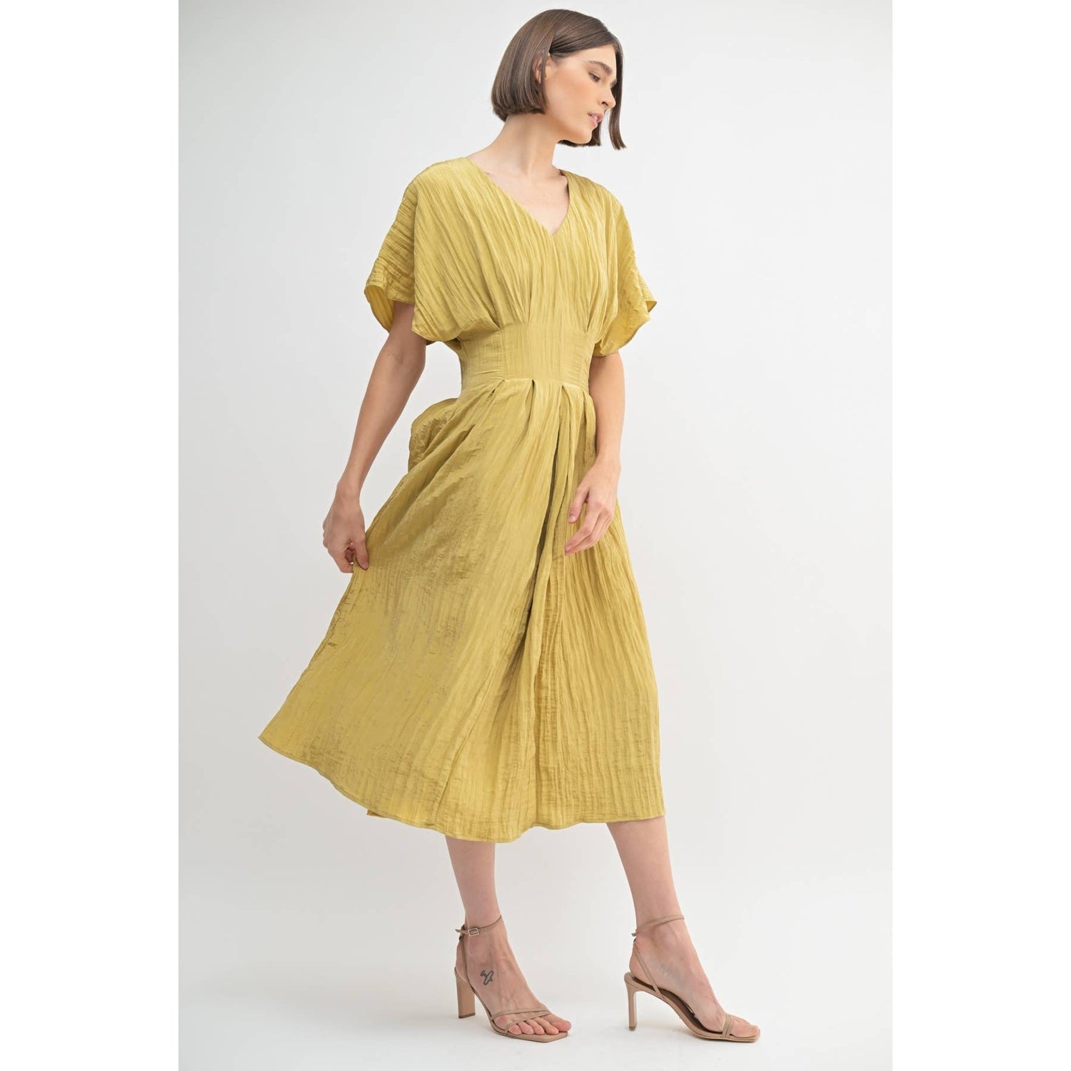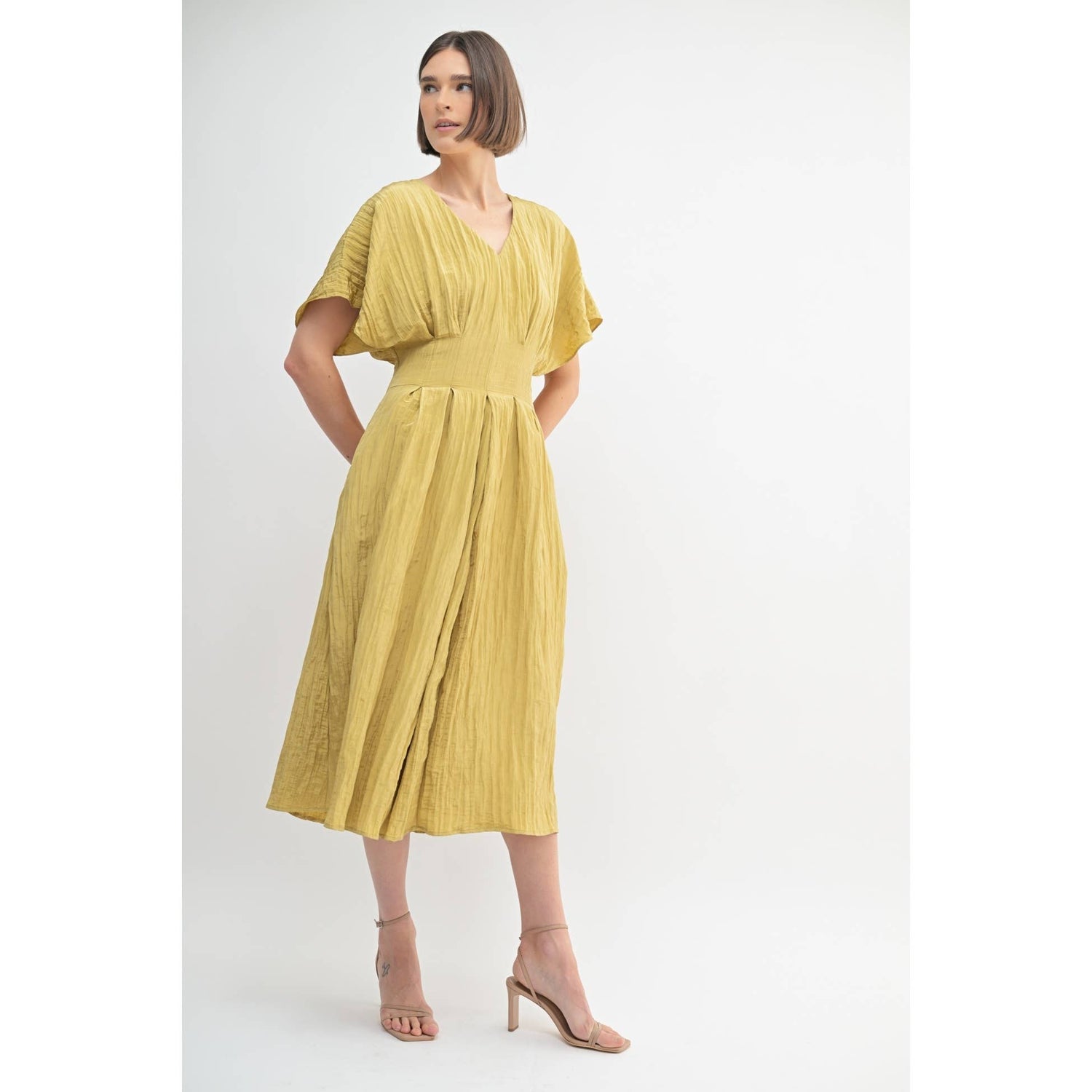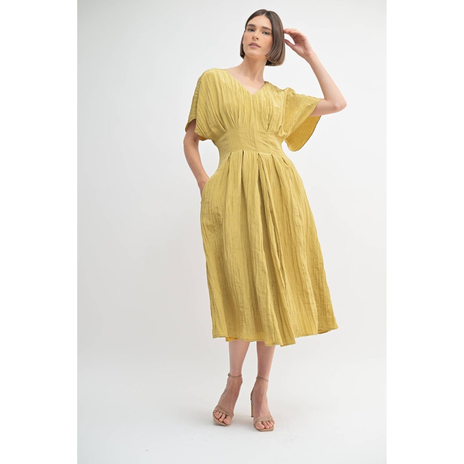 TEXTURE WOVEN V NECK PLEAT DETAIL MIDI DRESS