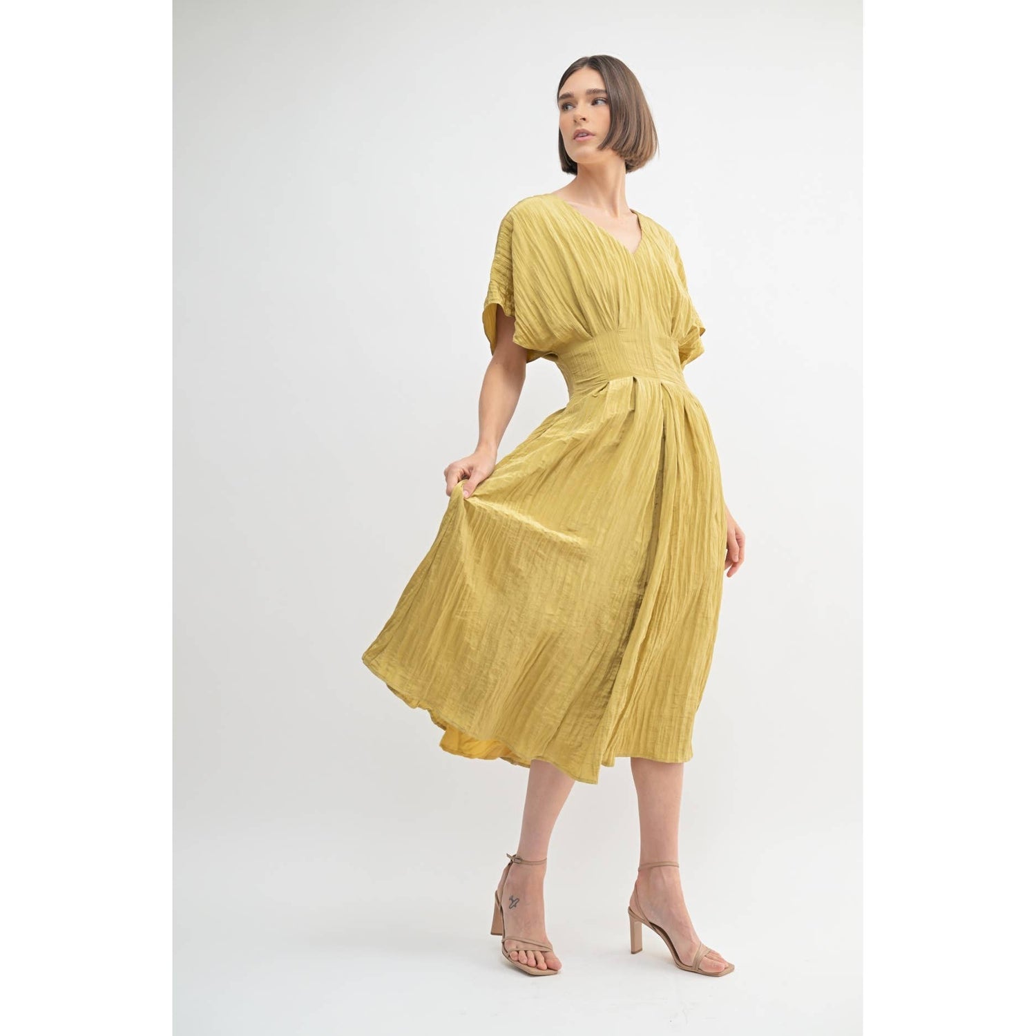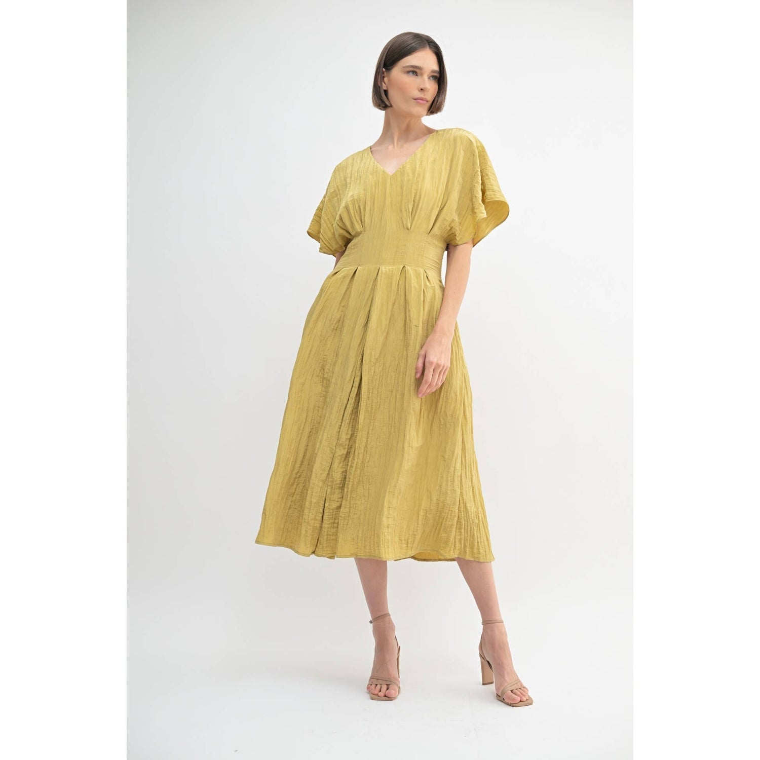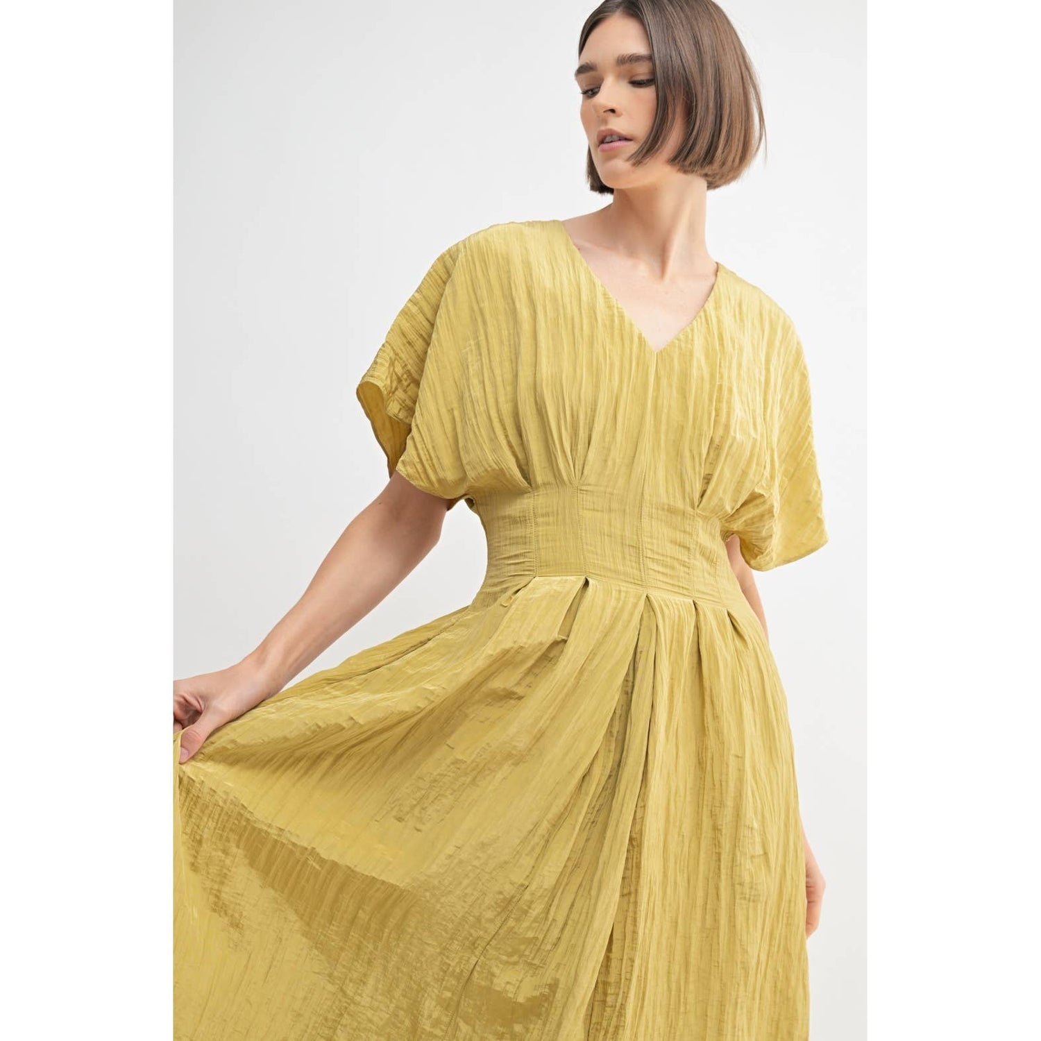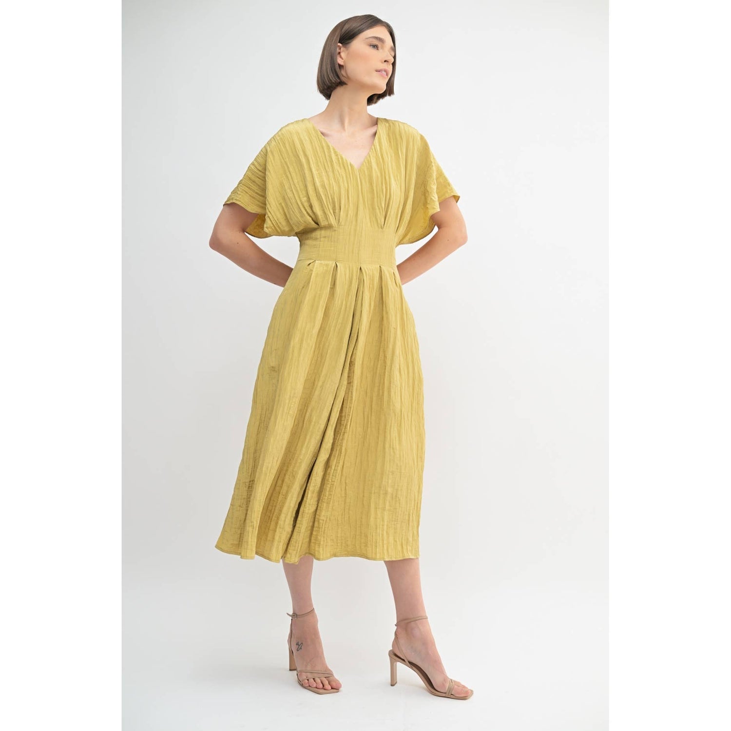 TEXTURE WOVEN V NECK PLEAT DETAIL MIDI DRESS