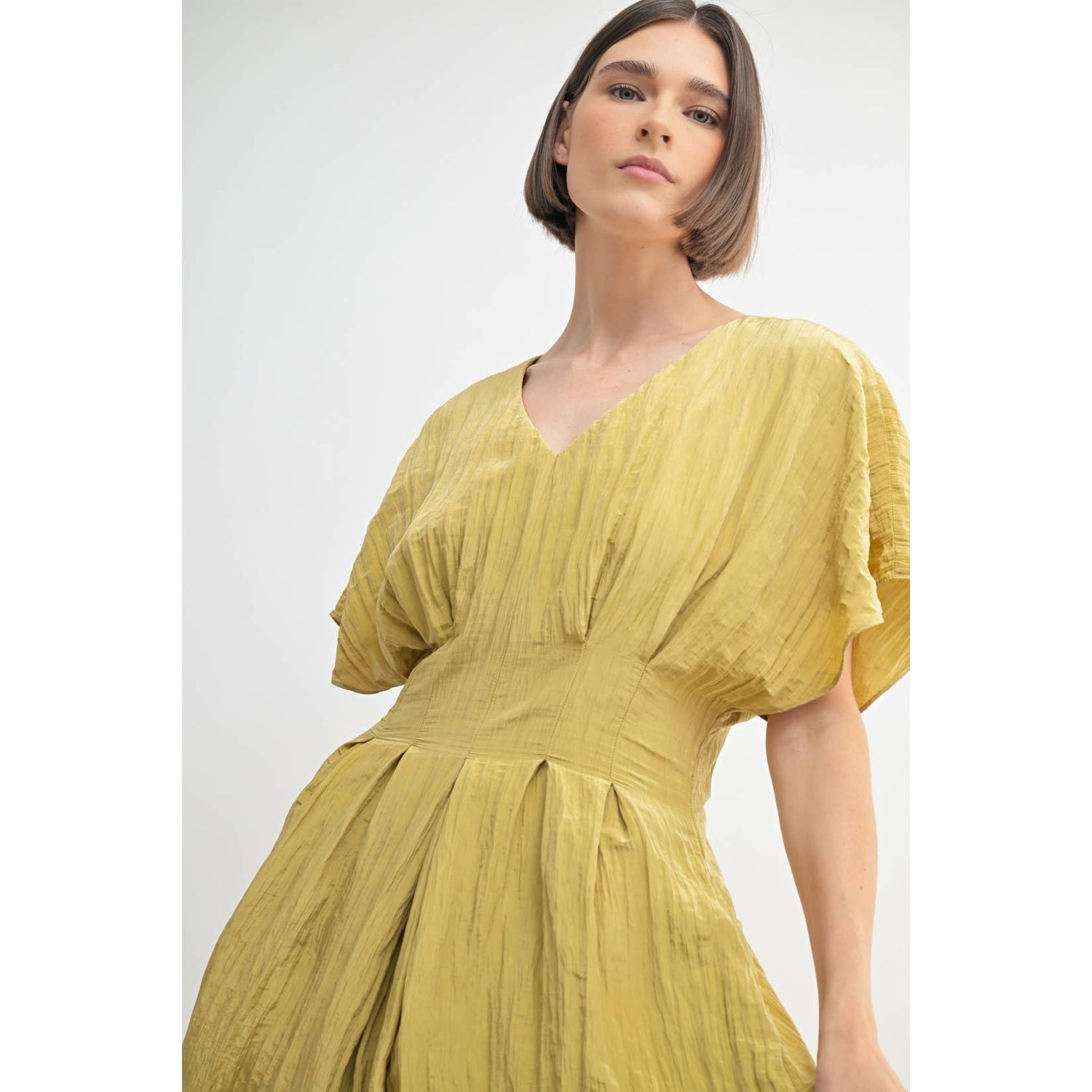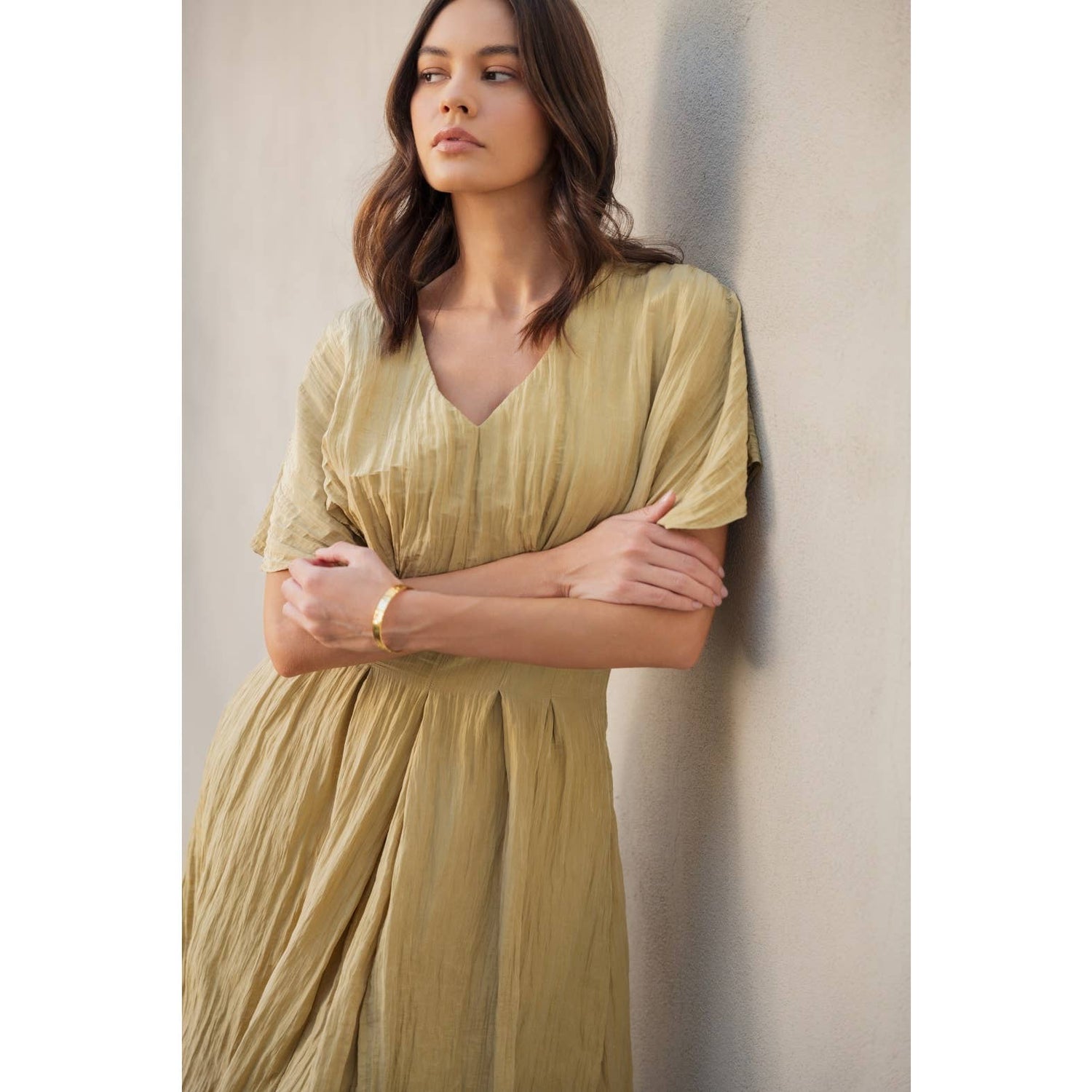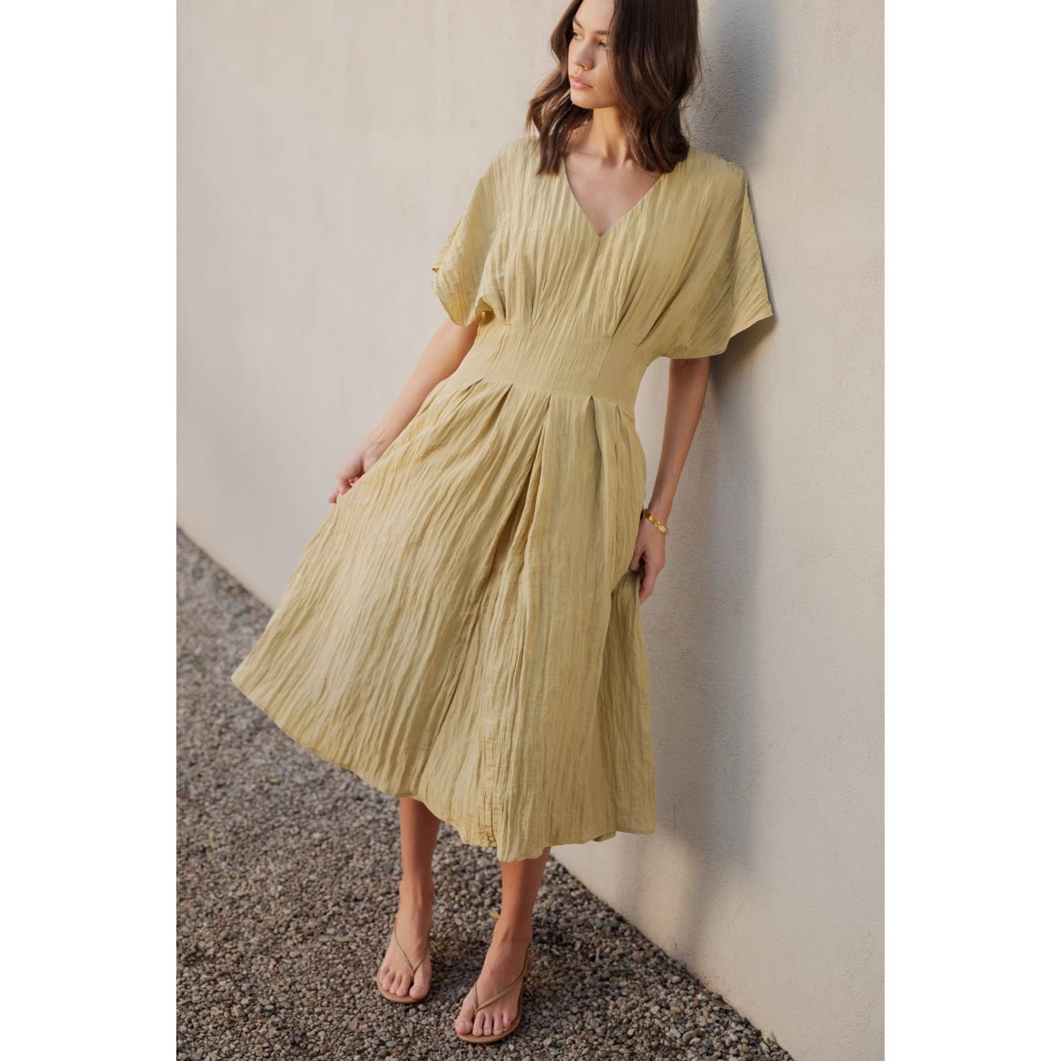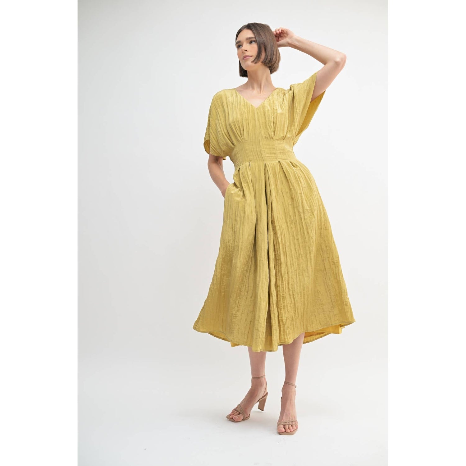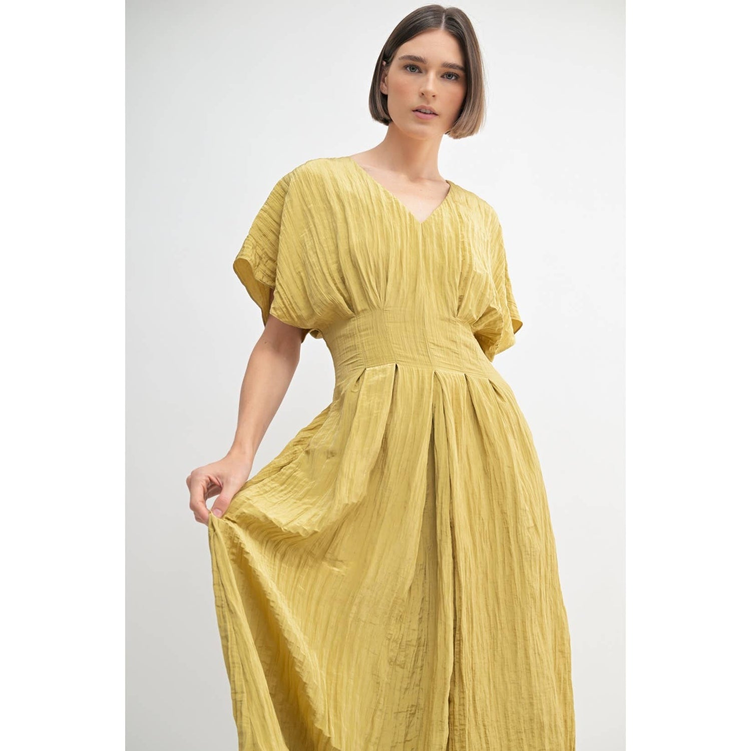 TEXTURE WOVEN V NECK PLEAT DETAIL MIDI DRESS