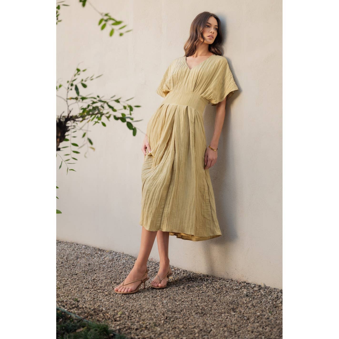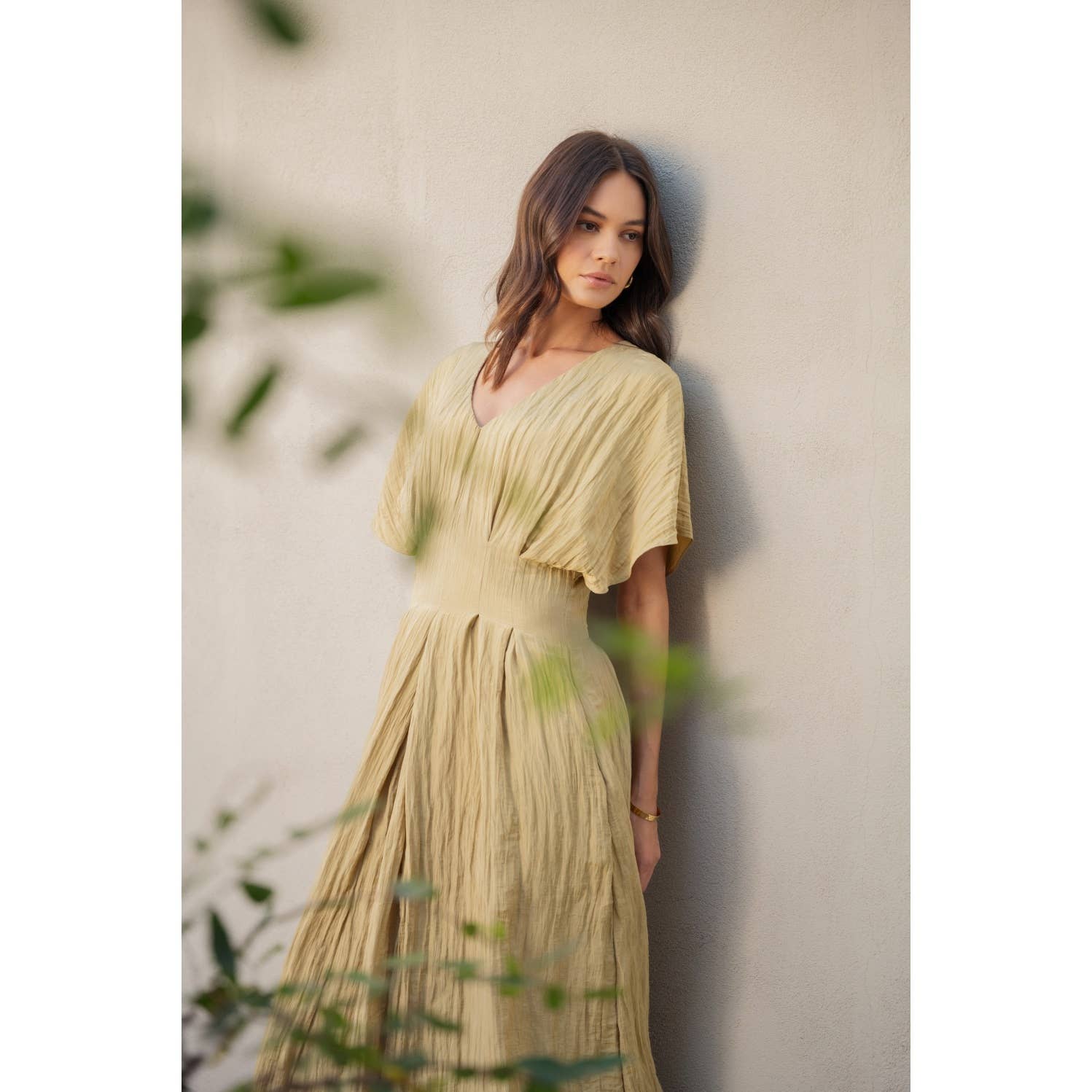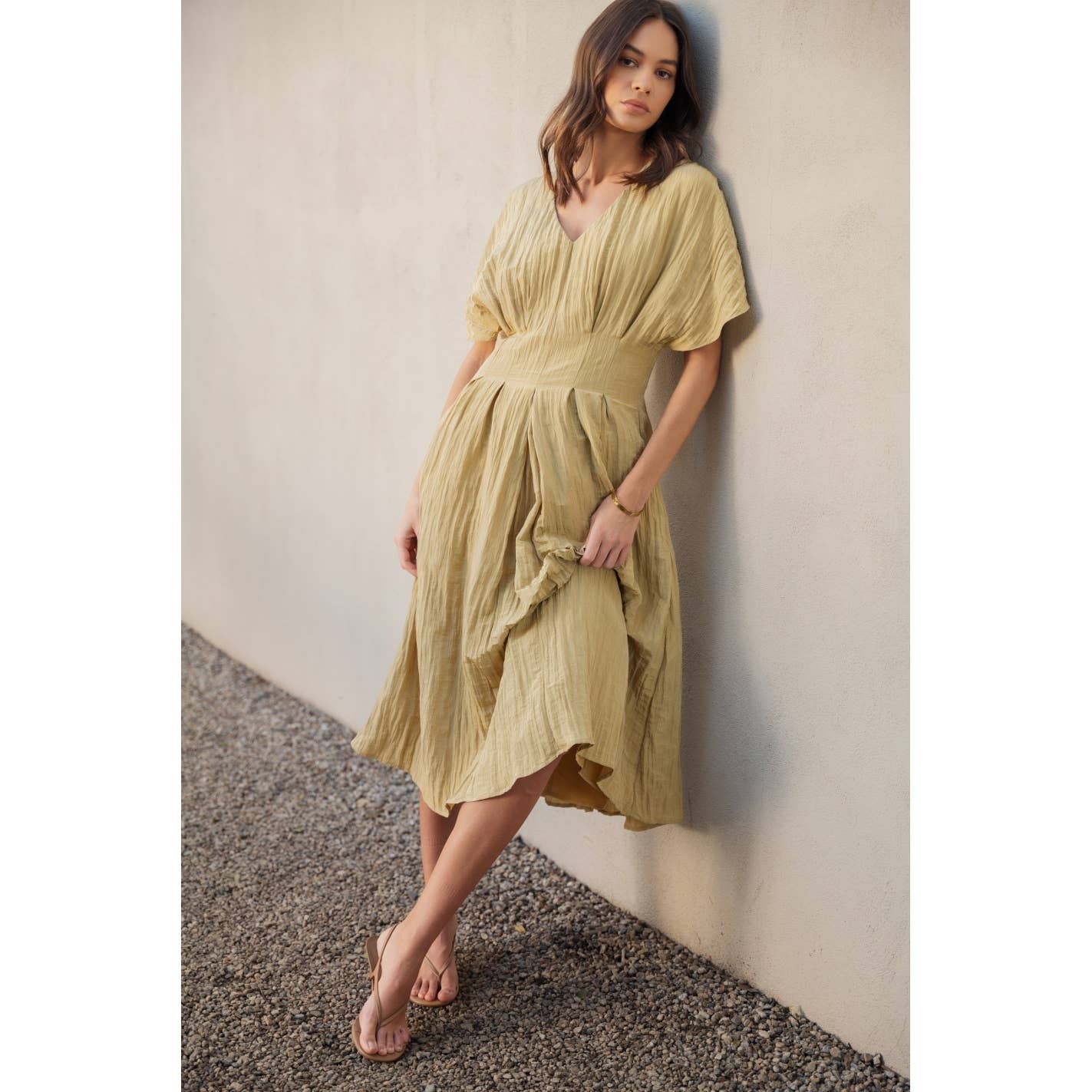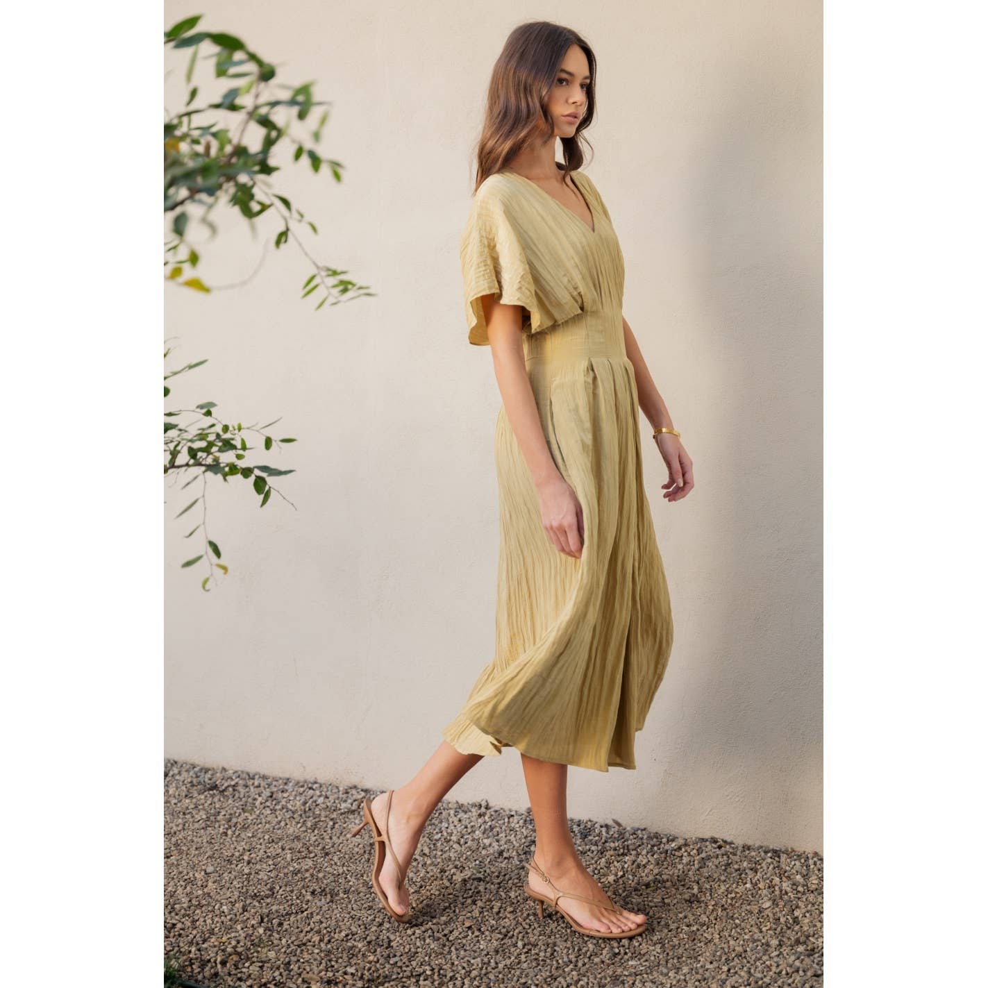TEXTURE WOVEN V NECK PLEAT DETAIL MIDI DRESS
