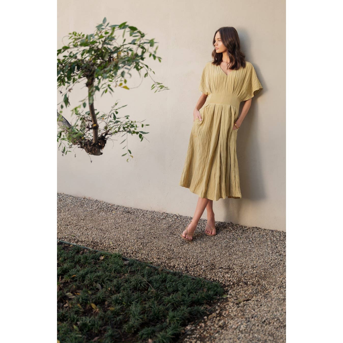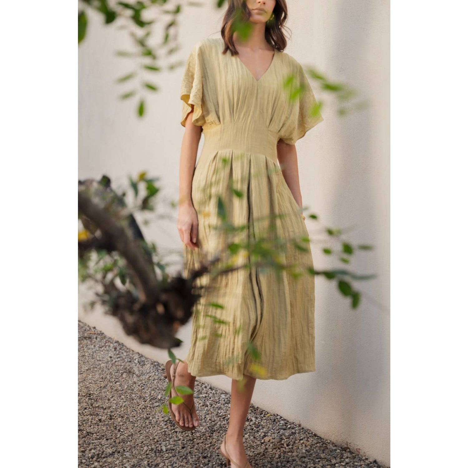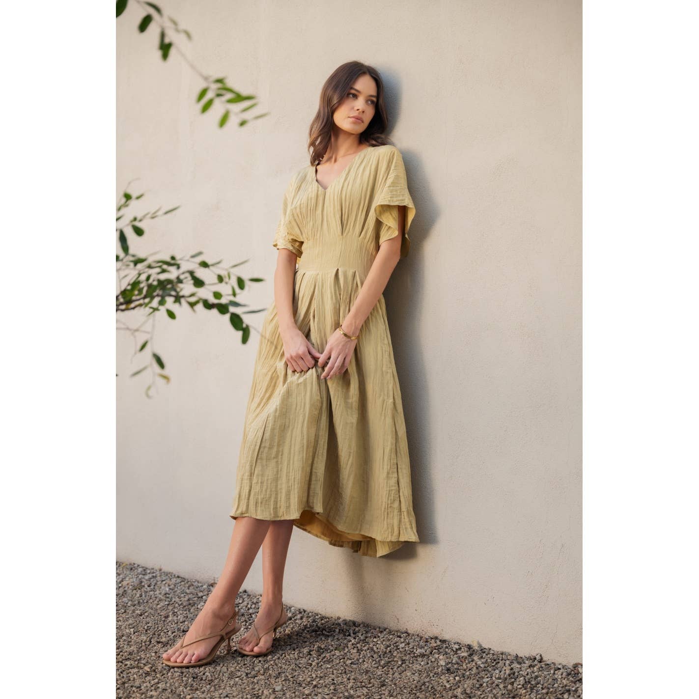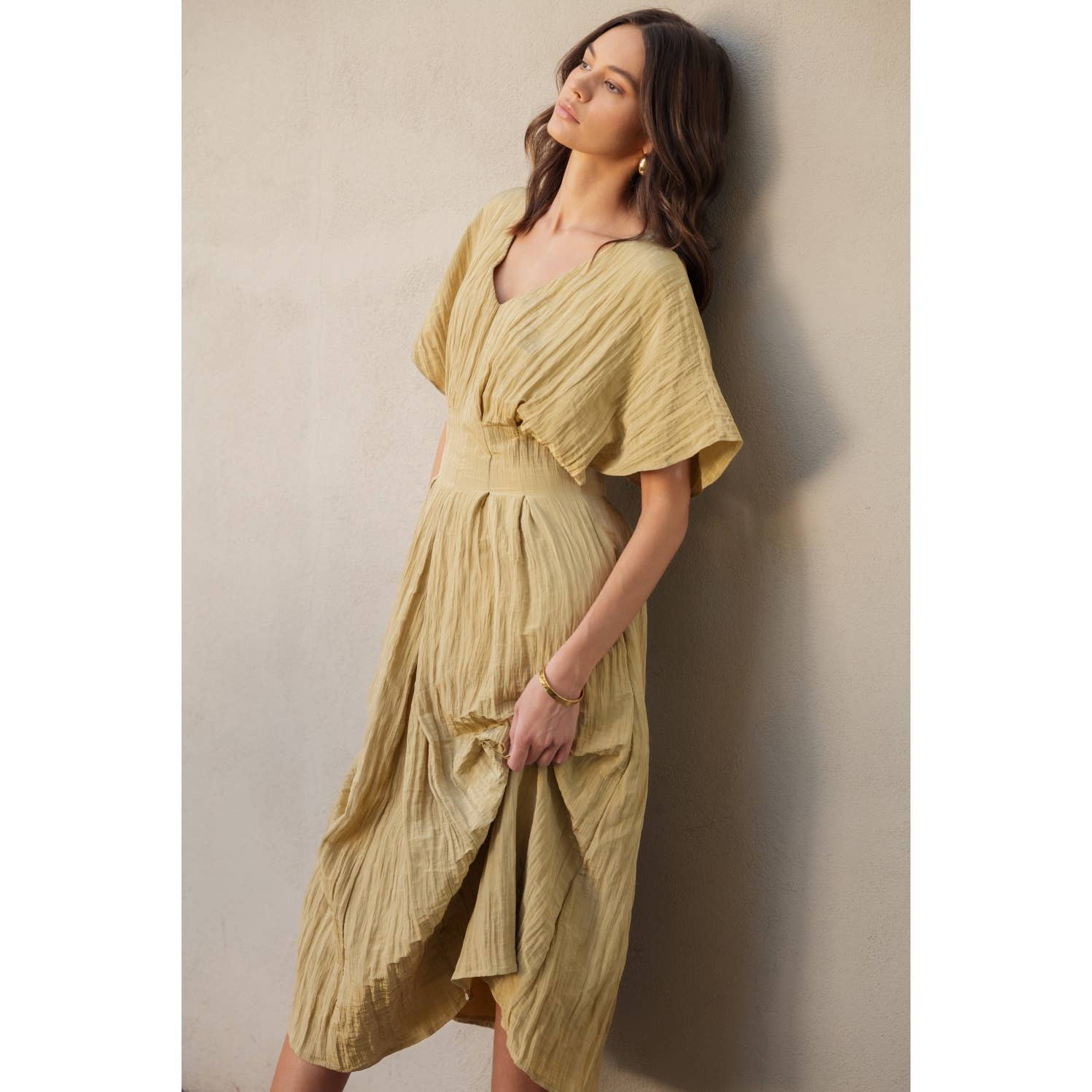 TEXTURE WOVEN V NECK PLEAT DETAIL MIDI DRESS: FAWN / FD67945_1
