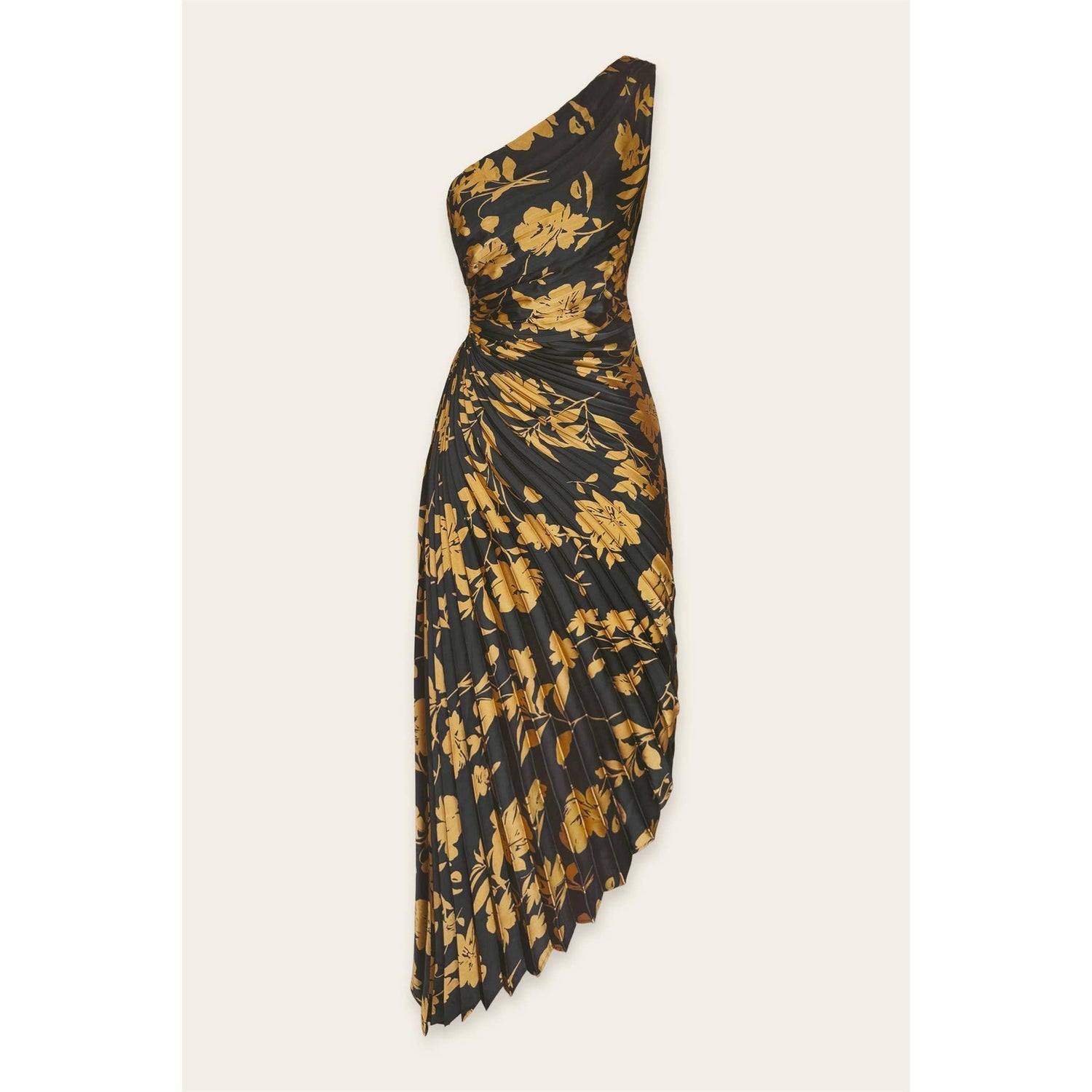 Floral satin pleated maxi dress featuring an asymmetrical design.