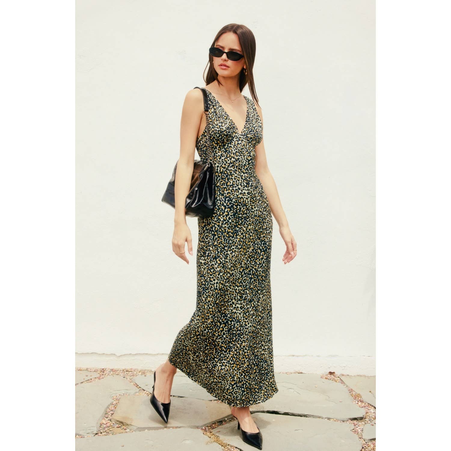 Animal print plunging neck maxi dress. Model is 5'9" and wearing size Small.